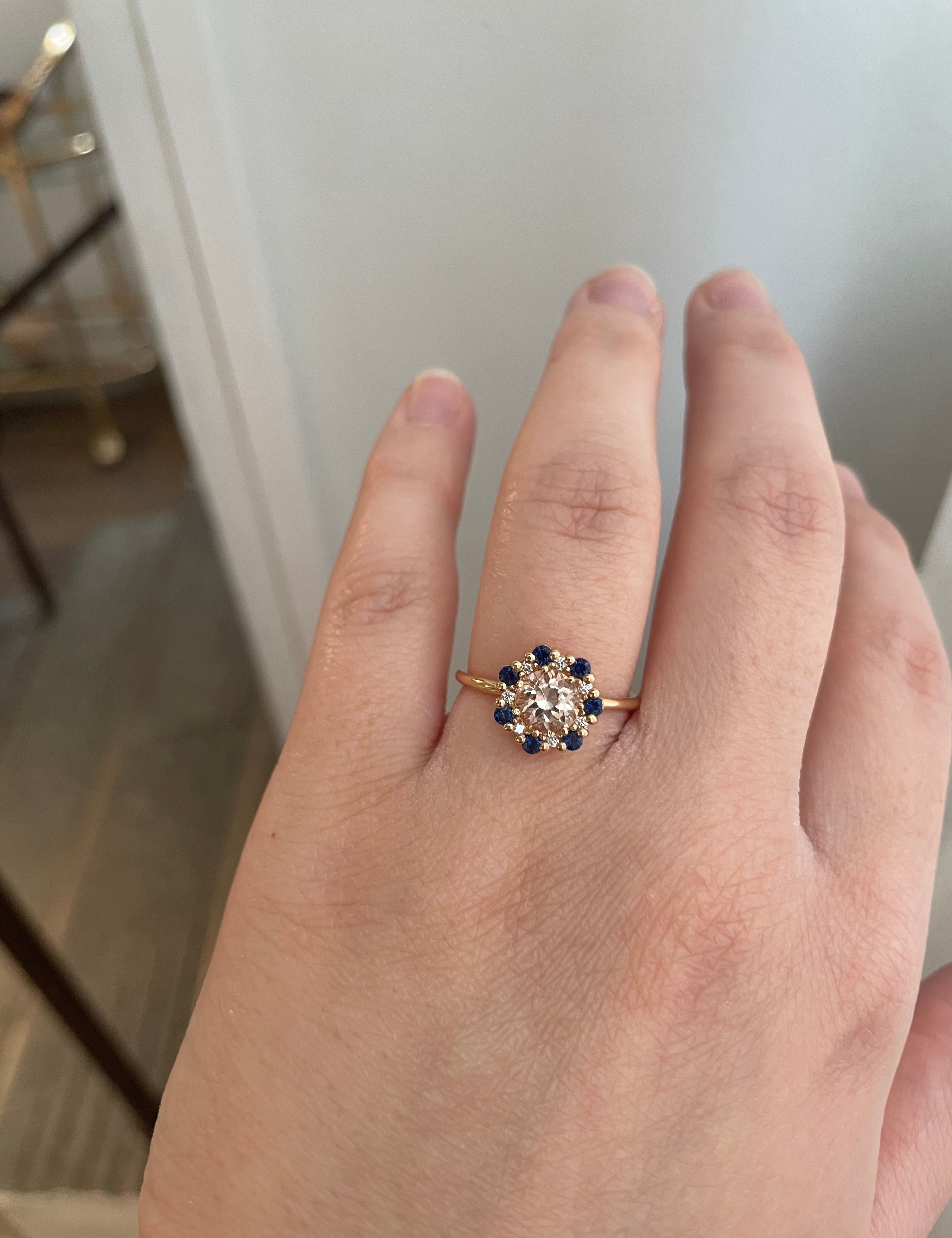 Finished: 24 Hour Auction! One-Of-A-Kind Flower Ring with Champagne Morganite and a halo of Dark Blue Sapphires and Diamonds (1.48 CT)