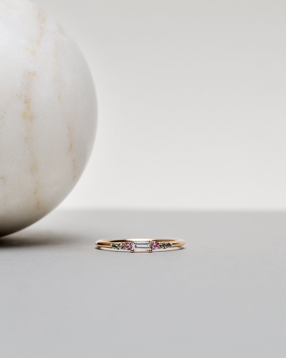 Finished: Mini Baguette Brilliant Diamond Cluster Ring with a Baguette Diamond and Light Pink Sapphires