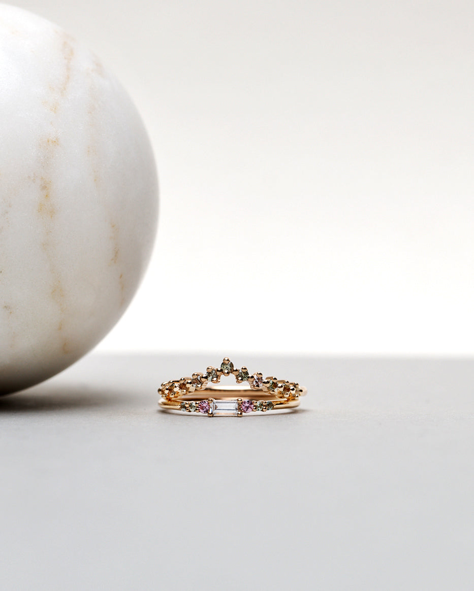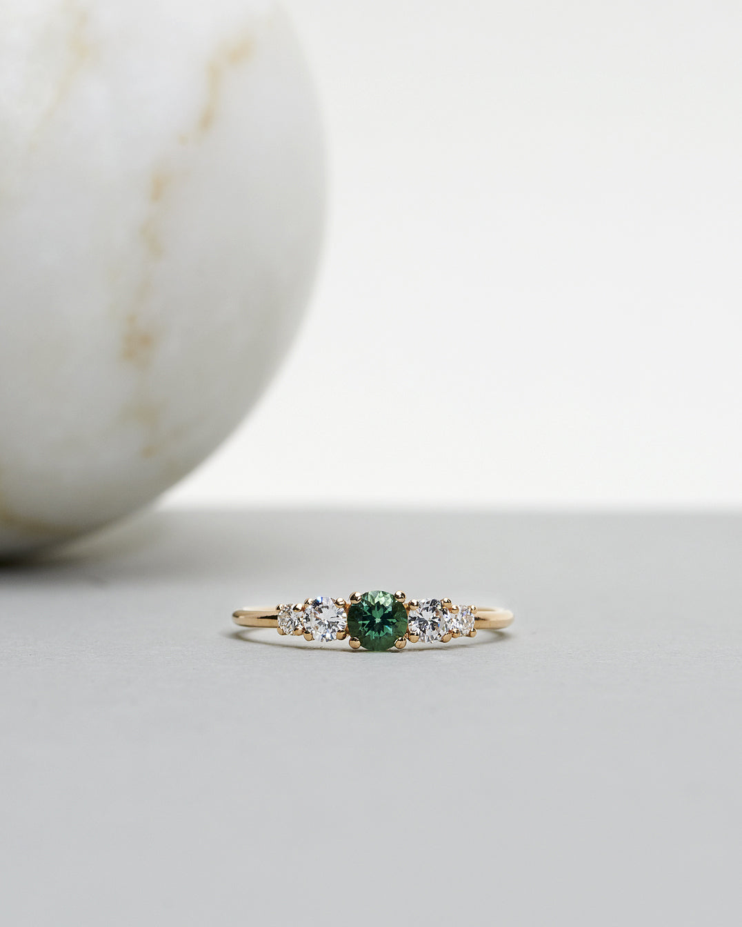 Finished: Mini Elise Ring with Diamond and Olive Green Sapphires