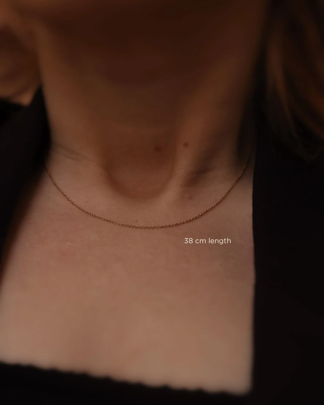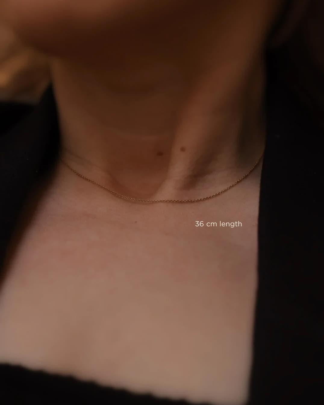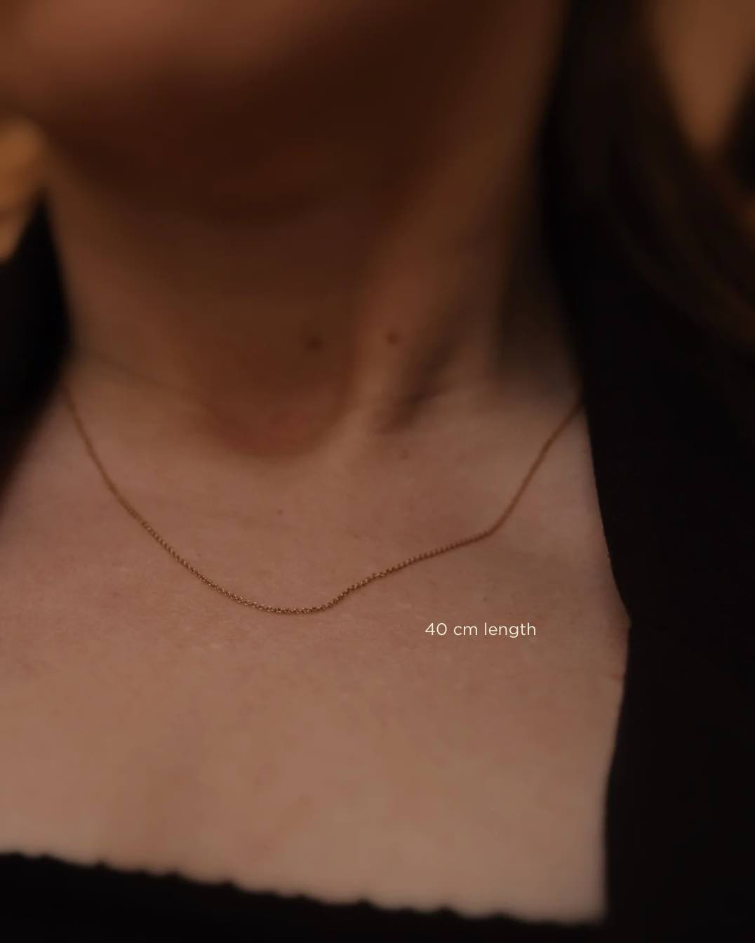 Below you see Helena in our 1 mm bare gold chain, which is the minimalistic chain we use in most of our short necklaces.