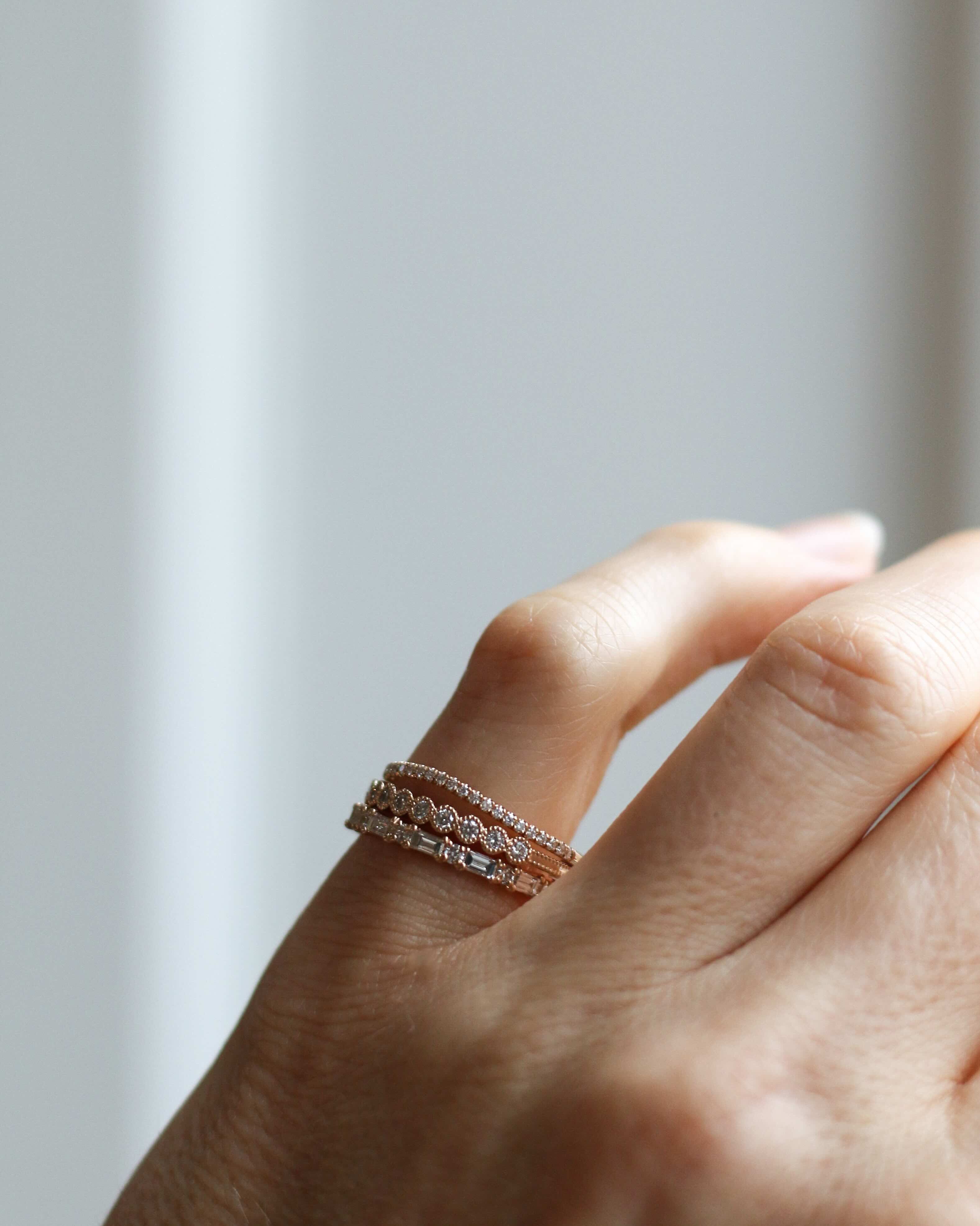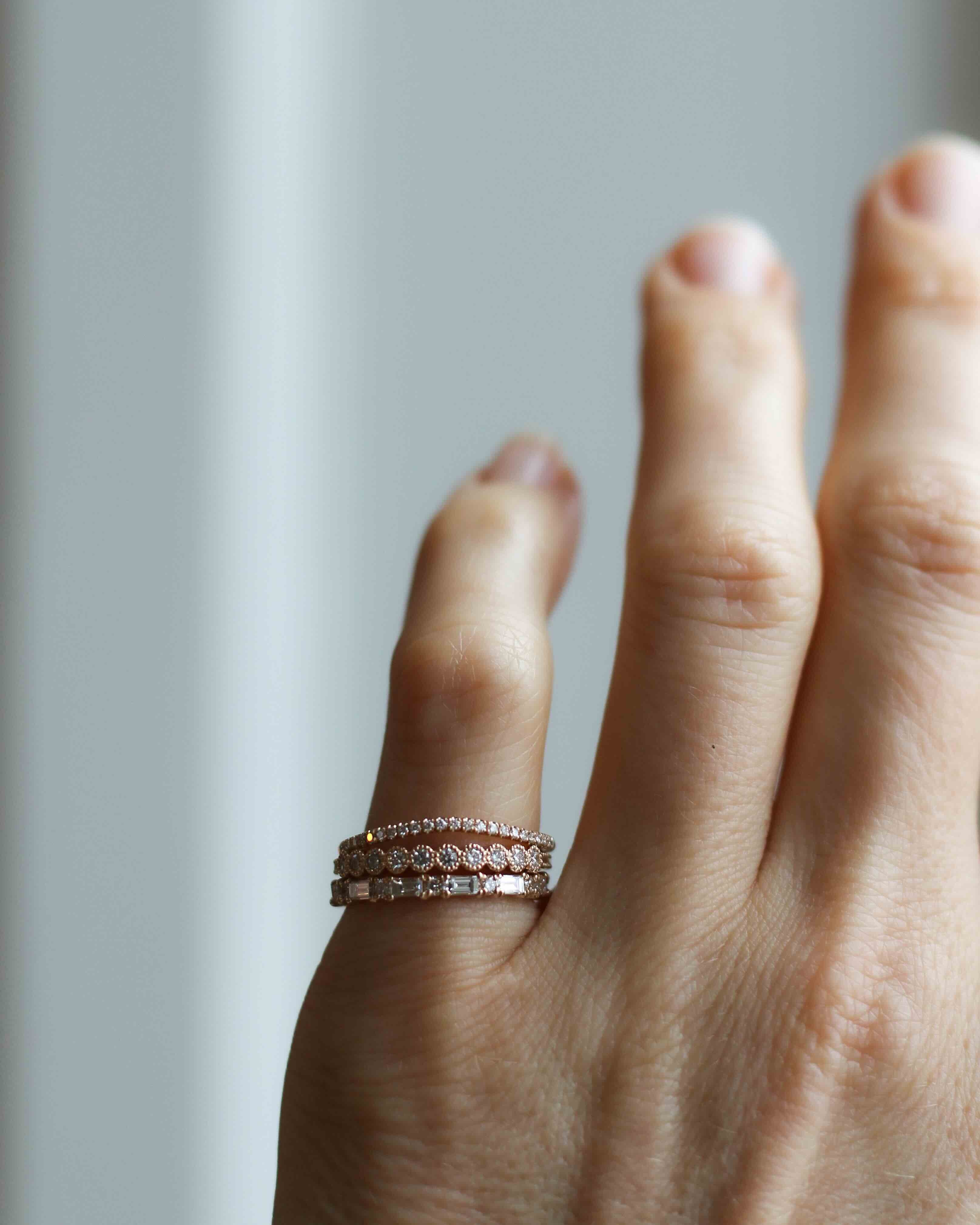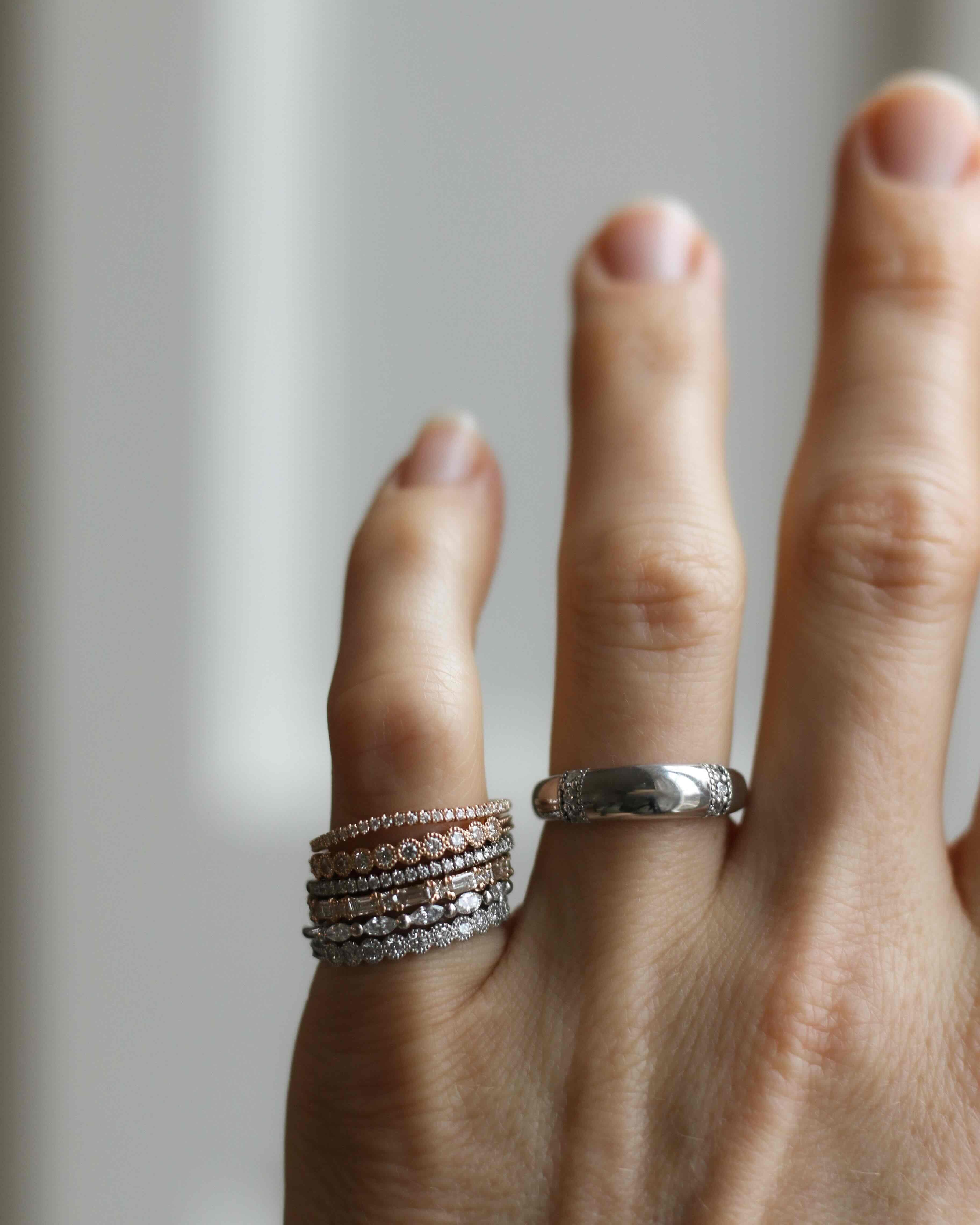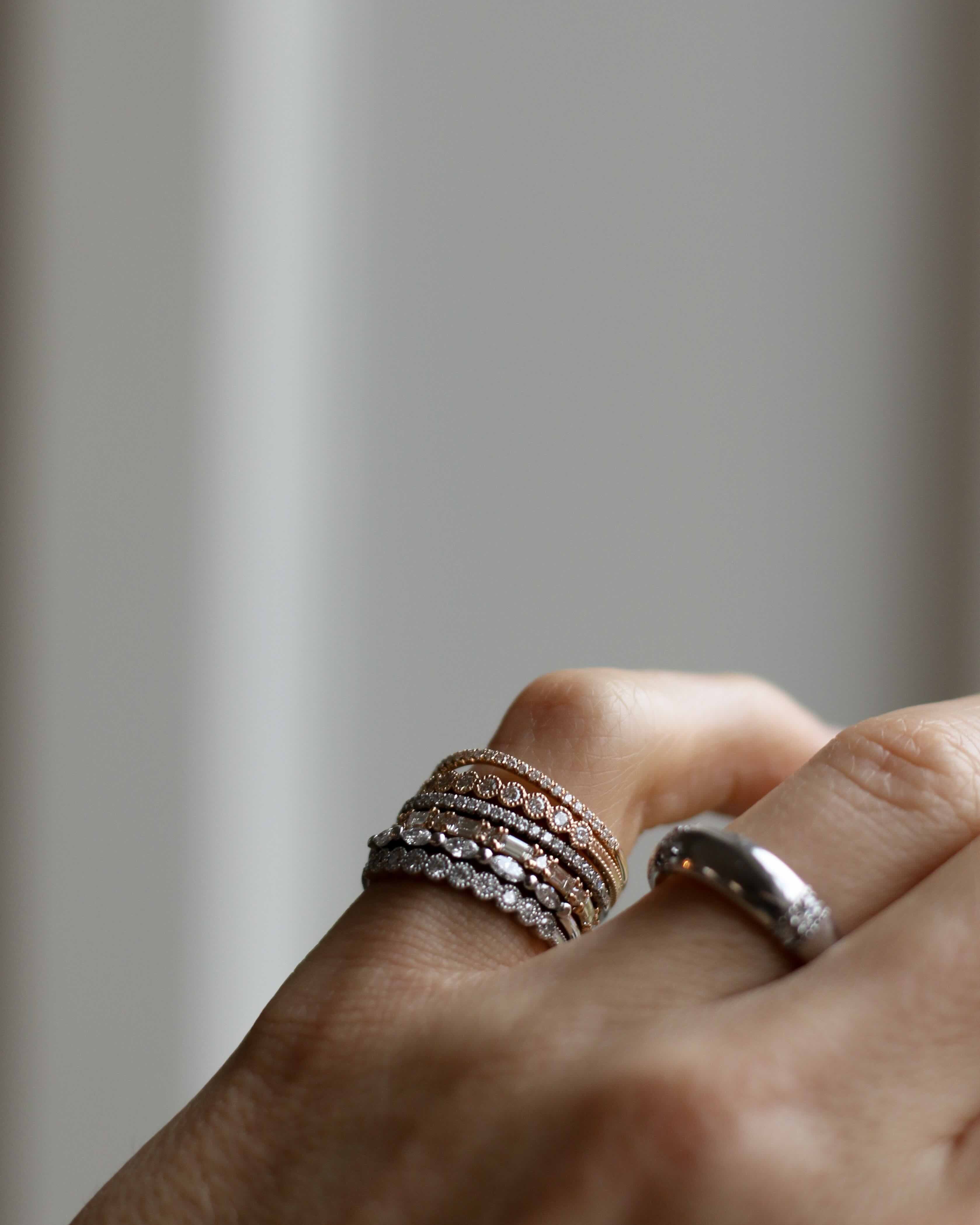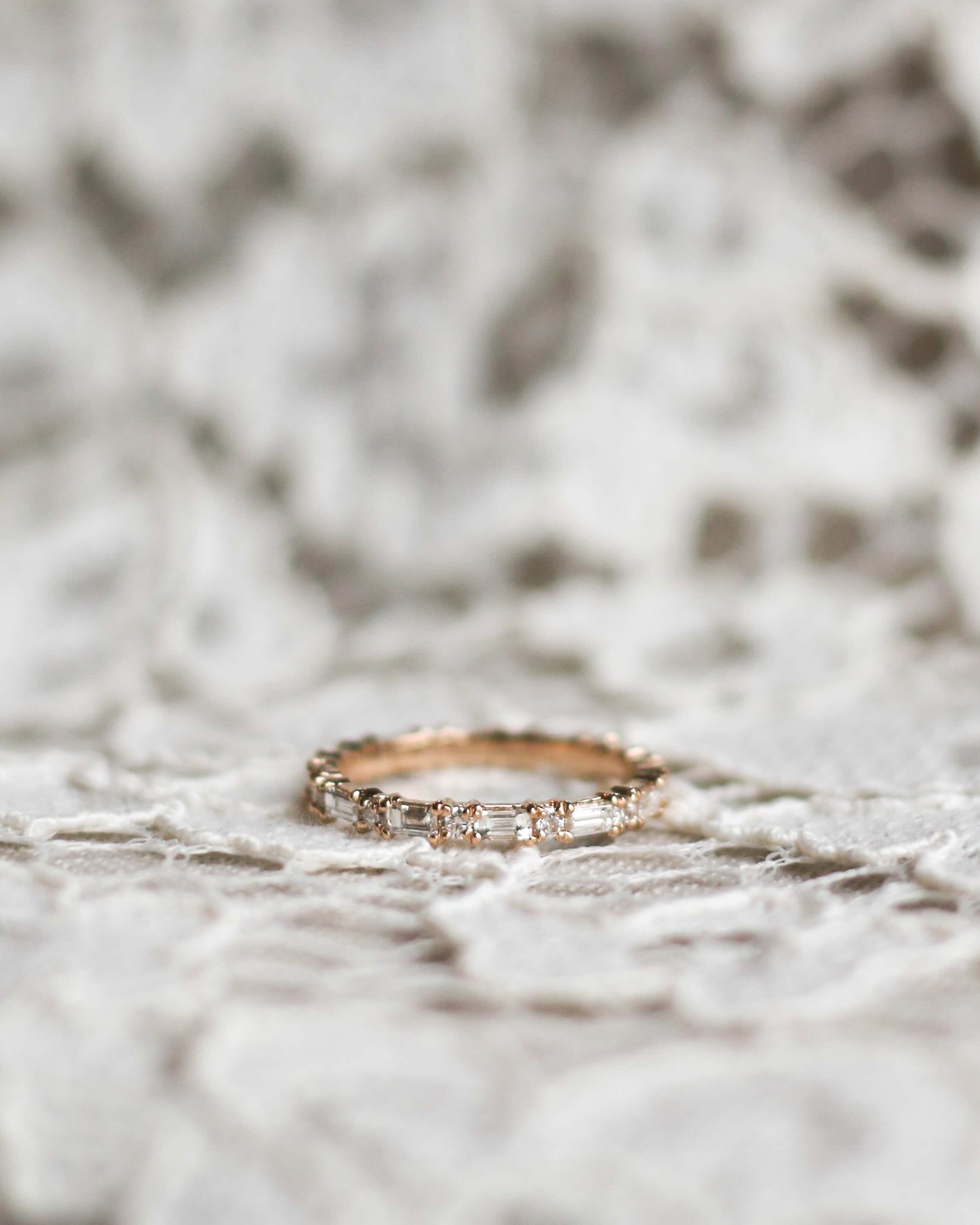 Amelia kom till oss och ville ha en unik men ändå minimalistisk vigselring. Hon sökte en tuffare känsla med en kontrast mellan mjukt och hårt - så tillsammans bestämde vi oss för en alliansring med alternerande briljantslipade (runda) och baguetteslipade (rektangulära) diamanter. Jag älskar den! Jag har längtat efter att få formge en och lägga i kollektionen, och Amelia gav mig anledningen att skapa den första. Nu vill jag ha min egen! Xx Cecilia