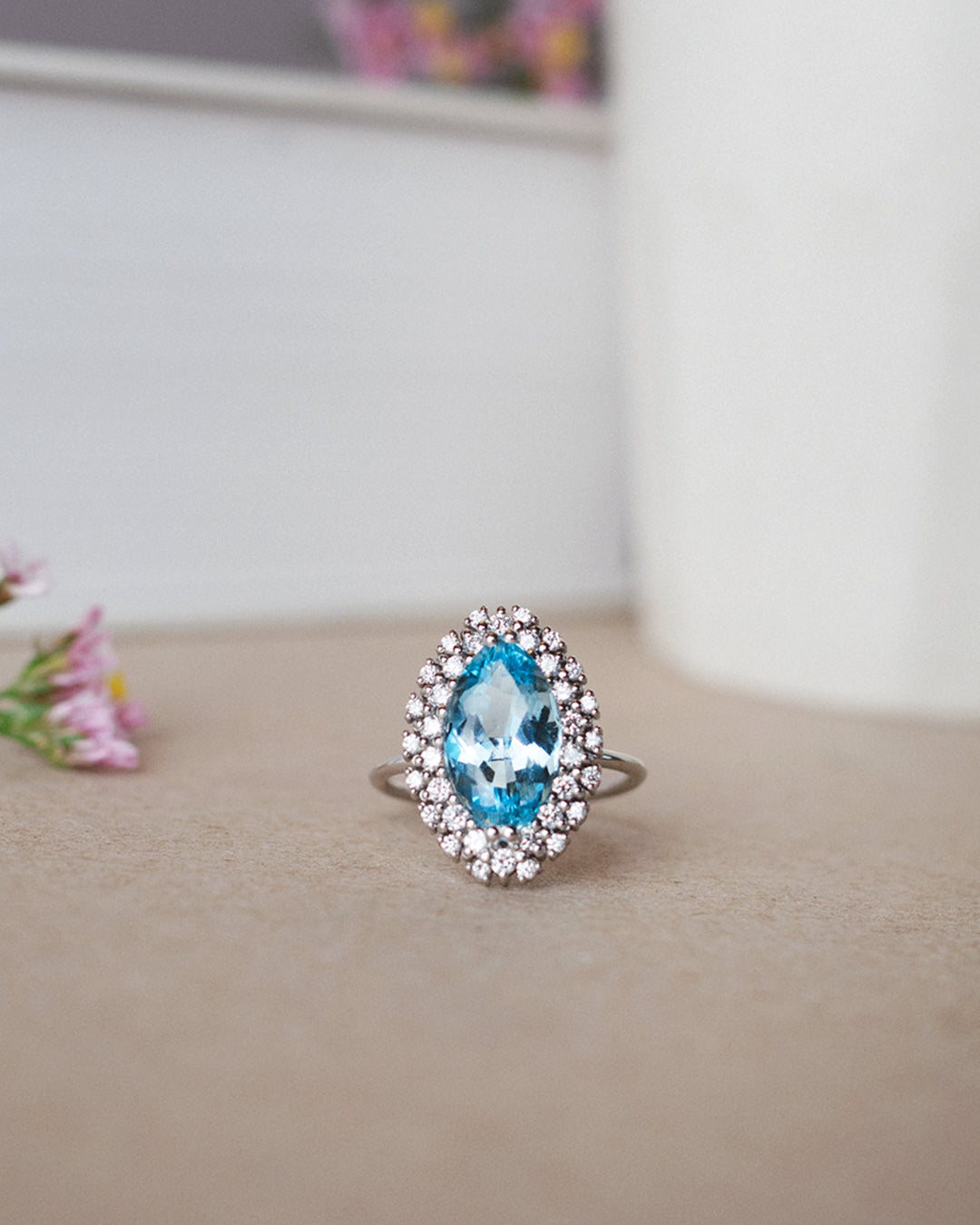 She had a beautiful, almost turquoise blue Aquamarine set in an old gold ring that she truly disliked. She handed it in to us* with the idea of maybe letting us creating a bracelet from it. But eventually, Fanny helped her create a beautiful replica of one of Cecilia's own rings (this one)!