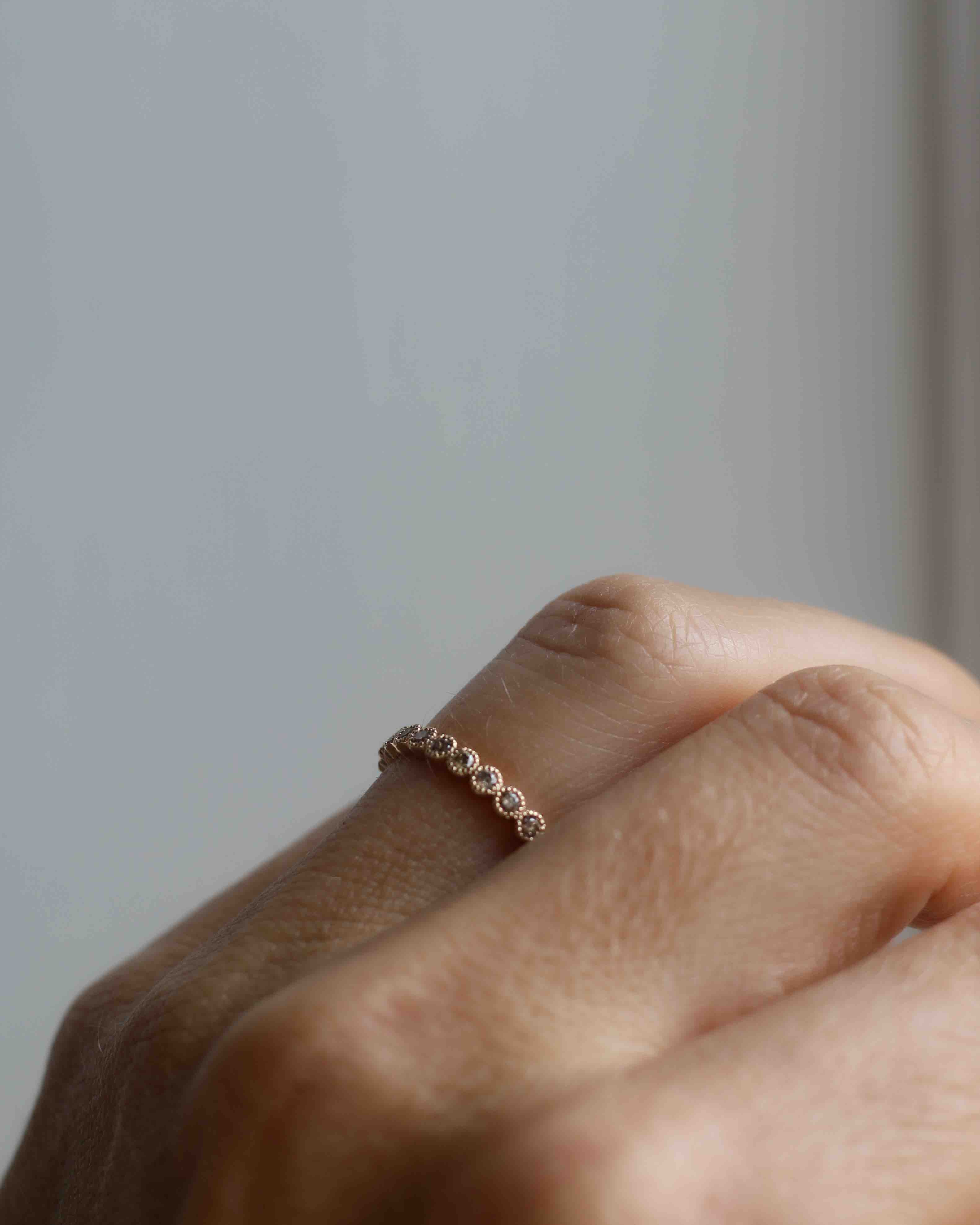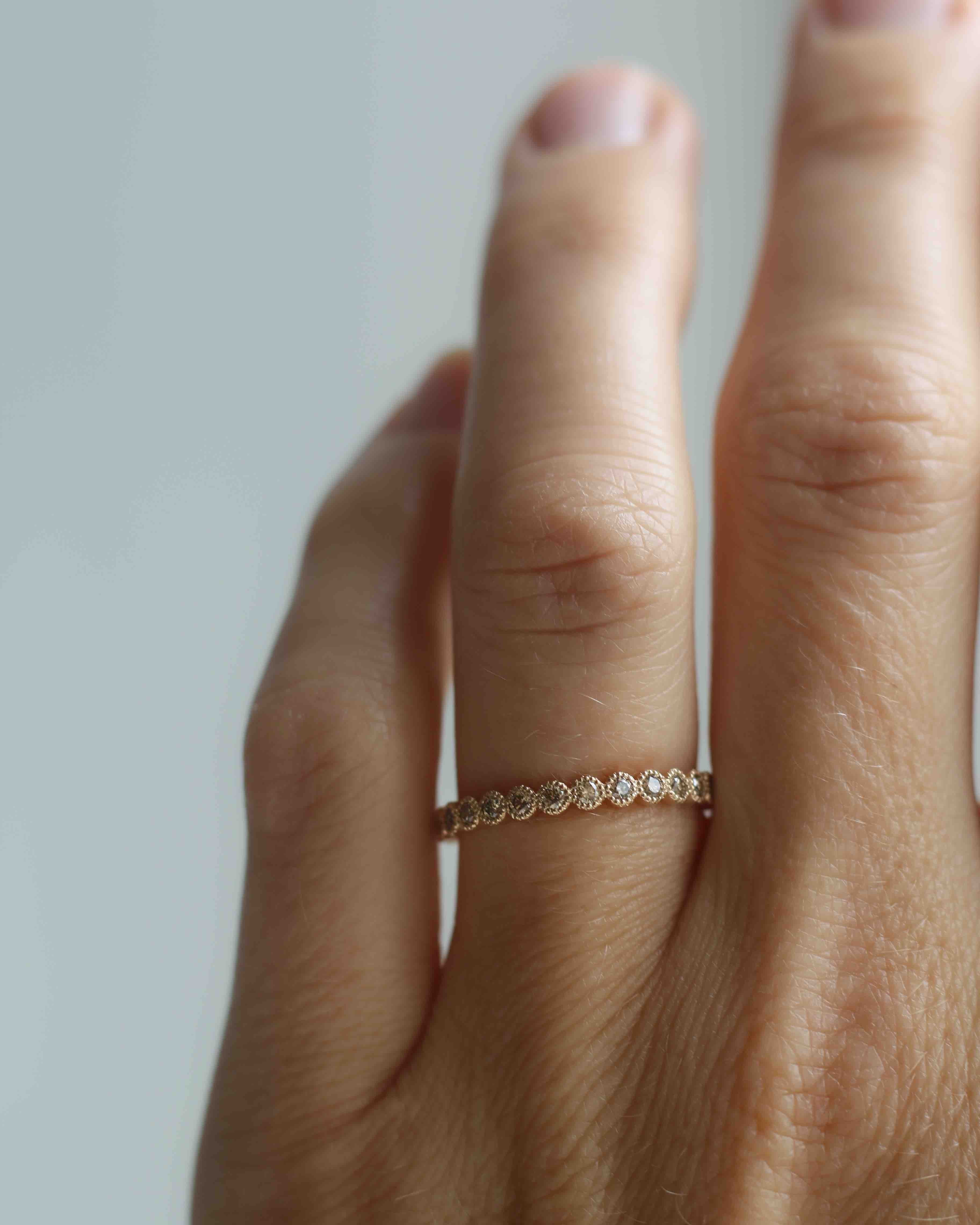 Astrid är ett evighetsband med ett unik skimmer, tack vare de små guldprickarna, milligriffen. Milligriff var en vanlig dekor på smycken i början av förra sekelskiftet (18/1900).