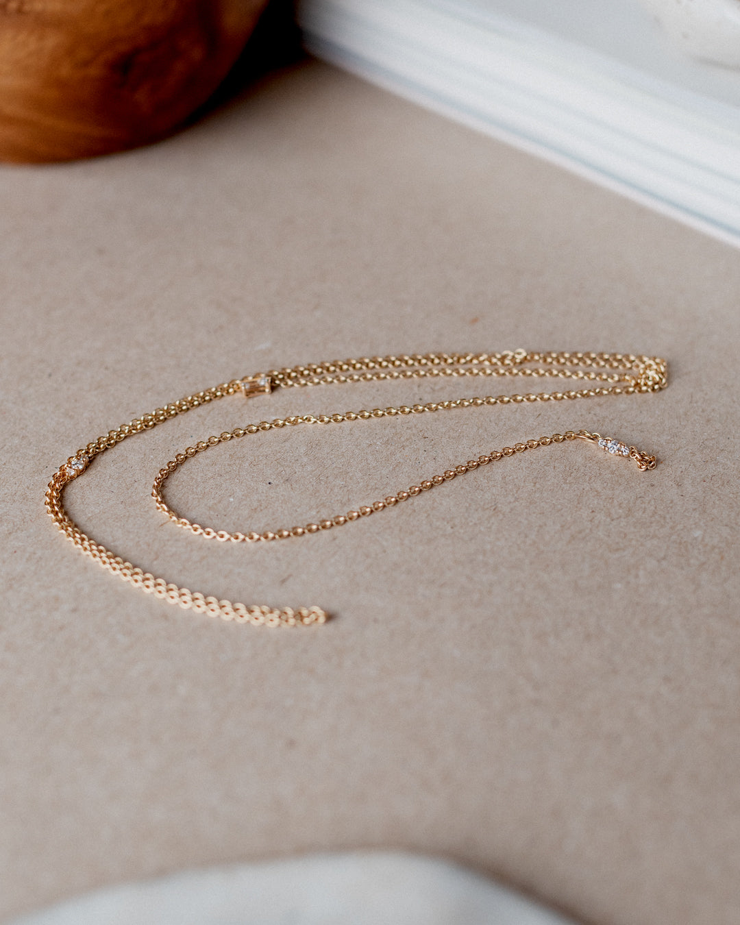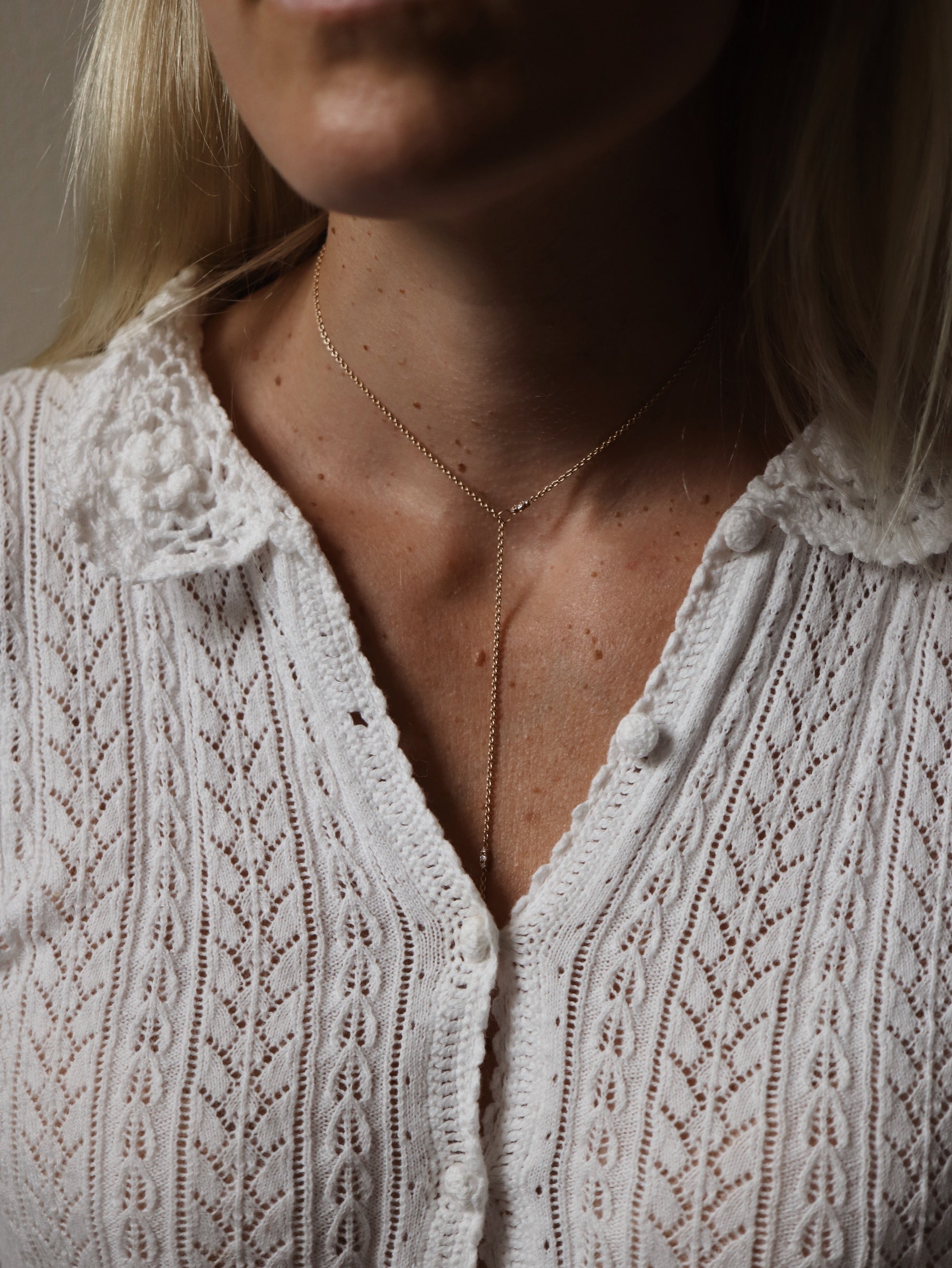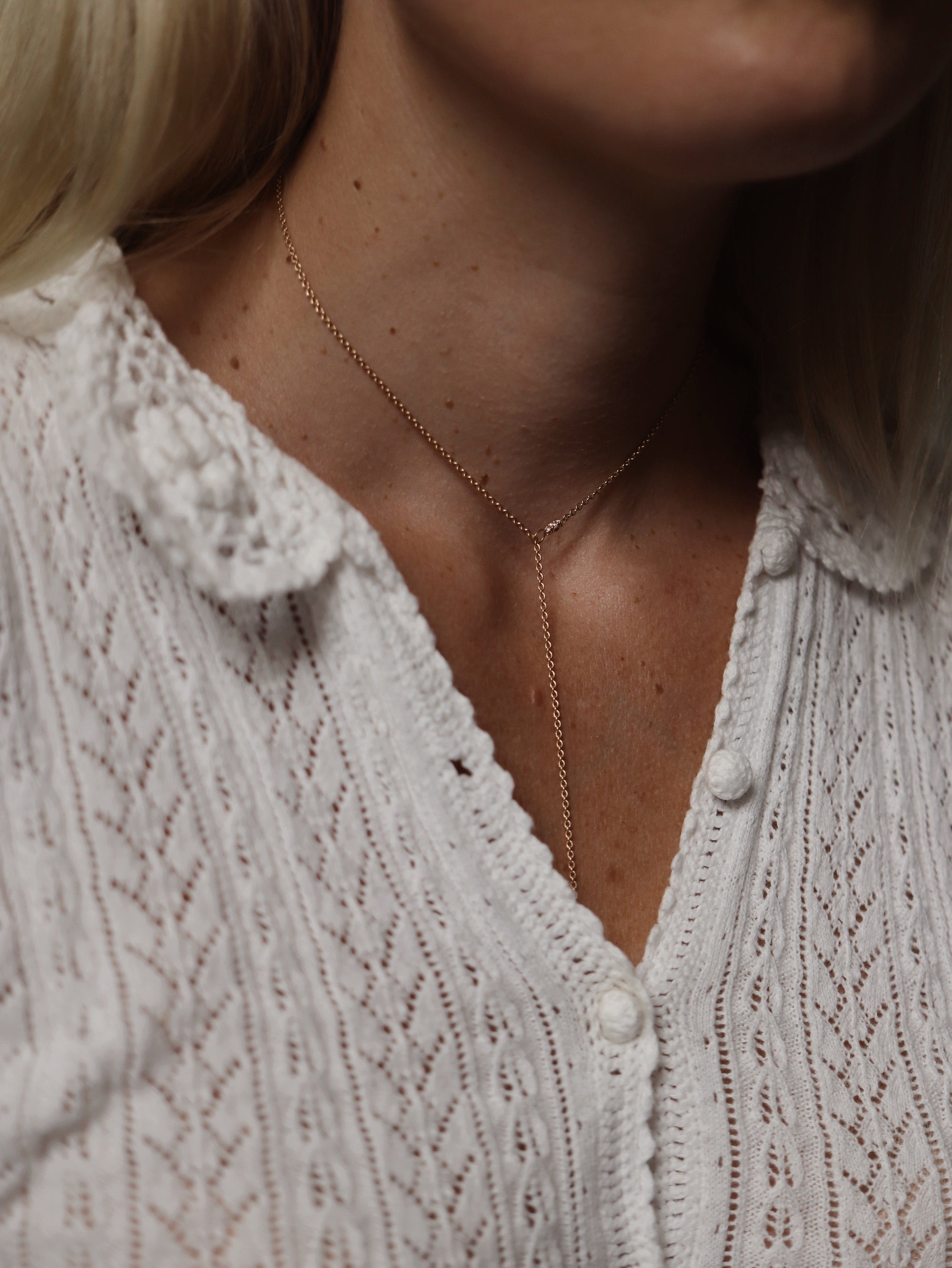 This necklace is cleverly constructed without a lock, to perfectly fit the minimalistic design. Instead, the chain is threaded through a small hoop and held in place by the small diamonds set along the chain.
