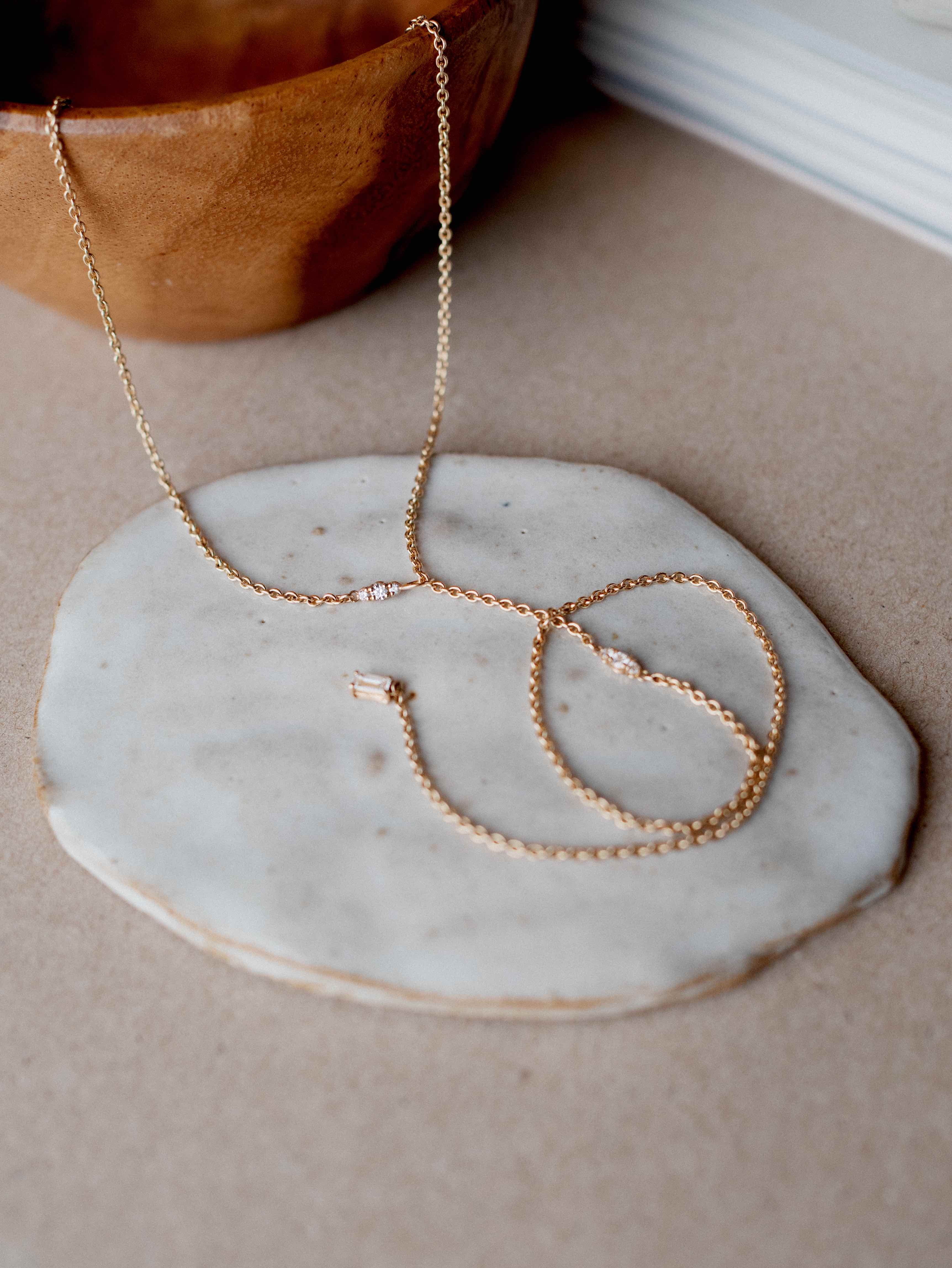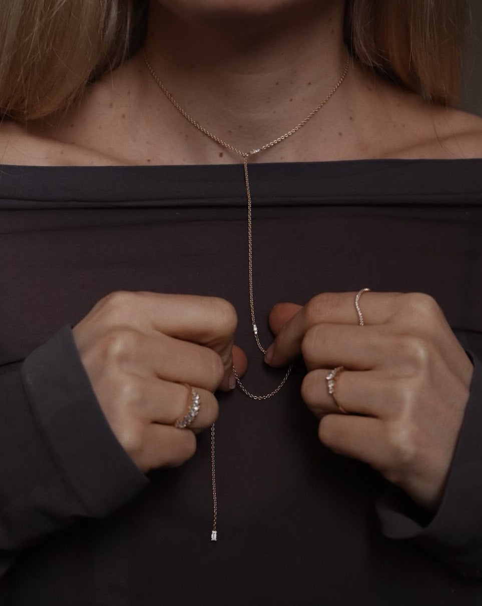 The small brilliant diamonds are spread out along the chain, creating a subtle sparkle around your neck. The baguette diamond hangs freely at the end of the chain, to be worn on the outside or inside of your clothes.