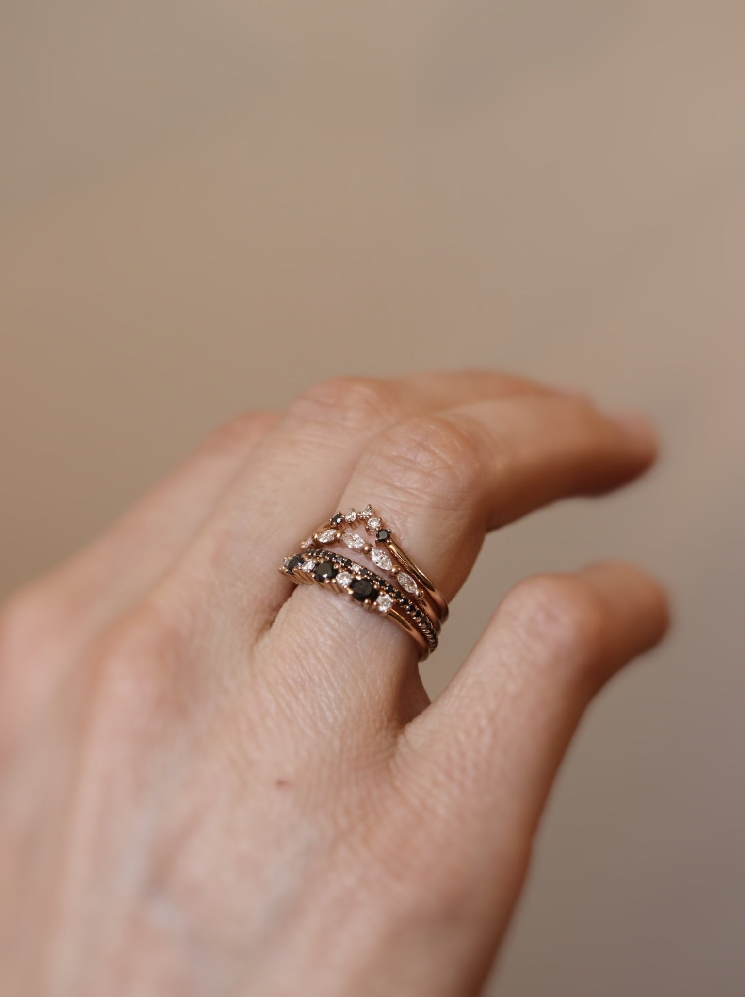 Many women choose between the Edith Ring and the Brigitte Ring. Our recommendation is to consider how you want to stack your ring in the future. Edith Ring can only be stacked with curved bands, while Brigitte Ring can be stacked with most other rings including eternity bands, solitaires, curved bands etc.