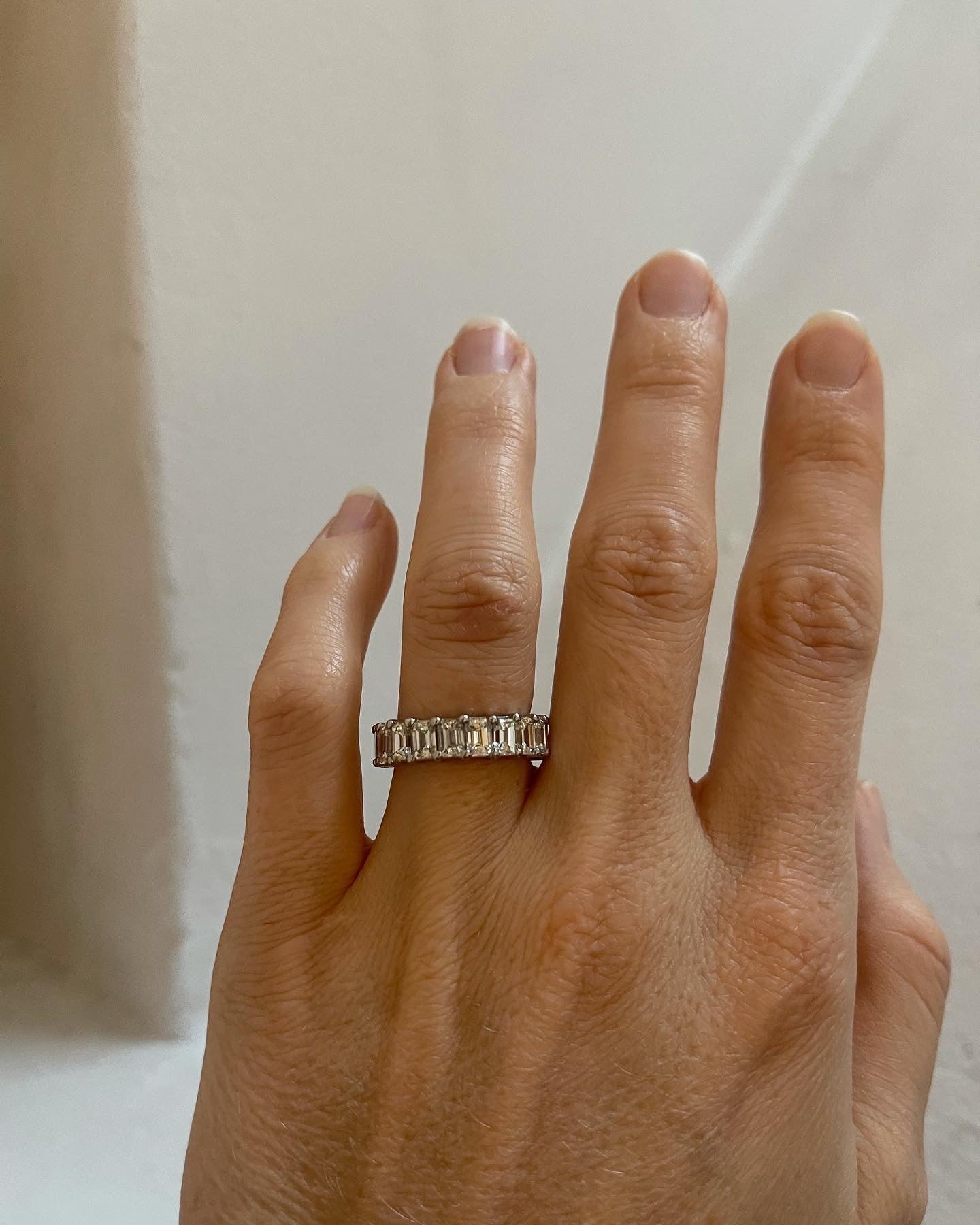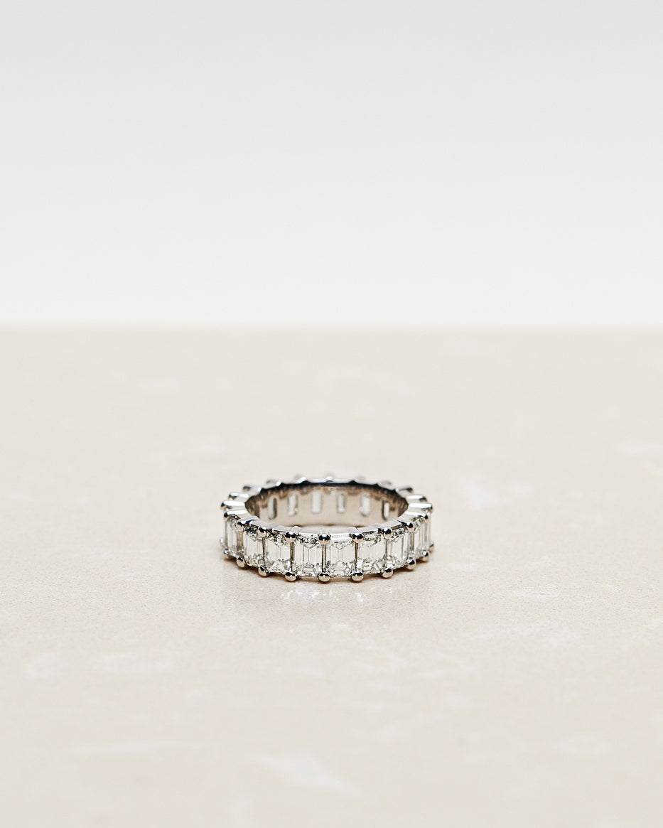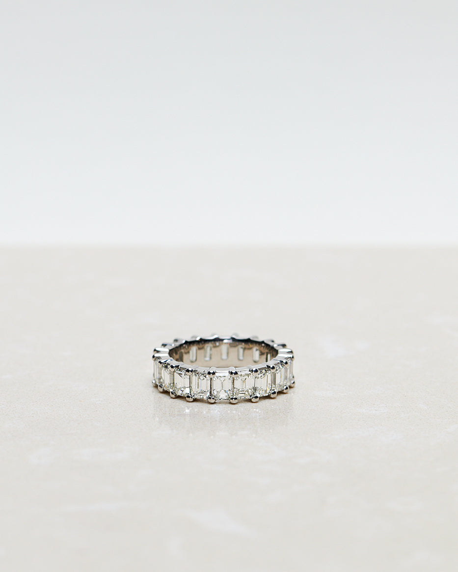 The classic emerald-cut diamond eternity band looks amazing worn as a single ring or next to a diamond solitaire.