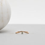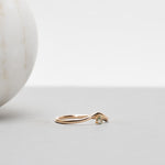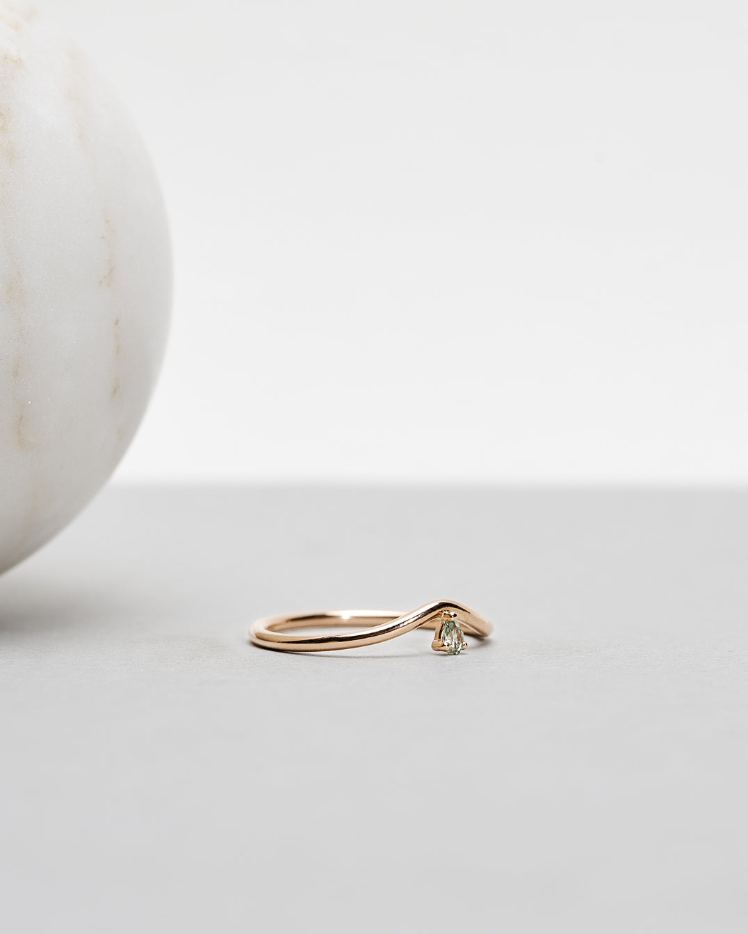 The Lily Fallen Drop Ring is a unique design with a gemstone in the shape of a drop. In this rose gold version of the ring we've used a rare olive green sapphire drop that "falls" from the top.