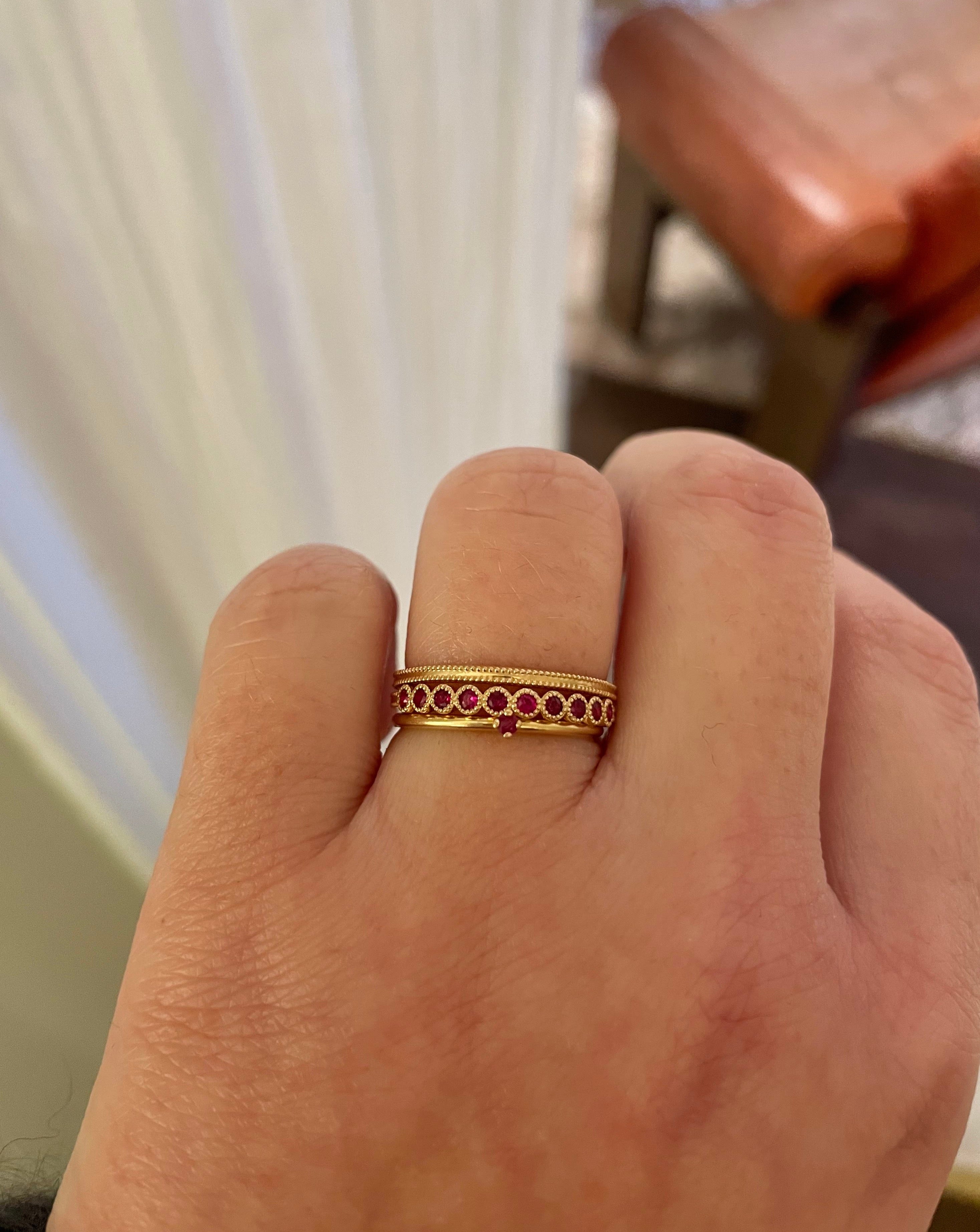 This ring was purchased by a mumbaistockholm girl in December 2021 and is now ready to find a new home. The ring has been well taken cared of and is in great condition, with only some slight scratches in the gold from normal wear that can be polished out in the studio at an additional cost (polish is included with a size adjustment). The ruby shows no signs of damage.