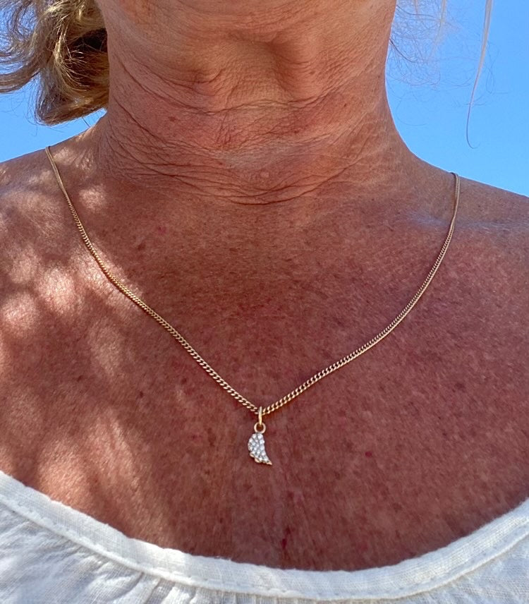 Estrids ängelvinge skapades första gången som ett mamma-mormor-dotter-smycke över tre generationer, i form av denna berlocken (buren av mormorn) och detta tennisarmbandet (buren av mamman). En av bilderna här visar hur mormor bär halsbandet ❥ (kedjan är hennes egna som hon redan hade hemma.)