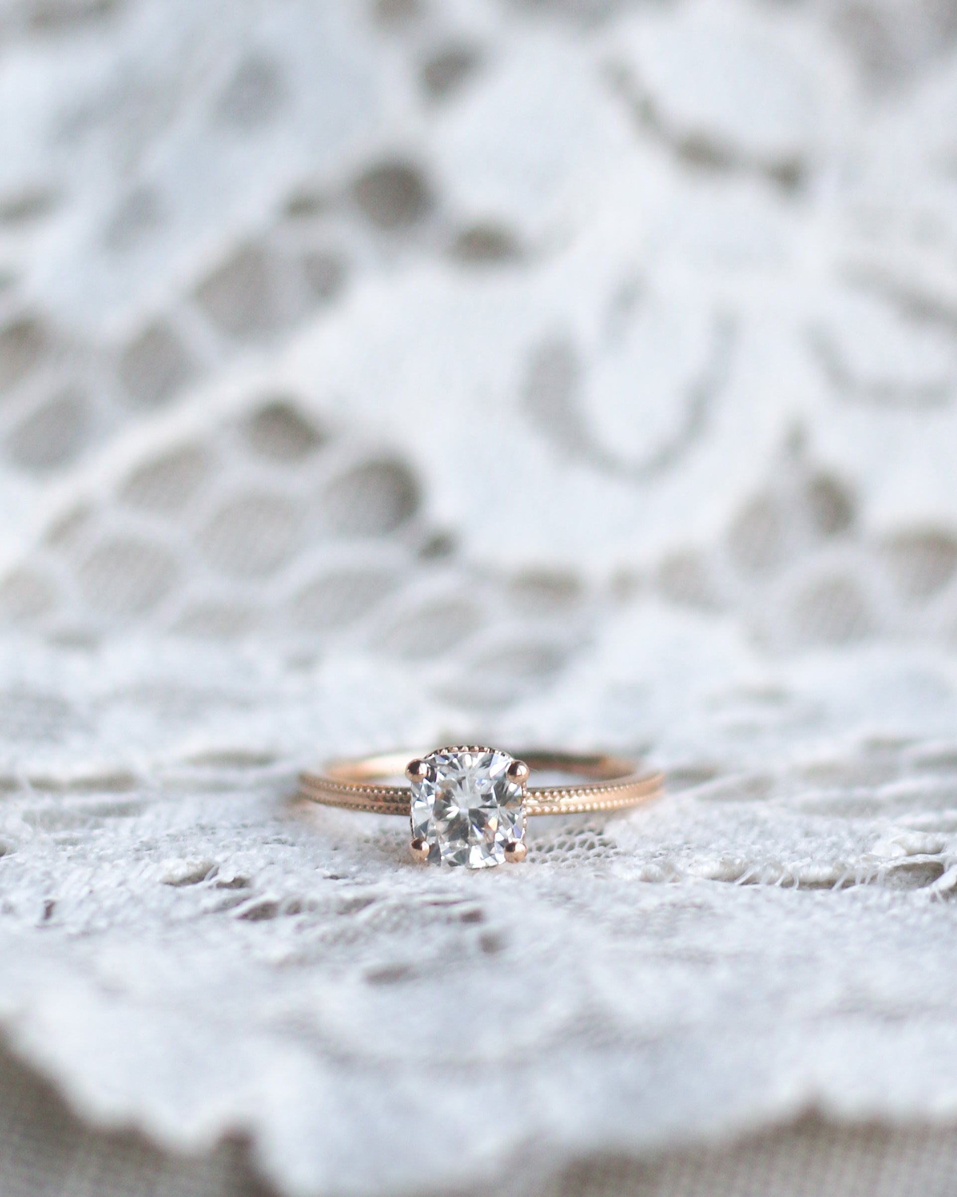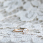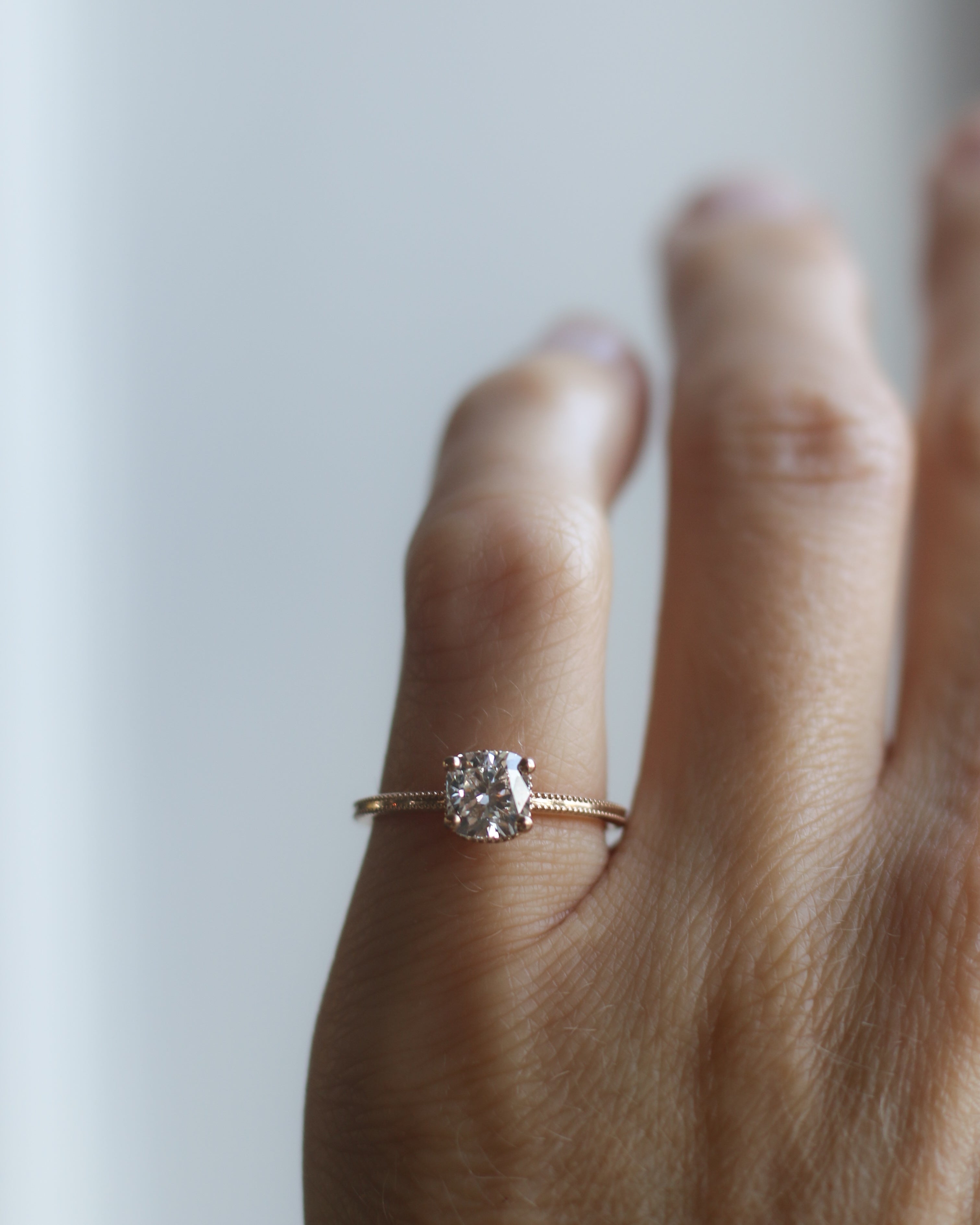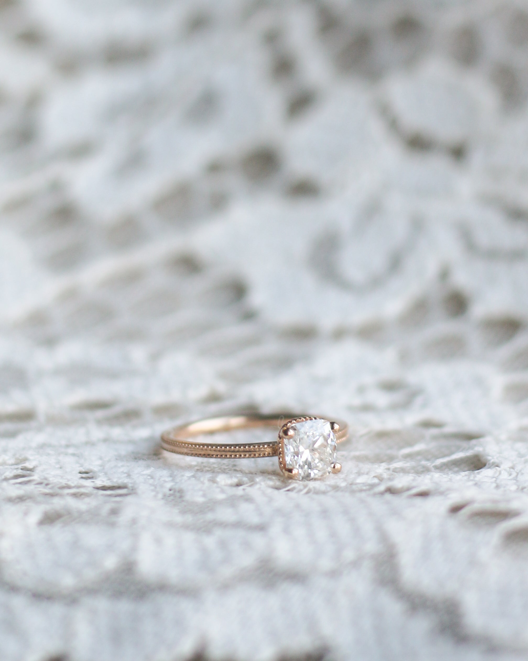 En galet vacker solitärring i gammeldags stil med en kuddslipad (cushion-cut) diamant. (Om du hellre önskar en antikdiamant i din ring, hittar du dem här)