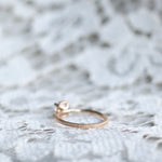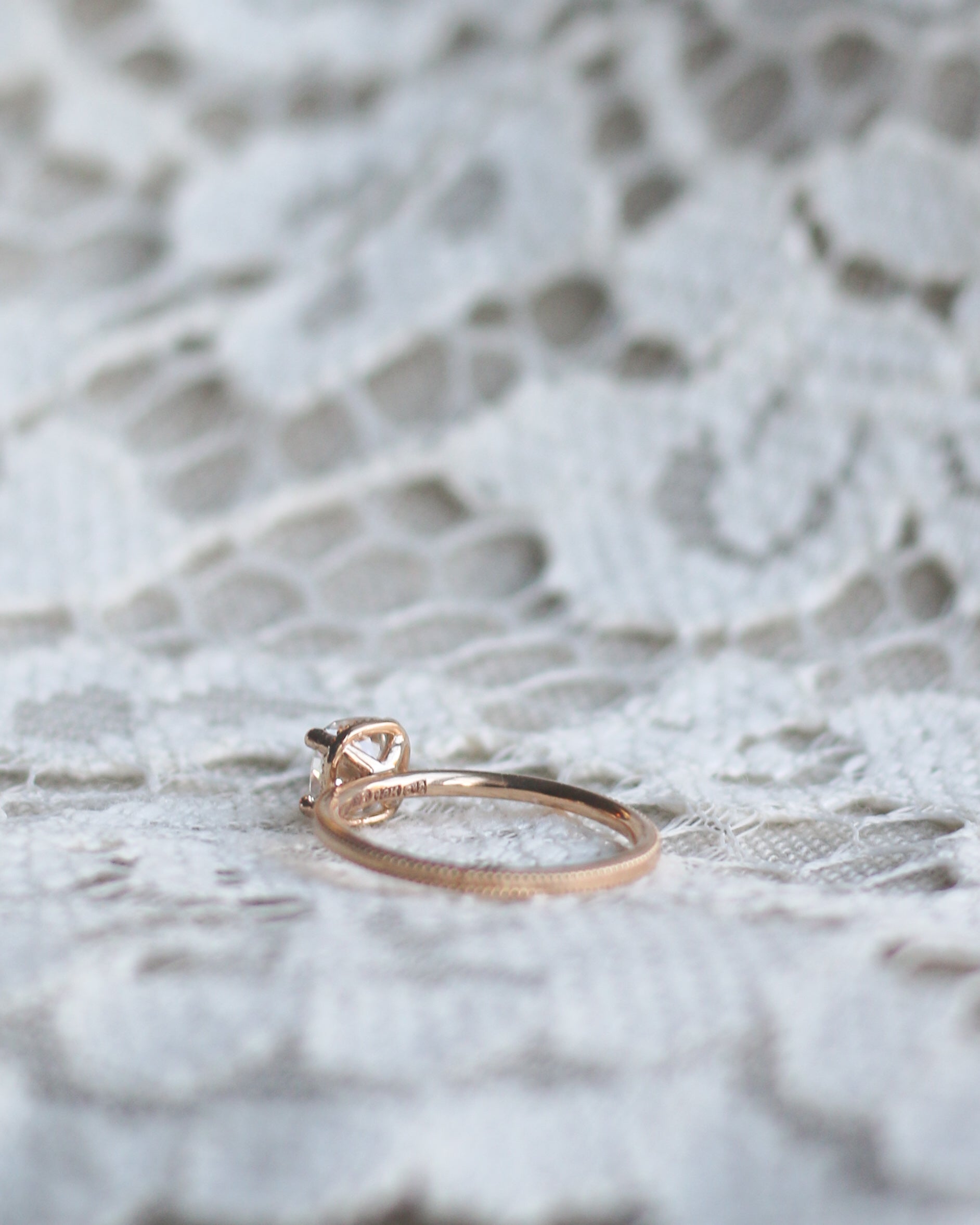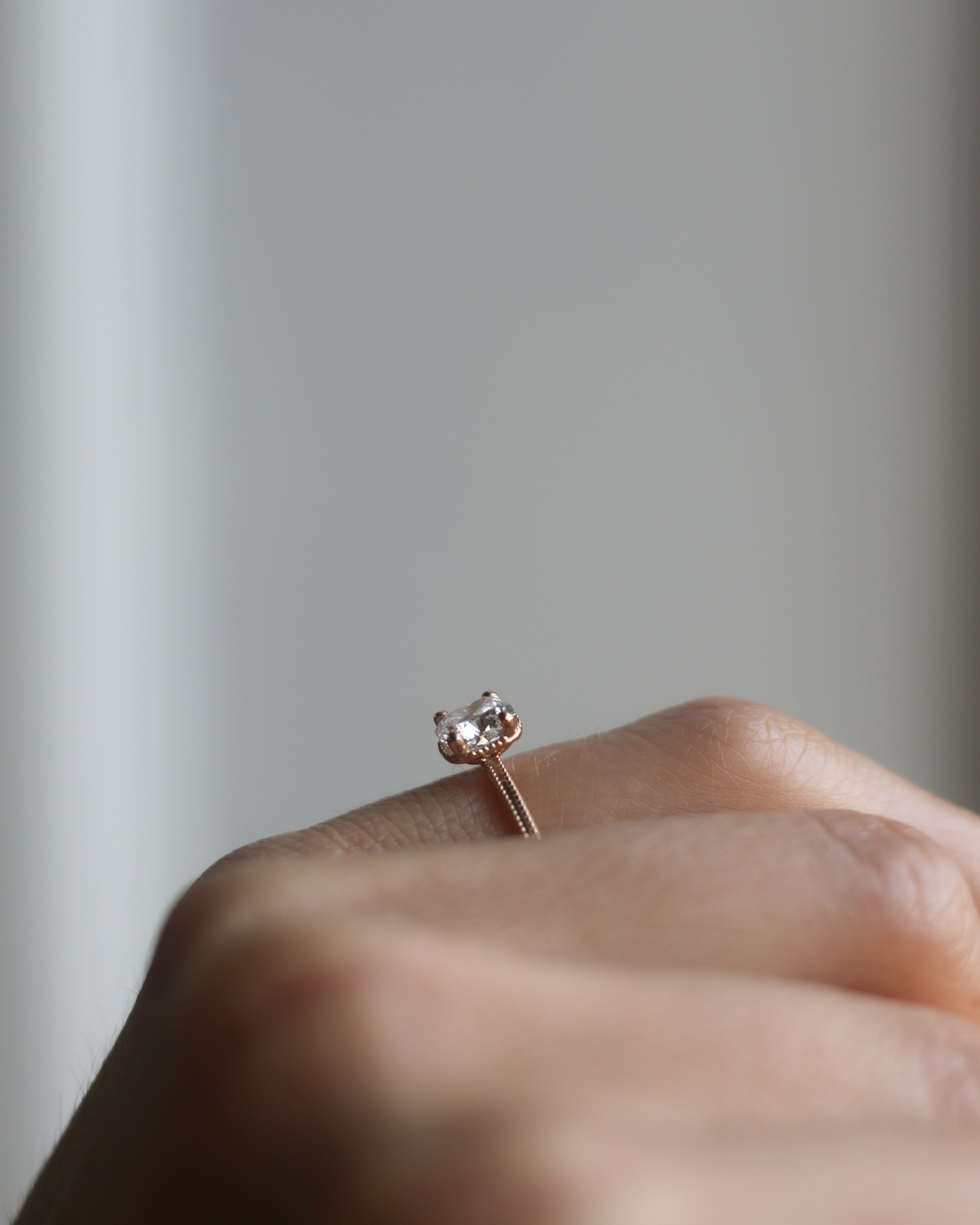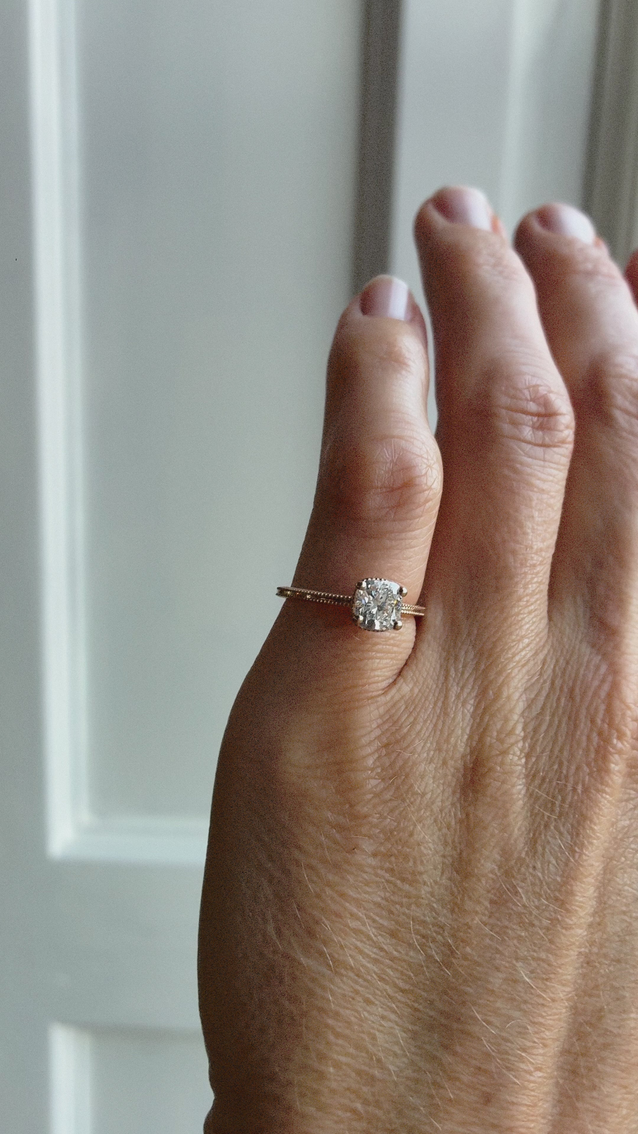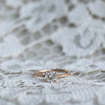 En galet vacker solitärring i gammeldags stil med en kuddslipad (cushion-cut) diamant. (Om du hellre önskar en antikdiamant i din ring, hittar du dem här)