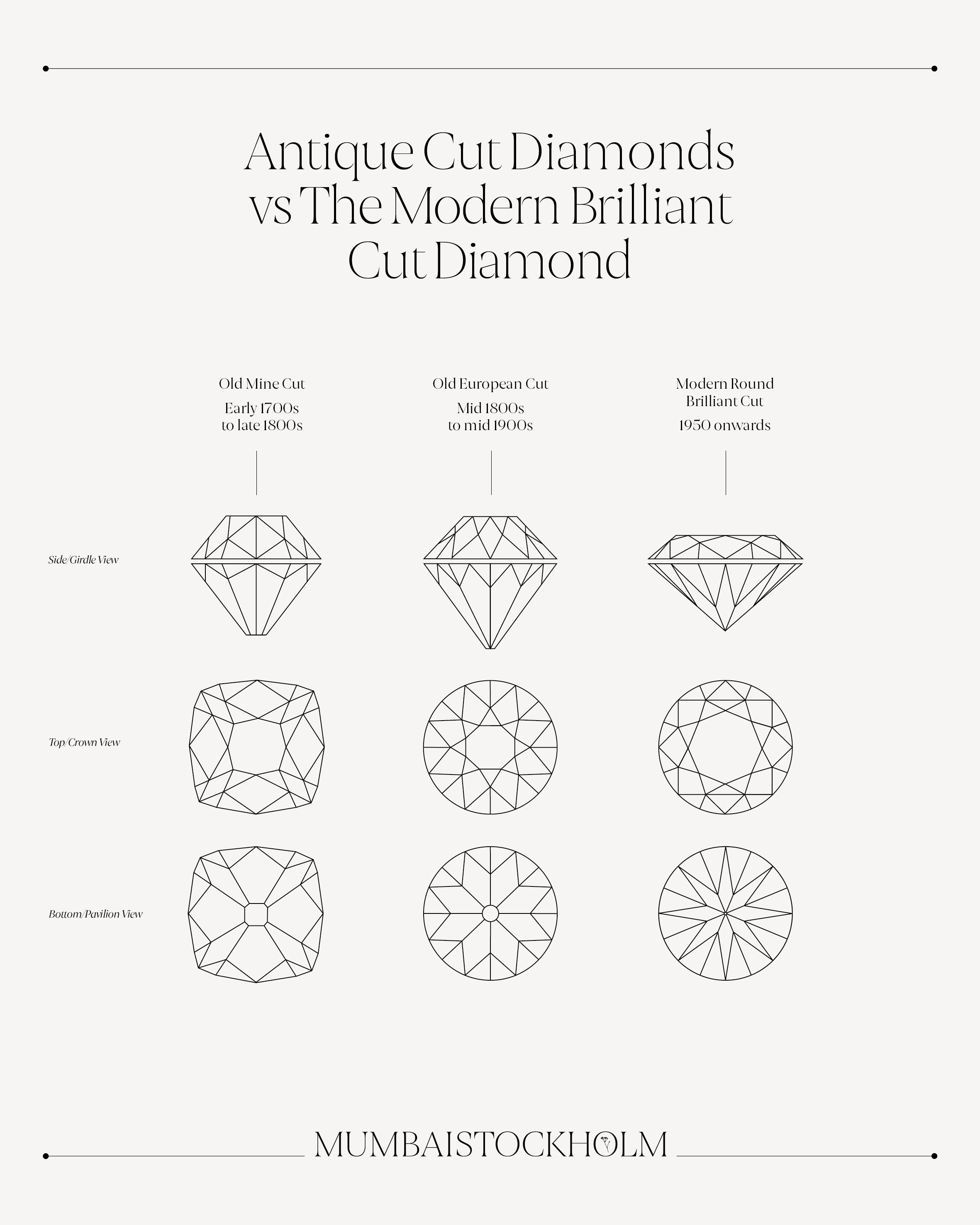 The cutting technique to create a round antique diamond was invented in the 1870’s, and is now known under the name Old European Cut. However, it was not until the Art Deco era in the 1920’s that diamonds became the most sought-after gemstone in Europe and the United States. During the 1940’s, the cutting technique developed and the diamonds began to become more and more similar to the modern brilliant cut. These in-between cuts are commonly known as transitional cut diamonds. The predecessor to the Old European Cut is the Old Mine Cut, which was prevalent from the mid-1800s until the early 1900’s. The Old Mine Cut is probably the oldest recognized cut type we know of today.