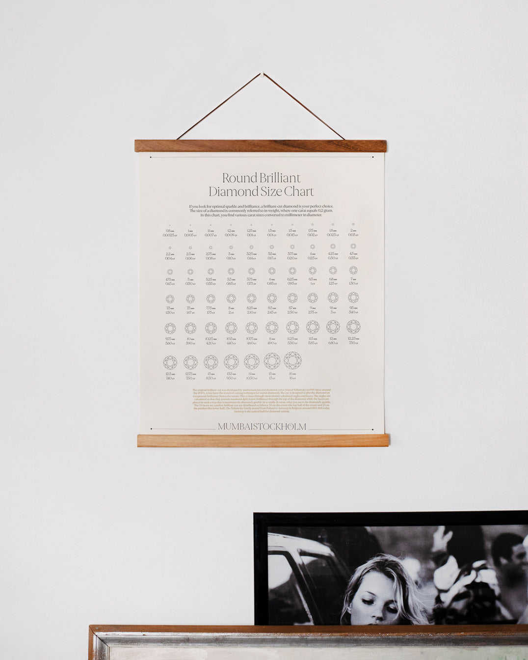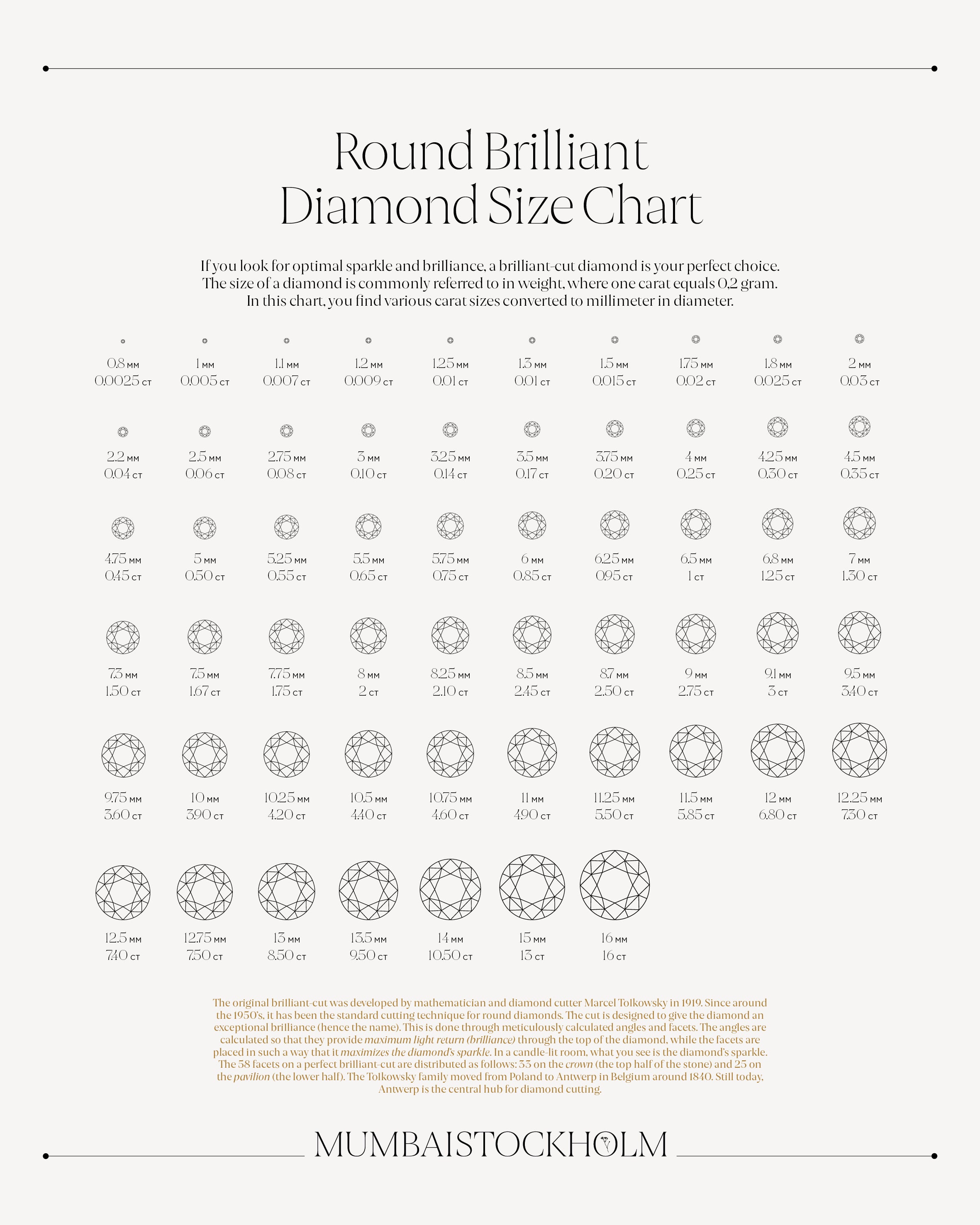 On this poster, you will find brilliant diamonds pictured in carat sizes from 0.0025 CT up to 16 CT. You can also see each size converted to millimeter in diameter.