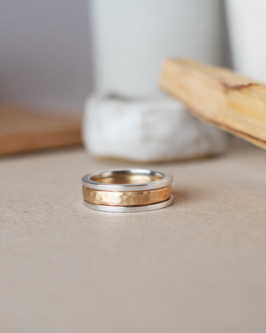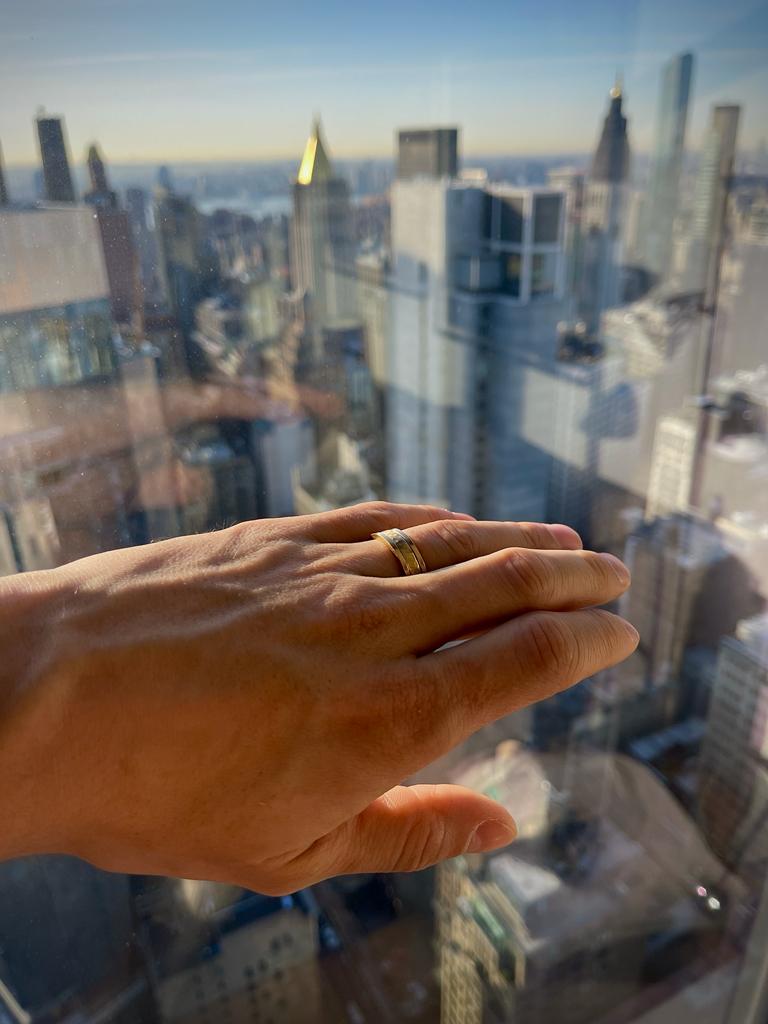 We have helped women stacking rings for almost ten years - but what about the men? Luckily, I got the chance when my friend Sebastian were getting married. He loved our Logan Ring, and fashion-forward as he is I gently suggested that we frame it with two gold bands to spice it up. That would also let him style himself differently depending on his mood. One day he could wear all three rings, and the next day only one! He loved the idea and here is the result! Hope you love it as much as Sebastian and I. Here you also see Sebastian's hand in front of the amazing view of his apartment in - you guessed it - New York. xx Cecilia and the mumbai team