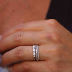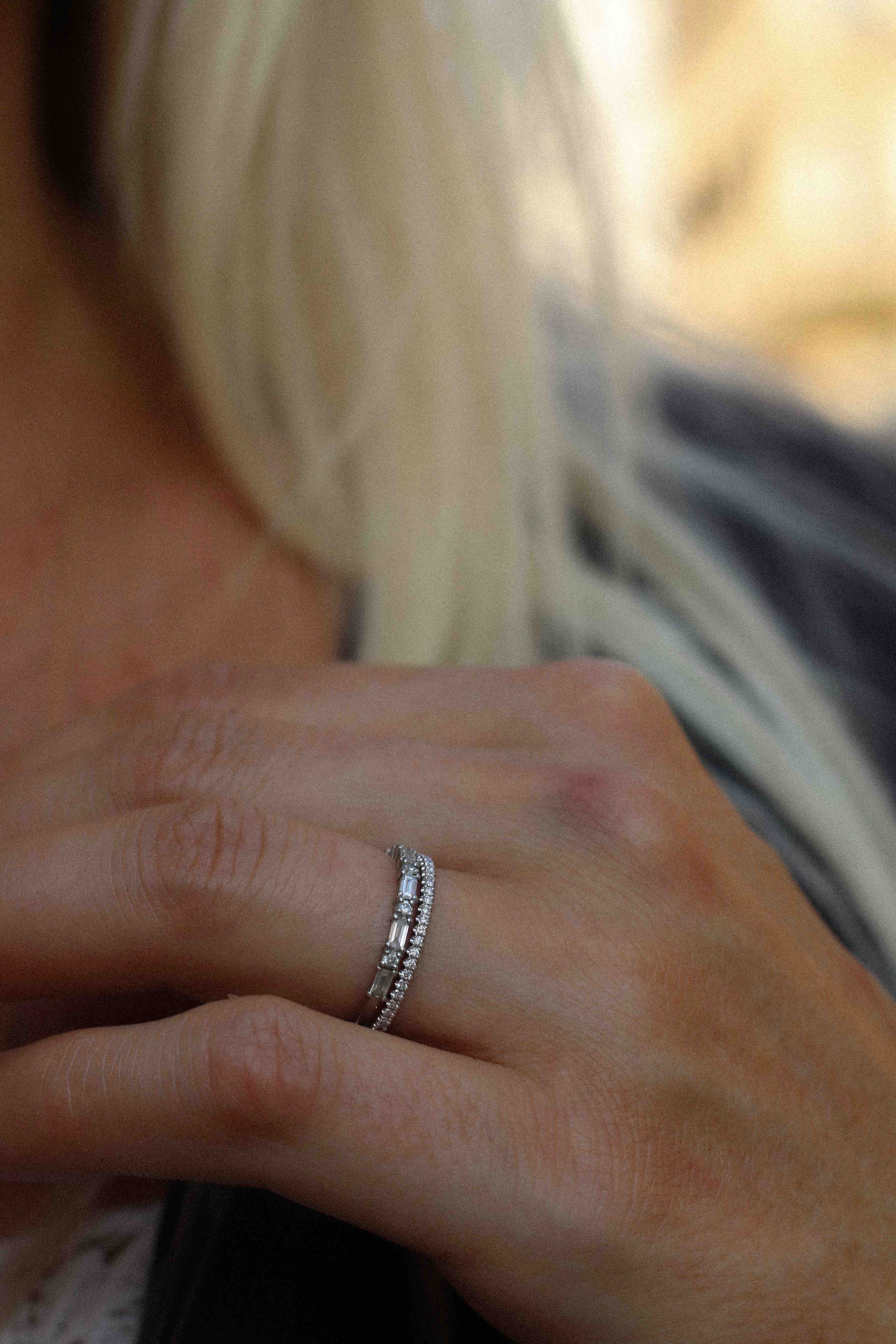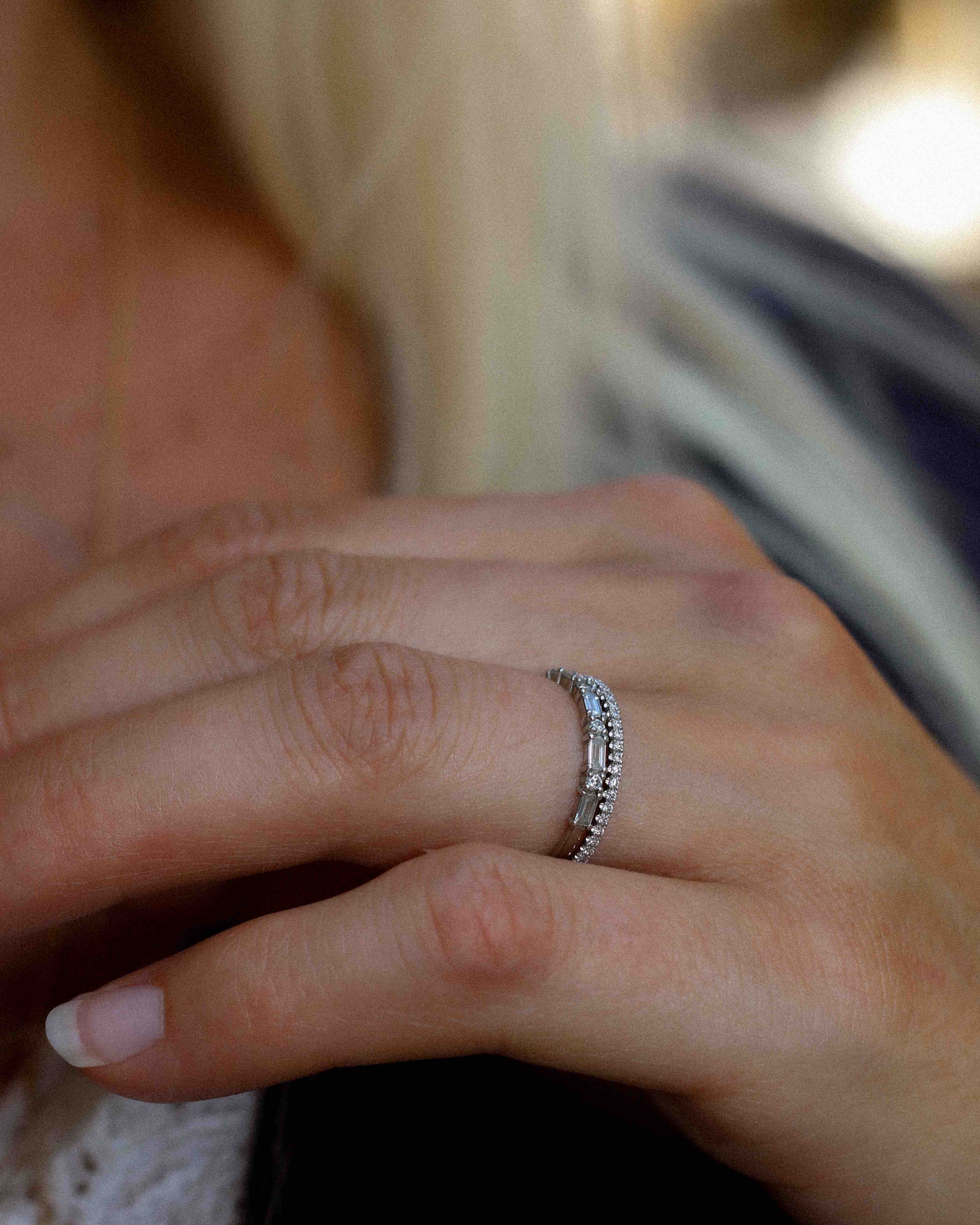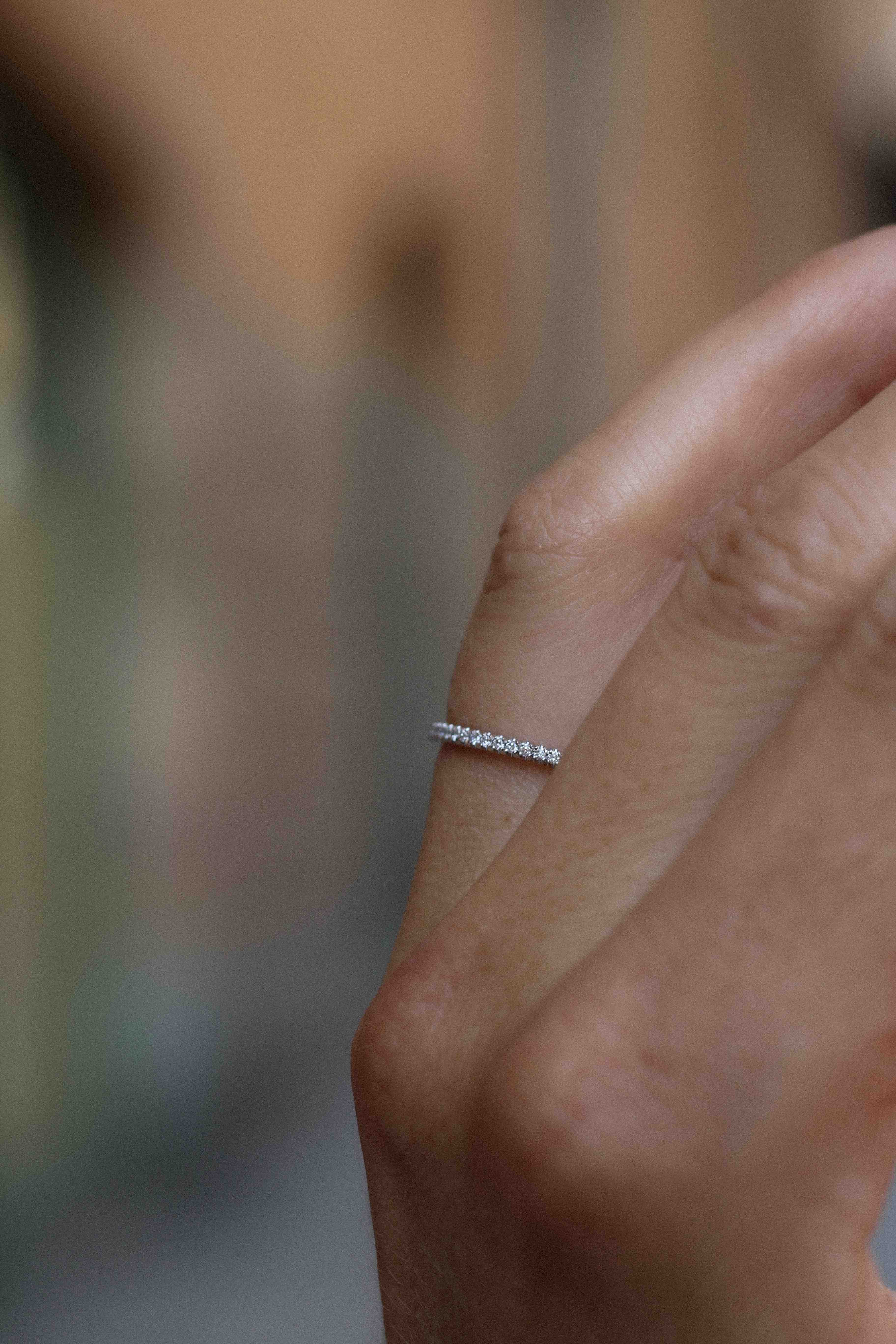 Ädelstenarna är fattade i en infattning där så lite guld som möjligt syns ovanifrån - nästan som att de svävar som ett glitterband över fingret. Det ger ringen en extra nätt och minimalistisk känsla!