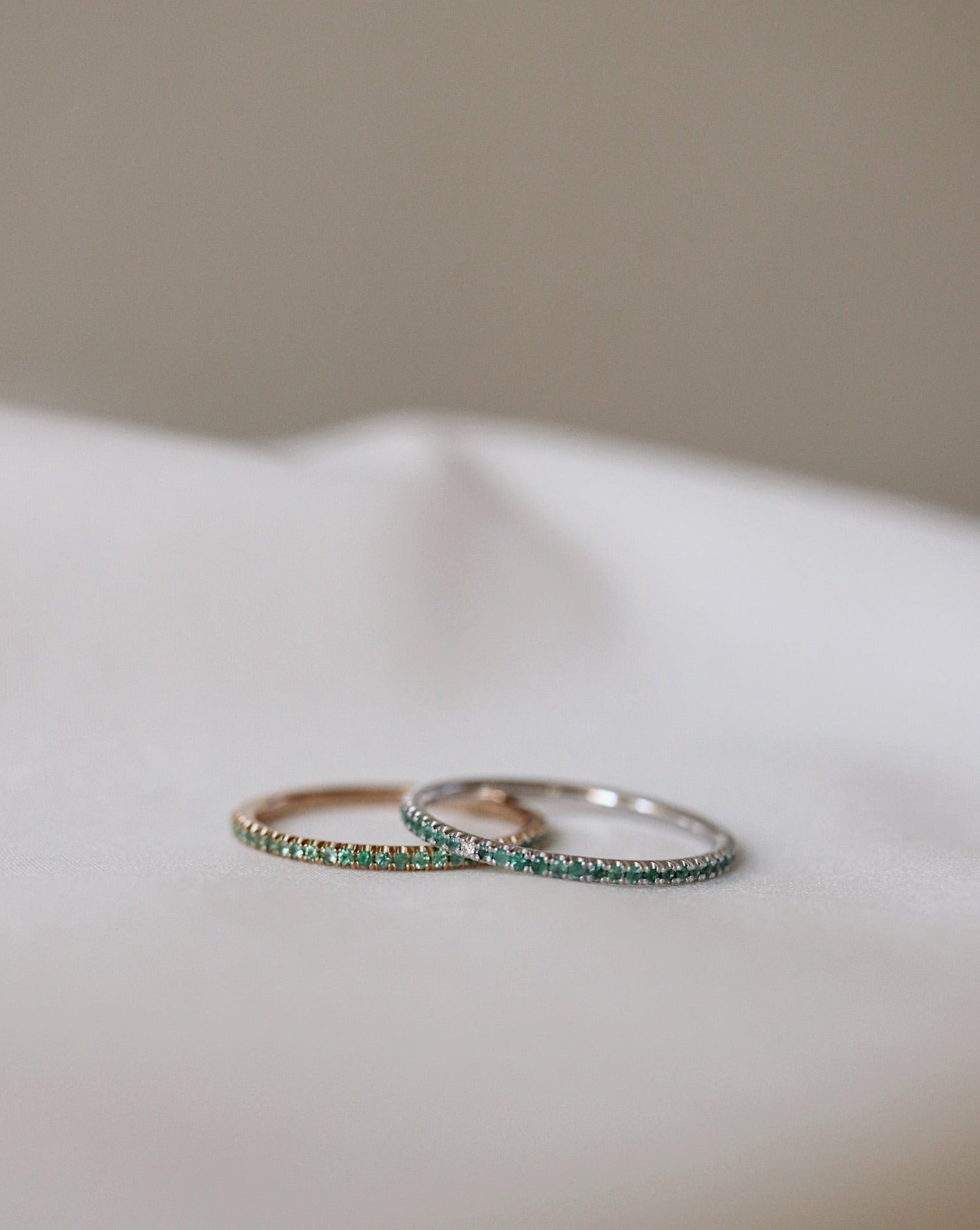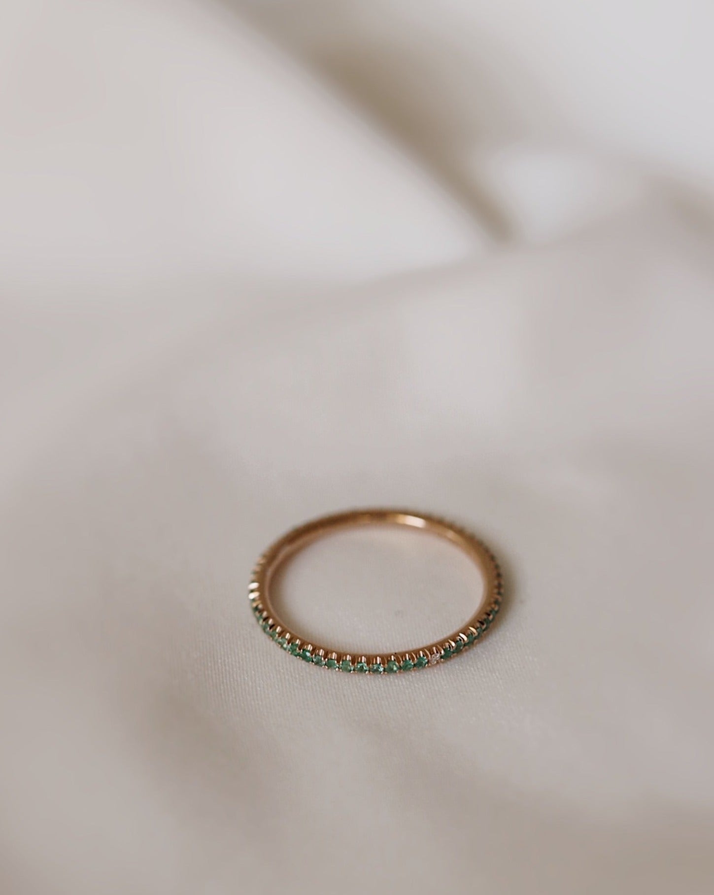 Ädelstenarna är fattade i en infattning där så lite guld som möjligt syns ovanifrån - nästan som att de svävar som ett glitterband över fingret. Det ger ringen en extra nätt och minimalistisk känsla!