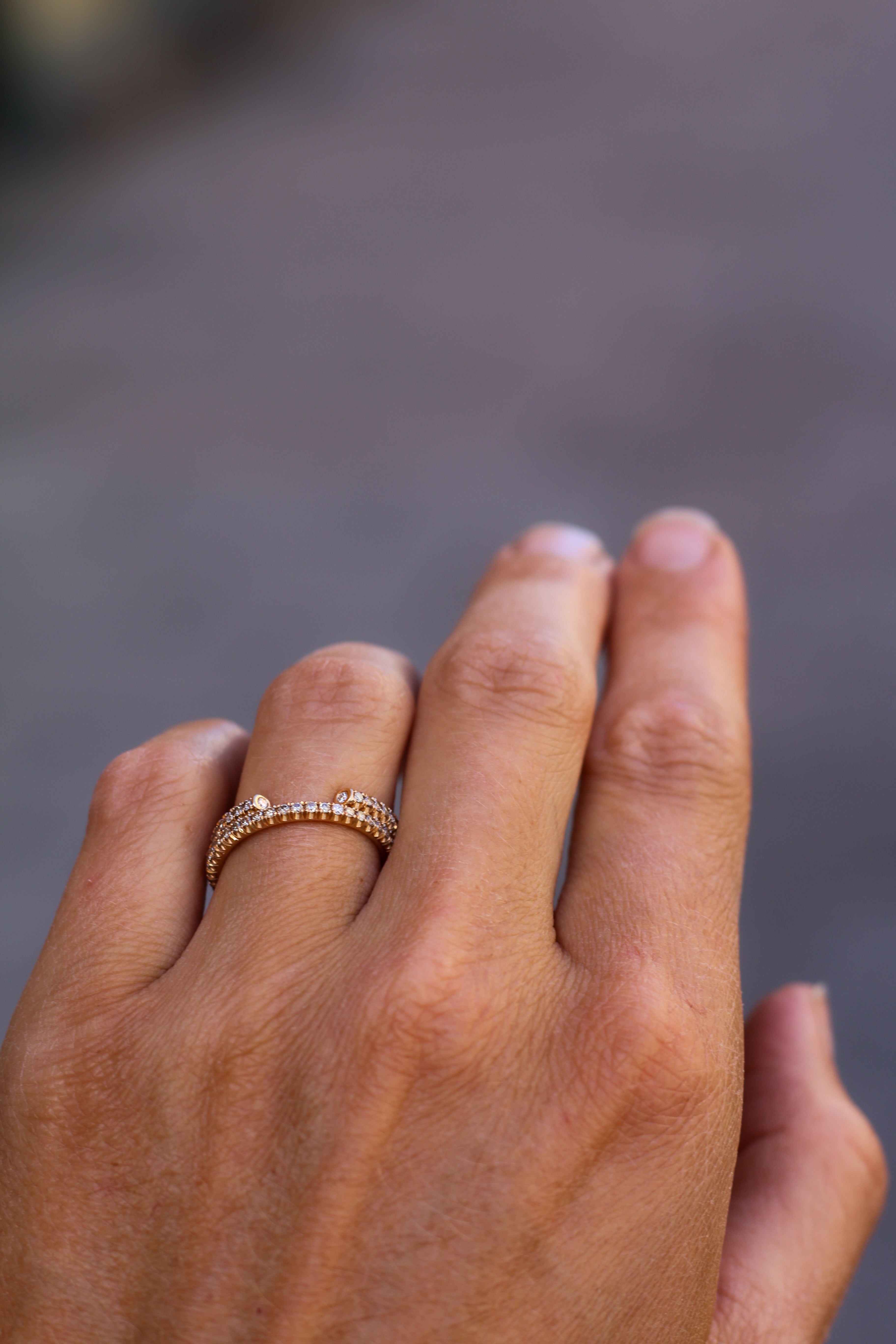The ring in the picture is in size 17,25/54 and is fully covered with 45 diamonds, in total 0.45 CT.