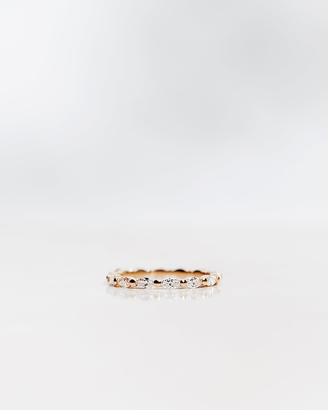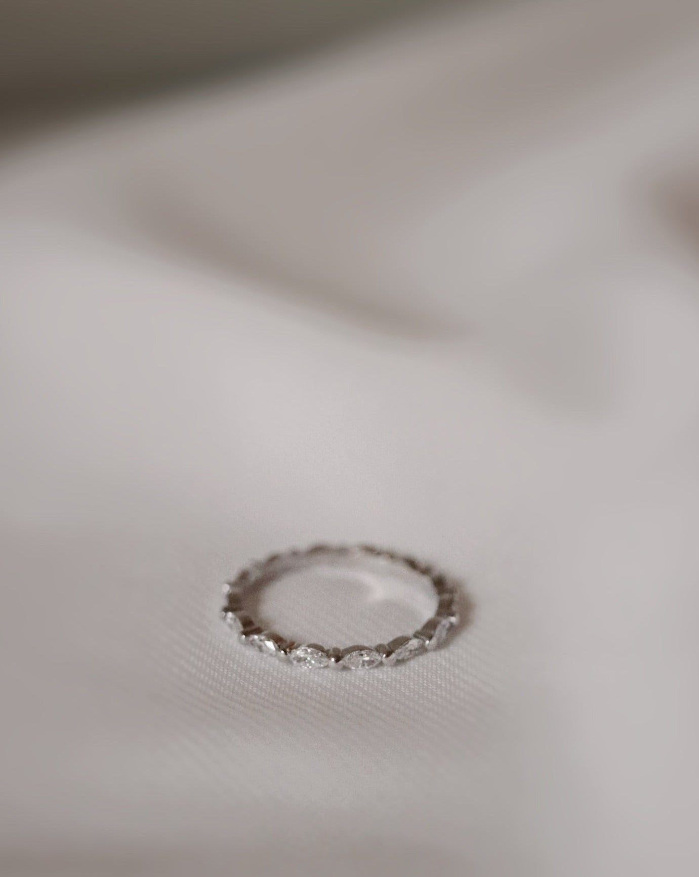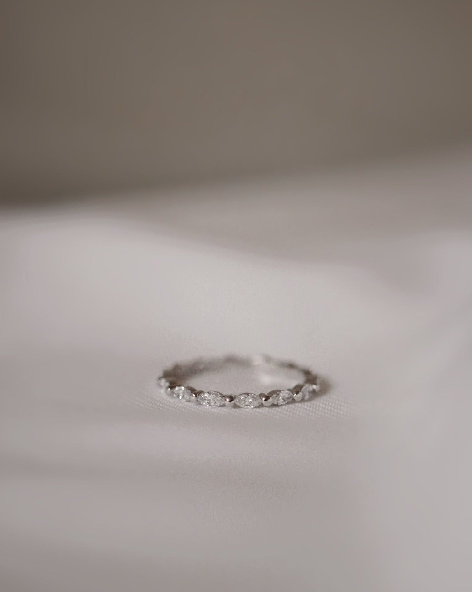 The ring in the first picture is in size 15 and has fourteen approx. 0.05 CT (1.7 mm x 3.5 mm) Marquise Cut Diamonds, with a total CT weight of 0.70 CT.