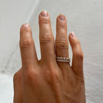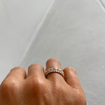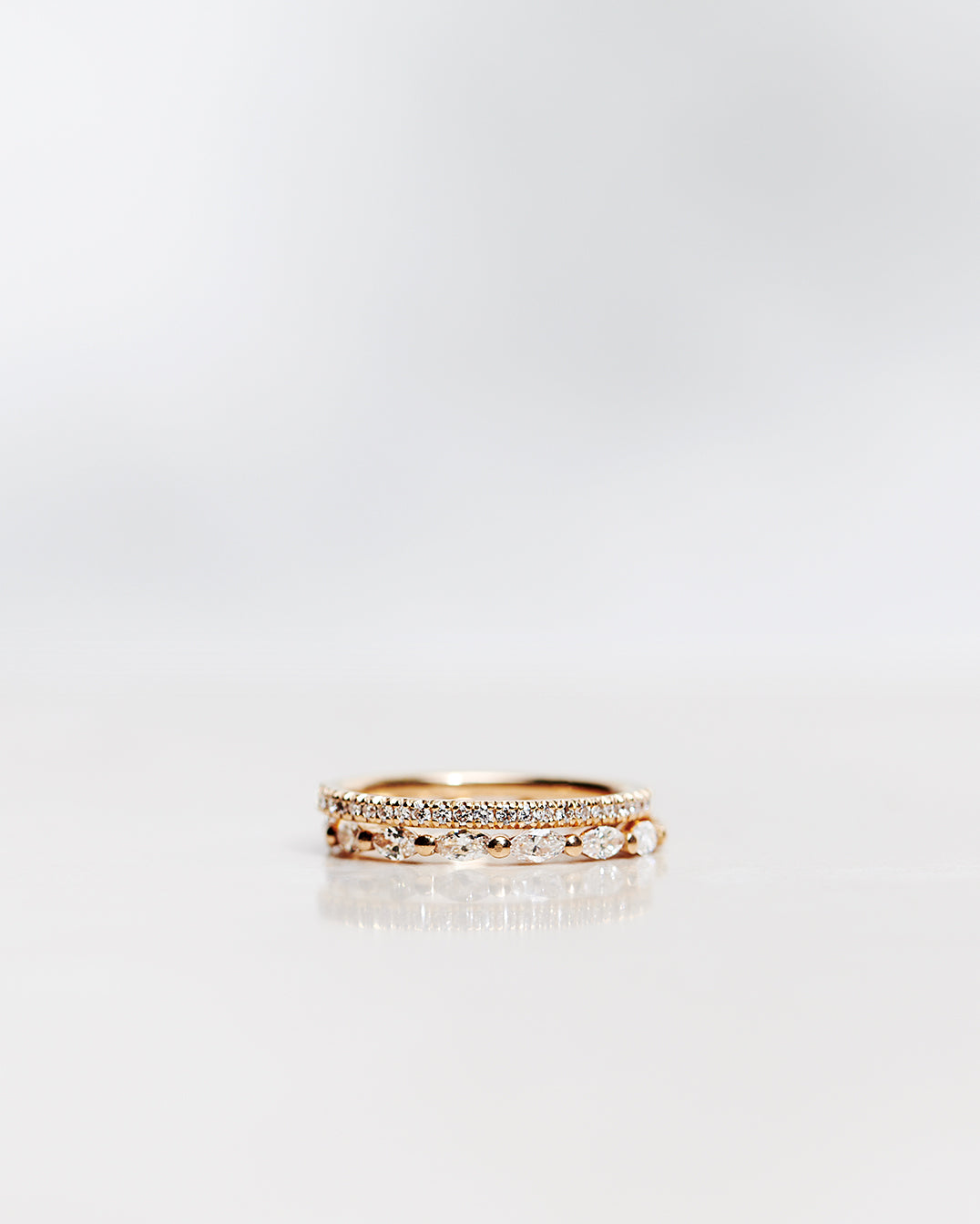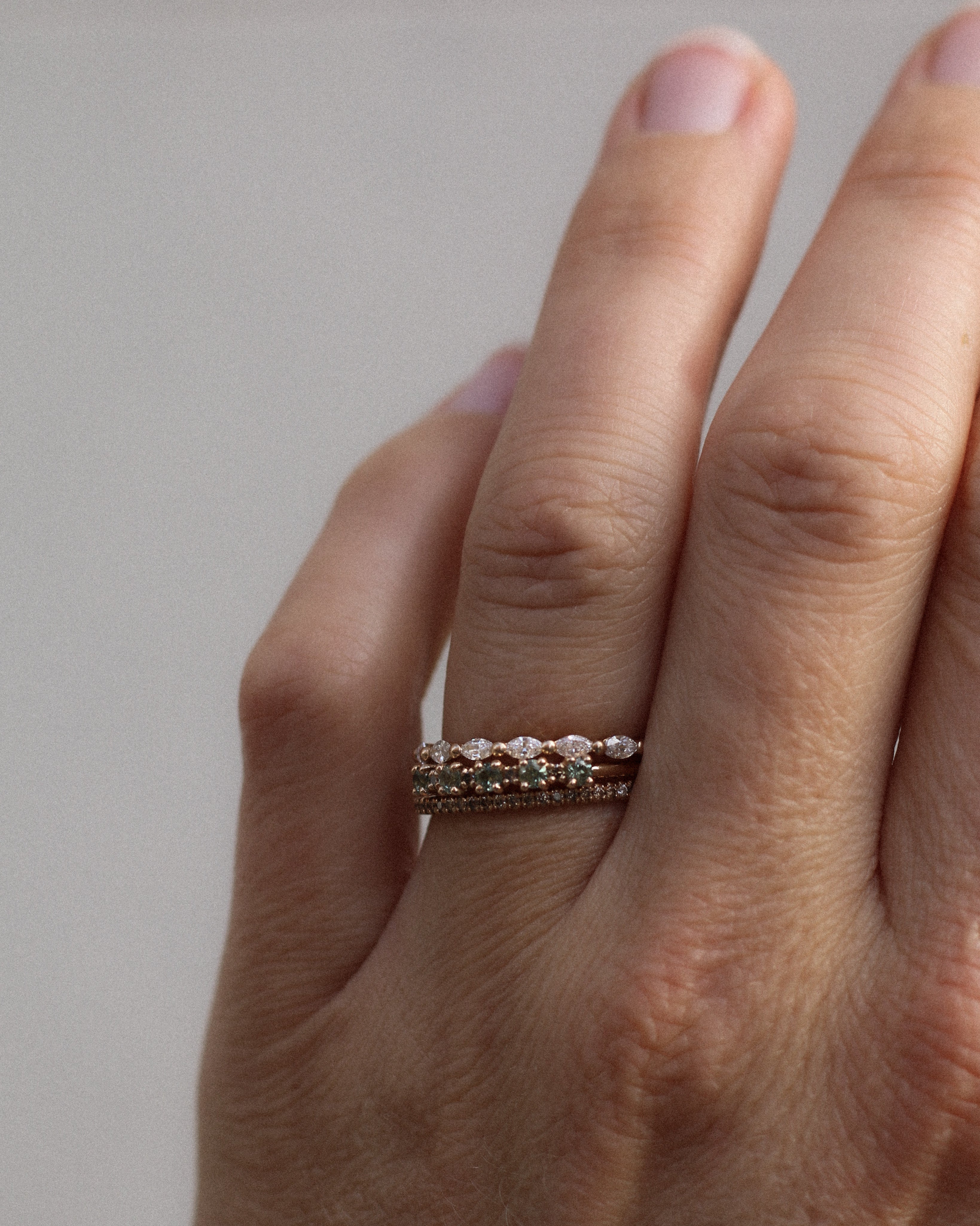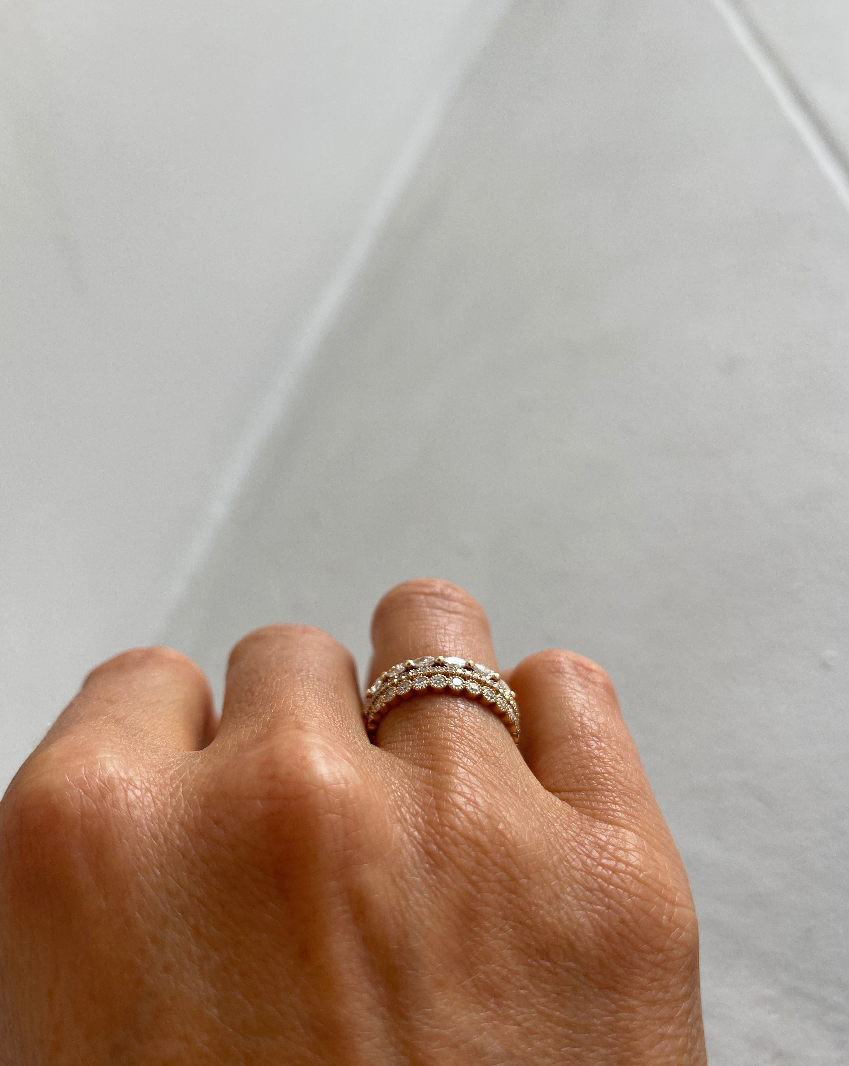 The ring in the first picture is in size 15 and has fourteen approx. 0.05 CT (1.7 mm x 3.5 mm) Marquise Cut Diamonds, with a total CT weight of 0.70 CT.
