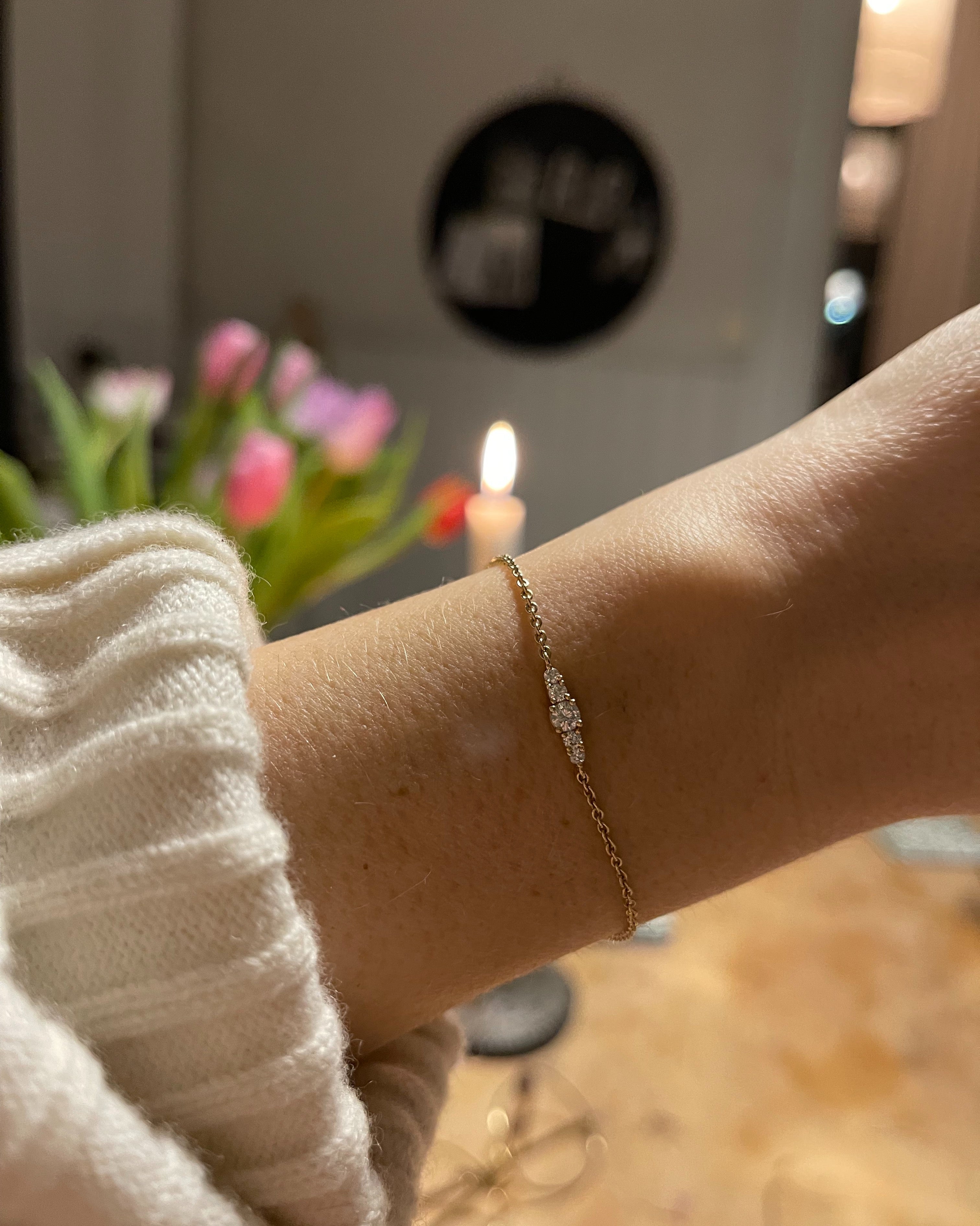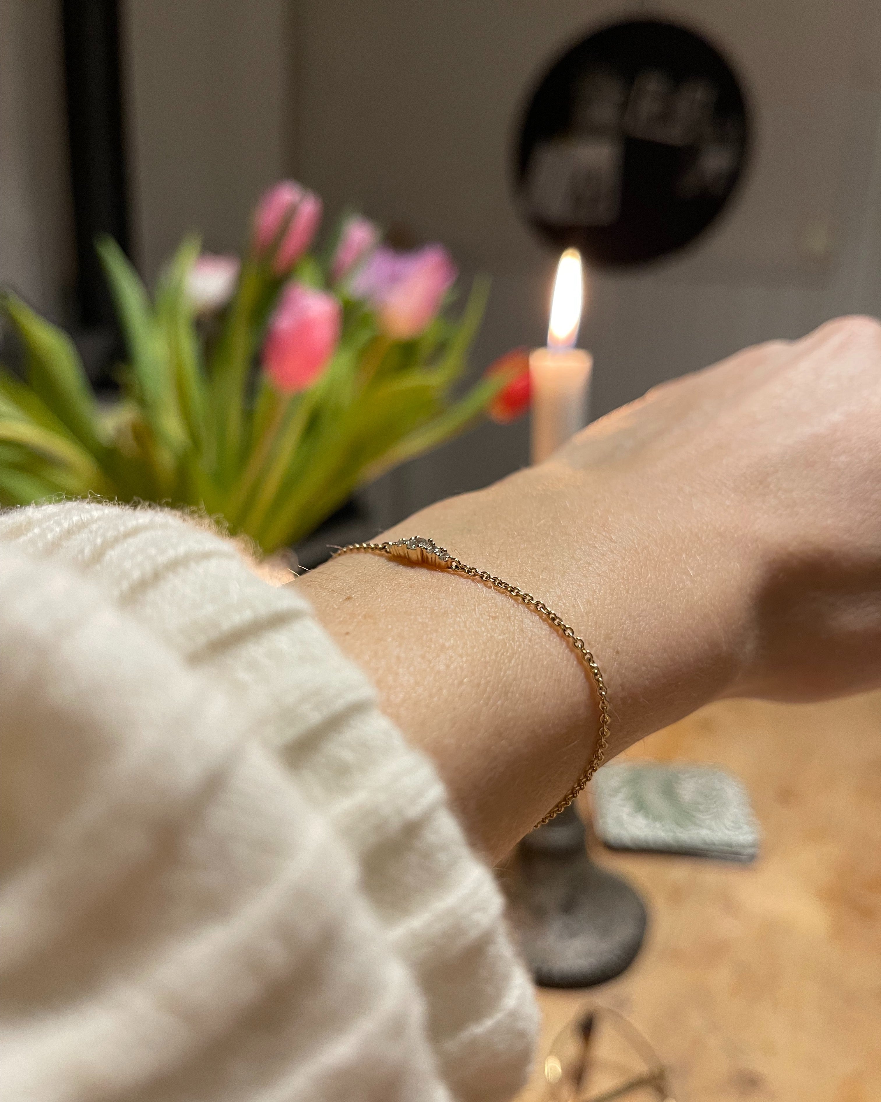 It combines five diamonds, where the biggest is only 3 mm in diameter (0.11 CT), with a beautiful 1,3 mm gold chain.