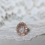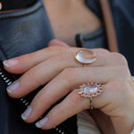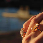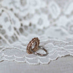 Modellen är en carmoséring, eller haloring, med en stor sten i mitten som omges av mindre stenar.