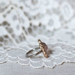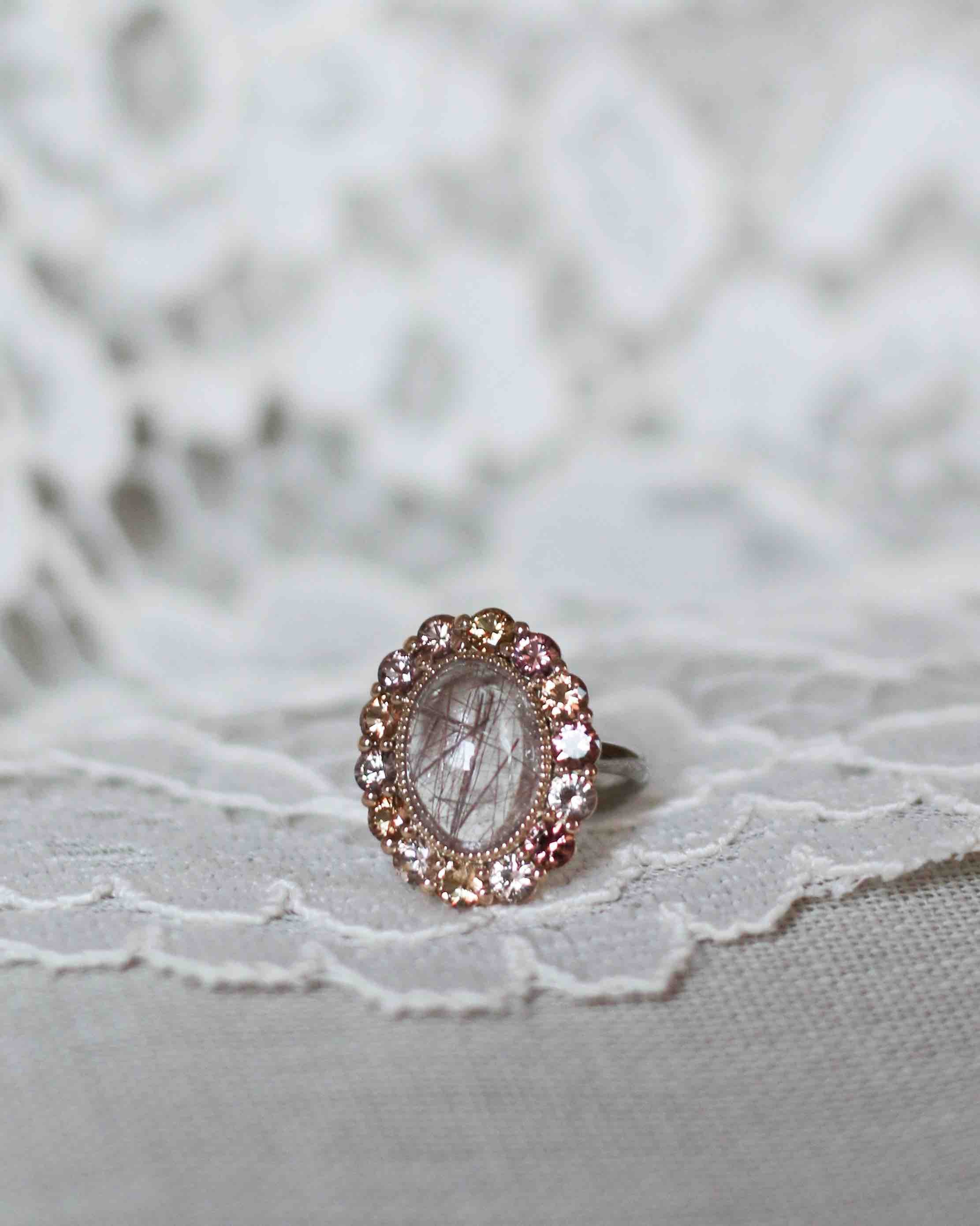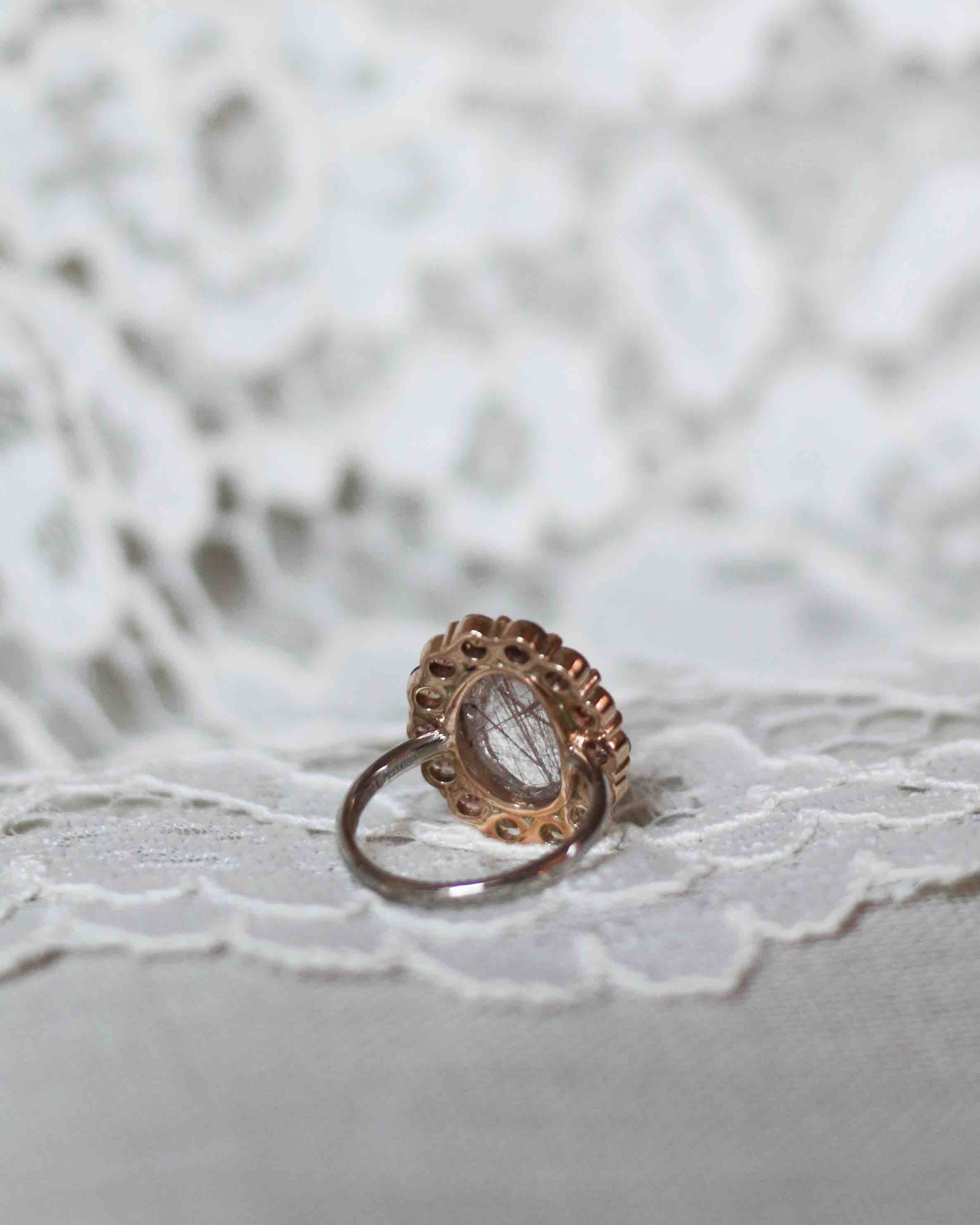 Ringen på bilden består av fjorton (totalt 1.76 CT) malayagranater från Tanzania som omger en 3.76 CT grå rutilkvarts med underbara mörkgrå stick i. Den cabochonslipade rutilkvartsen är handplockad ur ett gammalt, underbart ädelstenslager och ursprungslandet är därför okänt.