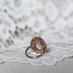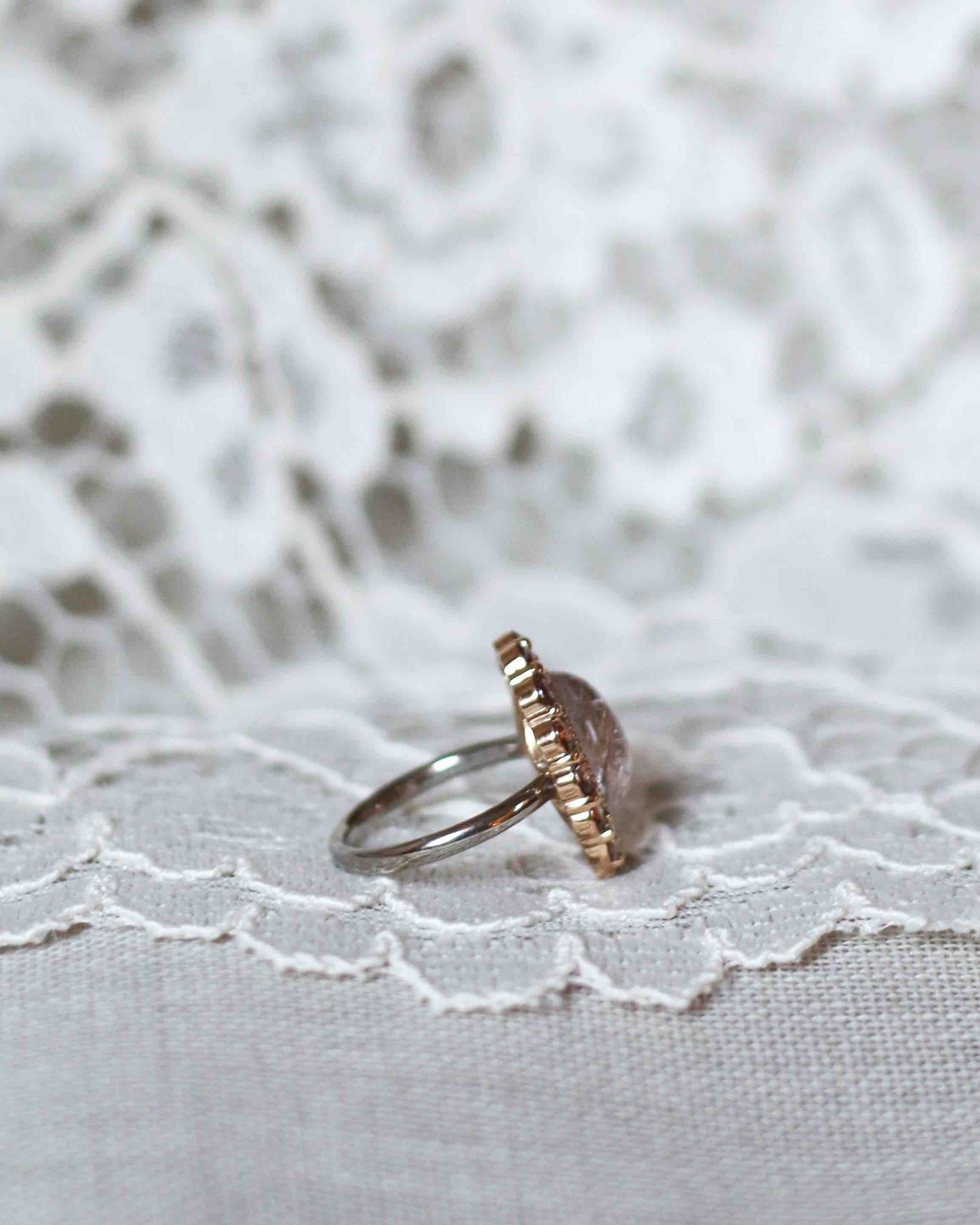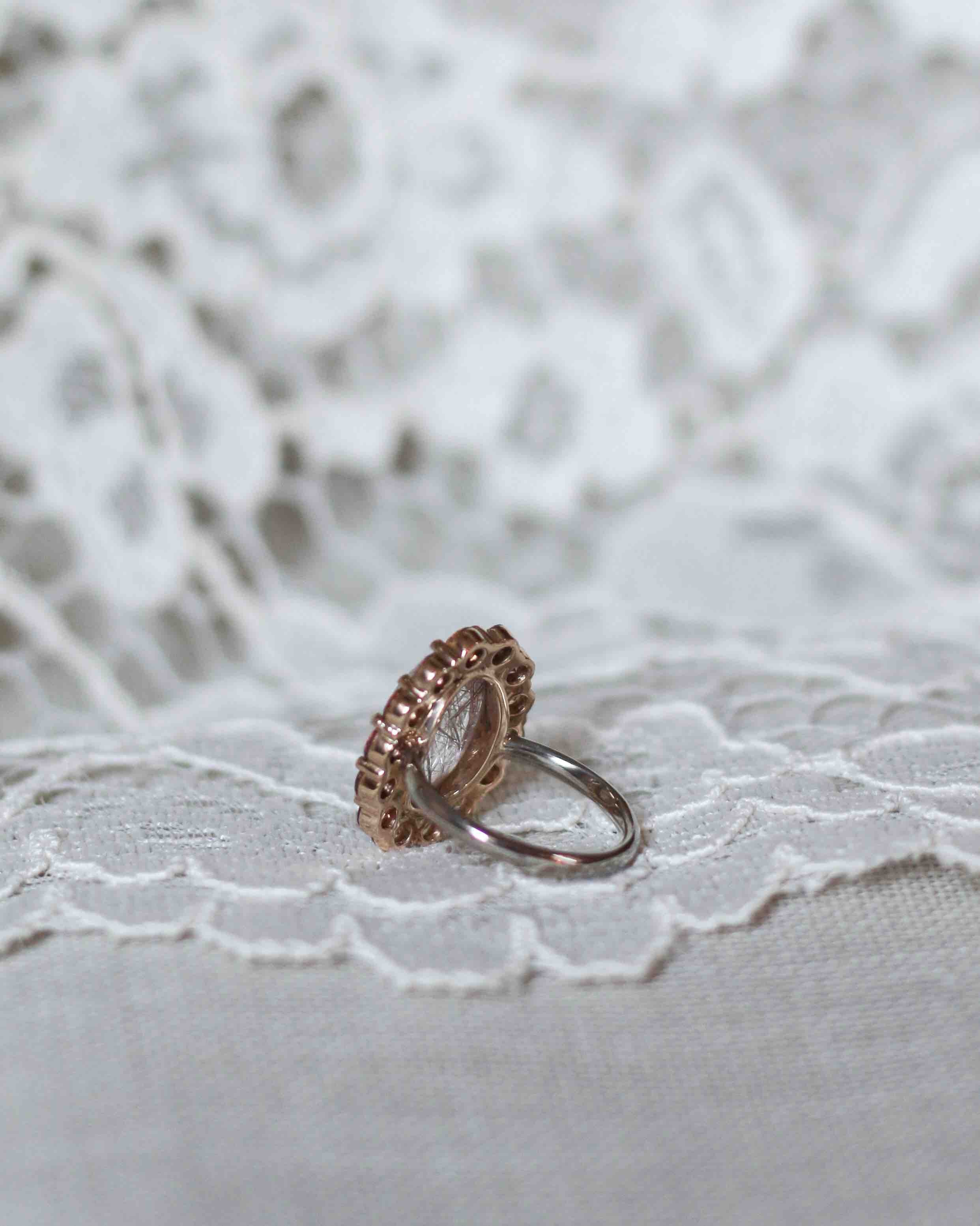 Denna ring är så kallad two-toned: ringbandet som är i vitguld plockar upp den grå tonen i rutilkvartsen, medan fattningen är i rödguld vilket plockar upp de underbara varma skiftningarna i malayagranaterna.