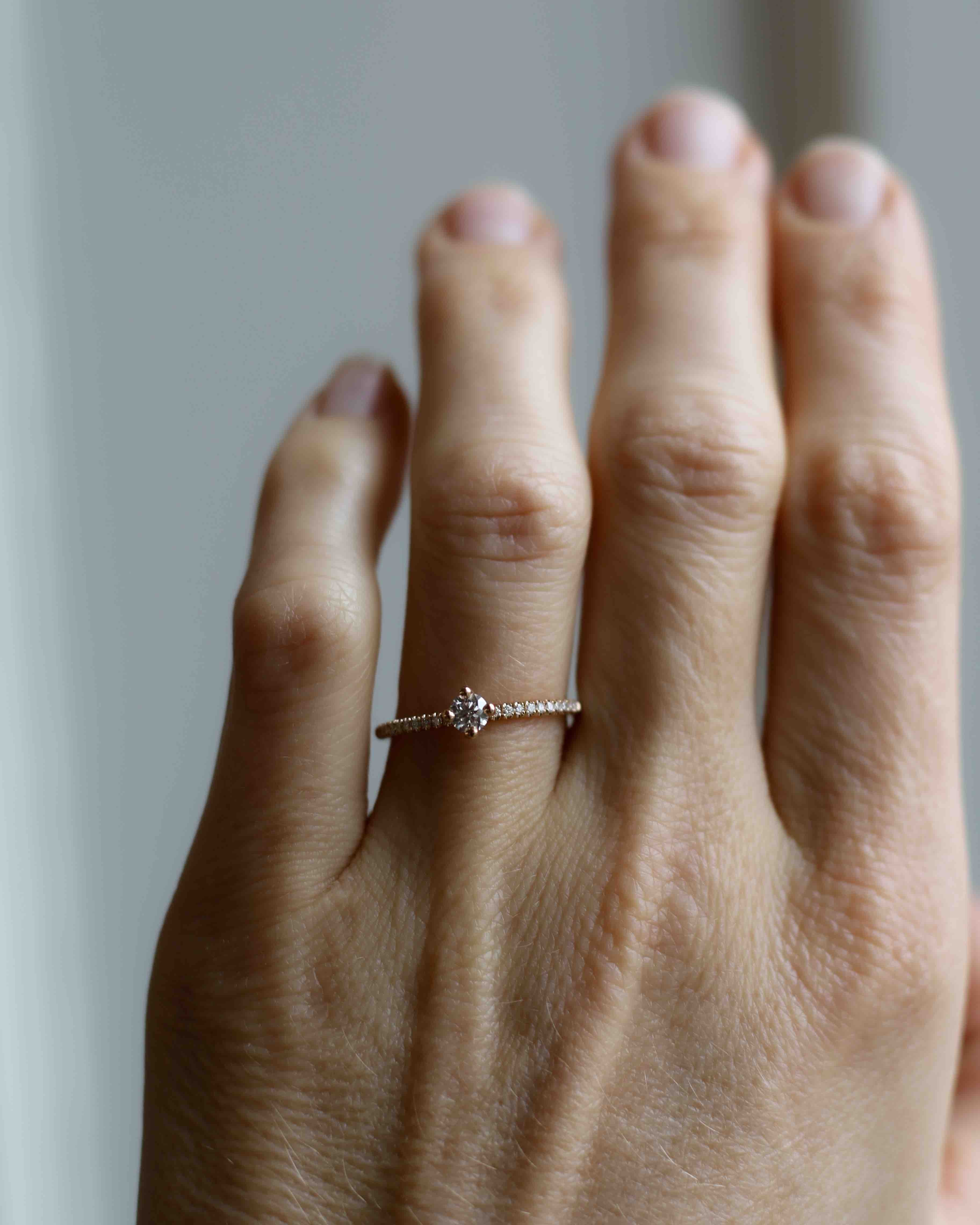 Not At All Tiny Sparkle är en ring som verkligen får en att känna sig finklädd! Den är nätt men glittrar helt otroligt. Den stora diamanten är "bara" 0.20 CT (3,75 mm tvärsöver), men tack vare att den sitter i en hög fattning och kommer upp från fingret tar den både för sig på ett lågmält sätt och reflekterar ljus så otroligt vackert. En av de mest perfekta ringarna man kan ha i sin basgarderob enligt mig. Den är som de där riktigt snygga byxorna eller vassa klackarna som alltid skänker en känsla av pondus! Och förresten: Har du tänkt på att högre fattningar gör att diamanter ser större ut än vad de är? Xx Cecilia