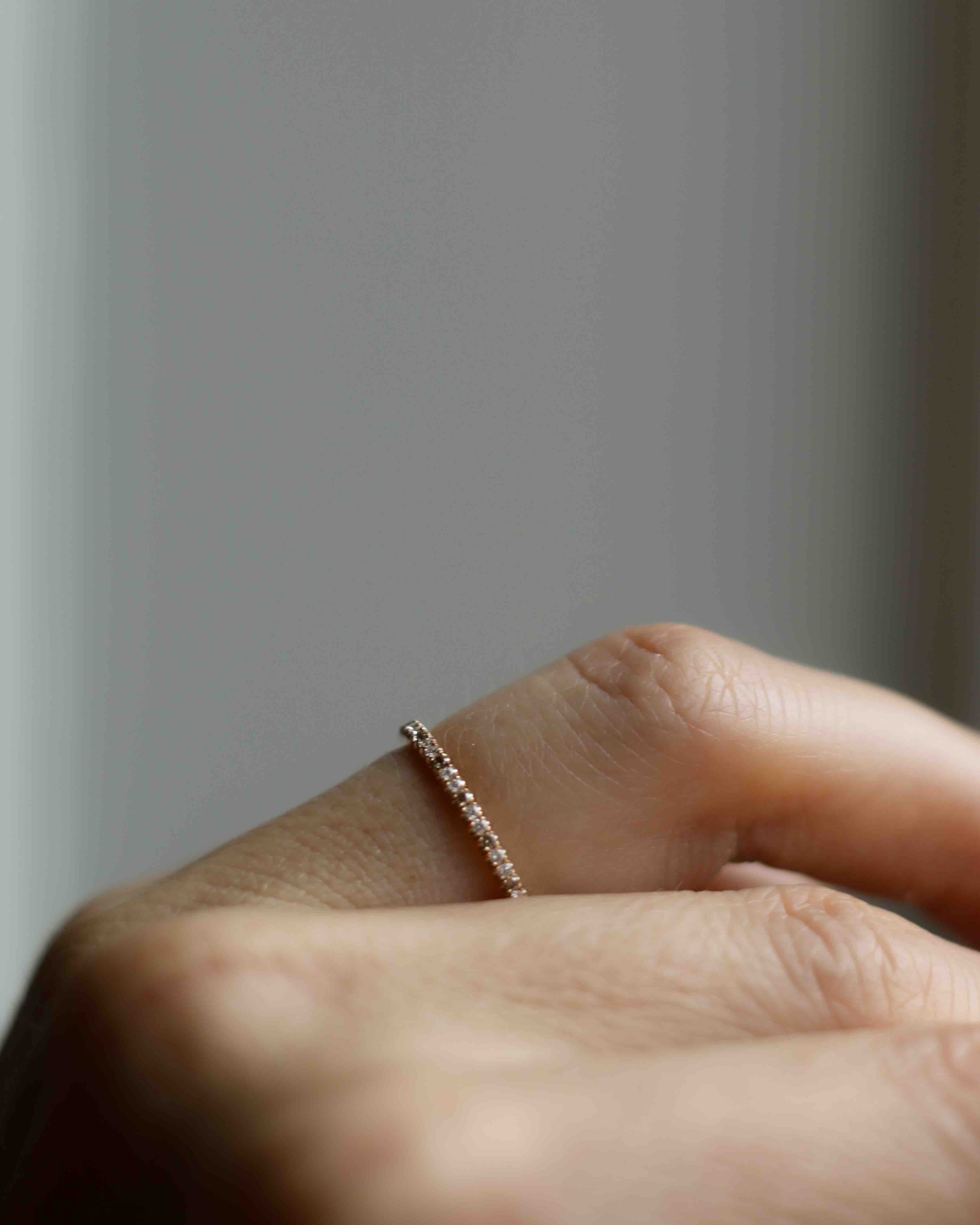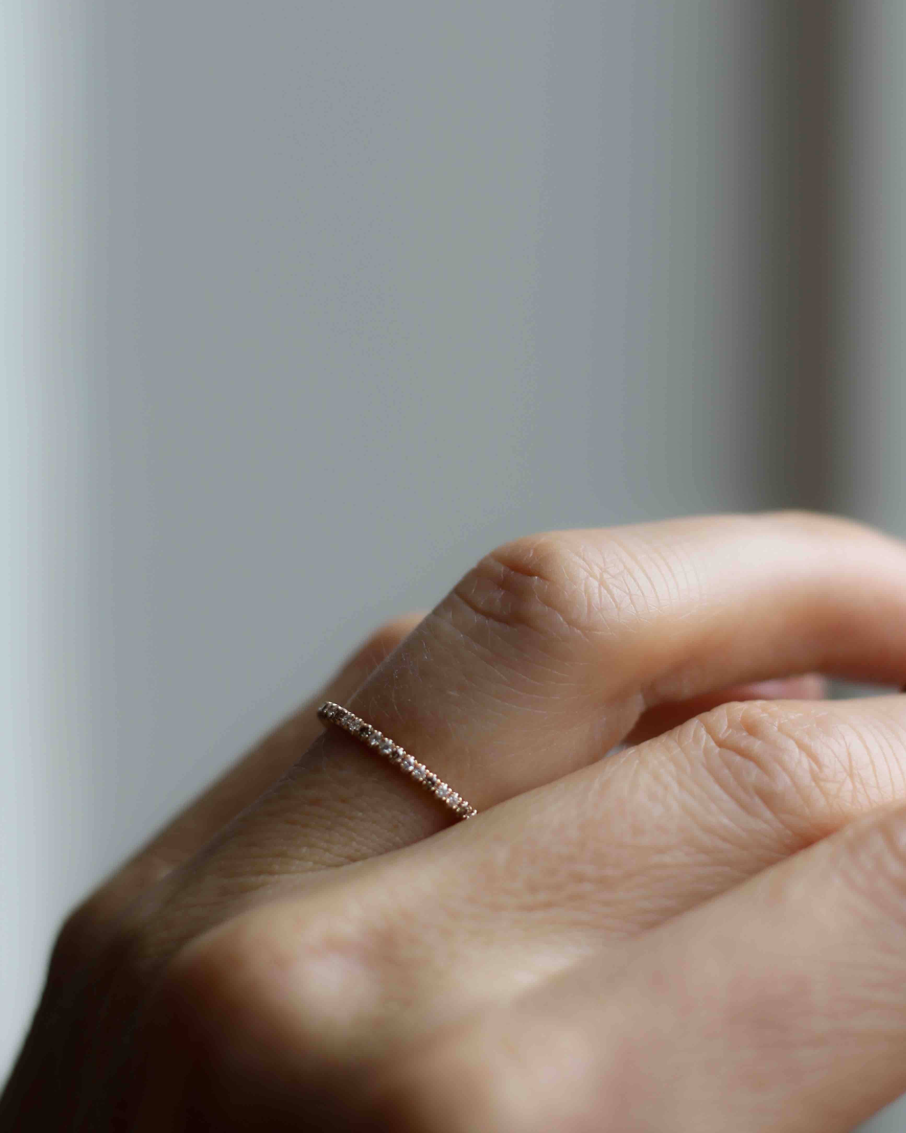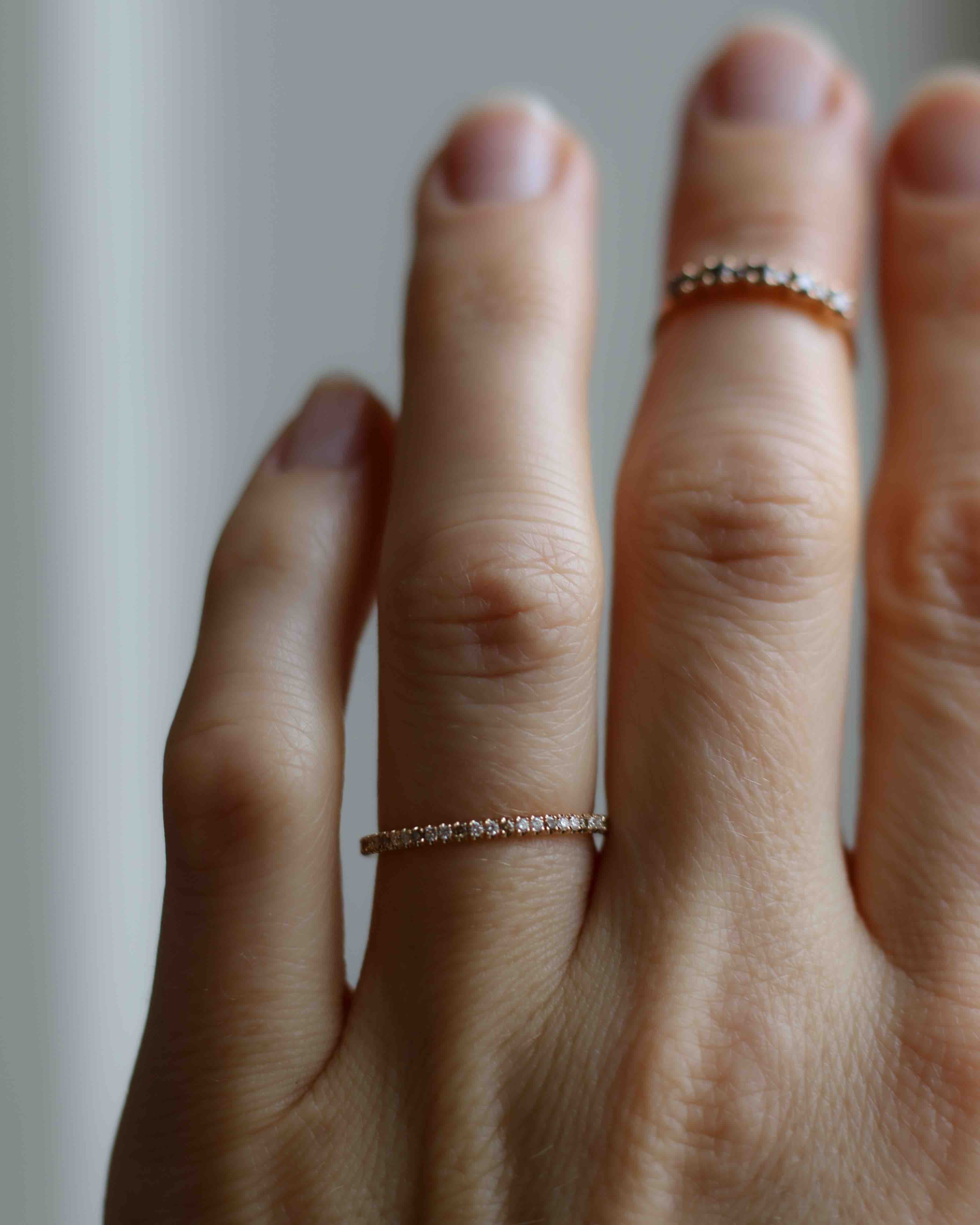 Pinky Jade Ring kom till för att jag ville bära en nätt, men cool, liten evighetsring på lillfingret. En ensam ring på lillfingret kan jag tycka är det coolaste som finns! Den första hade ett 2+1 mönster av svarta och vita diamanter. Nu, flera år senare, har Pinky Jade Ring blivit en underbar liten ring som våra stammisar älskar - och många bär den inte på lillfingret!