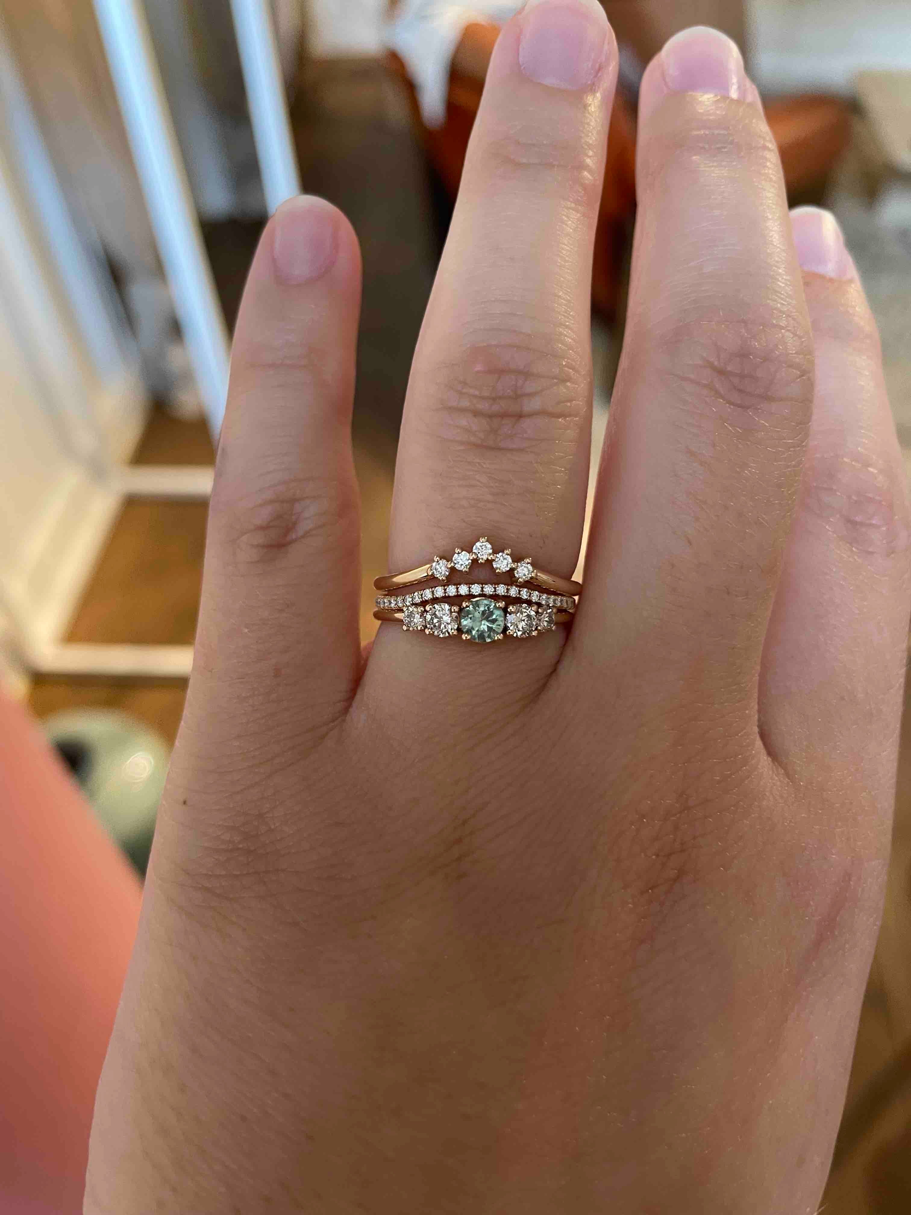Elise Ring is beautiful alone on the ring finger. It also stacks beautifully with all curved bands.