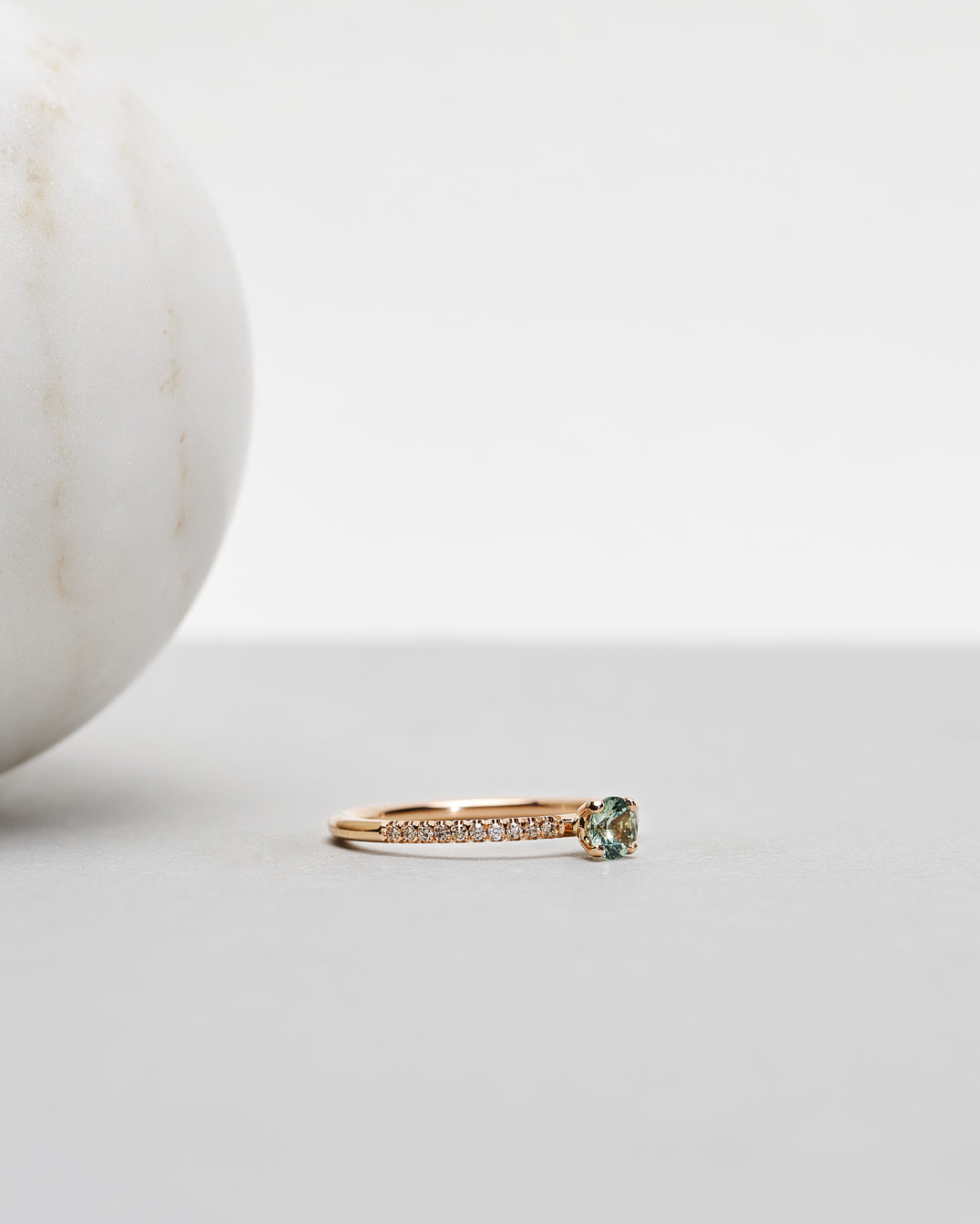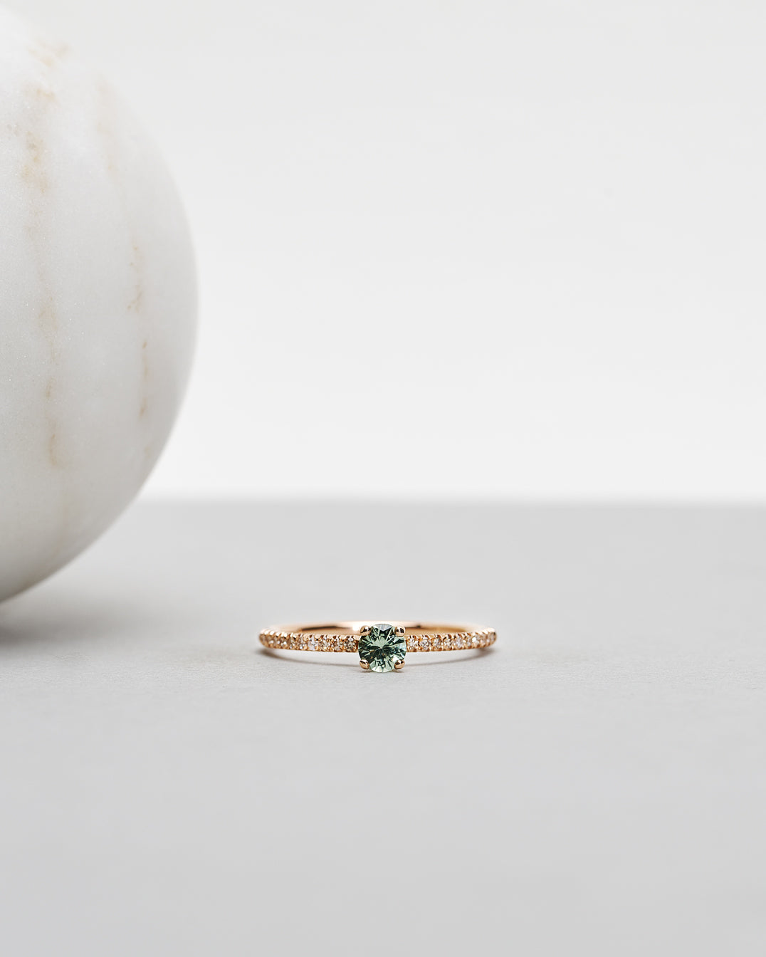 - Not At All Tiny Sparkle Ring – Low Setting in Rose Gold with Olive Green Sapphire and Champagne Diamonds