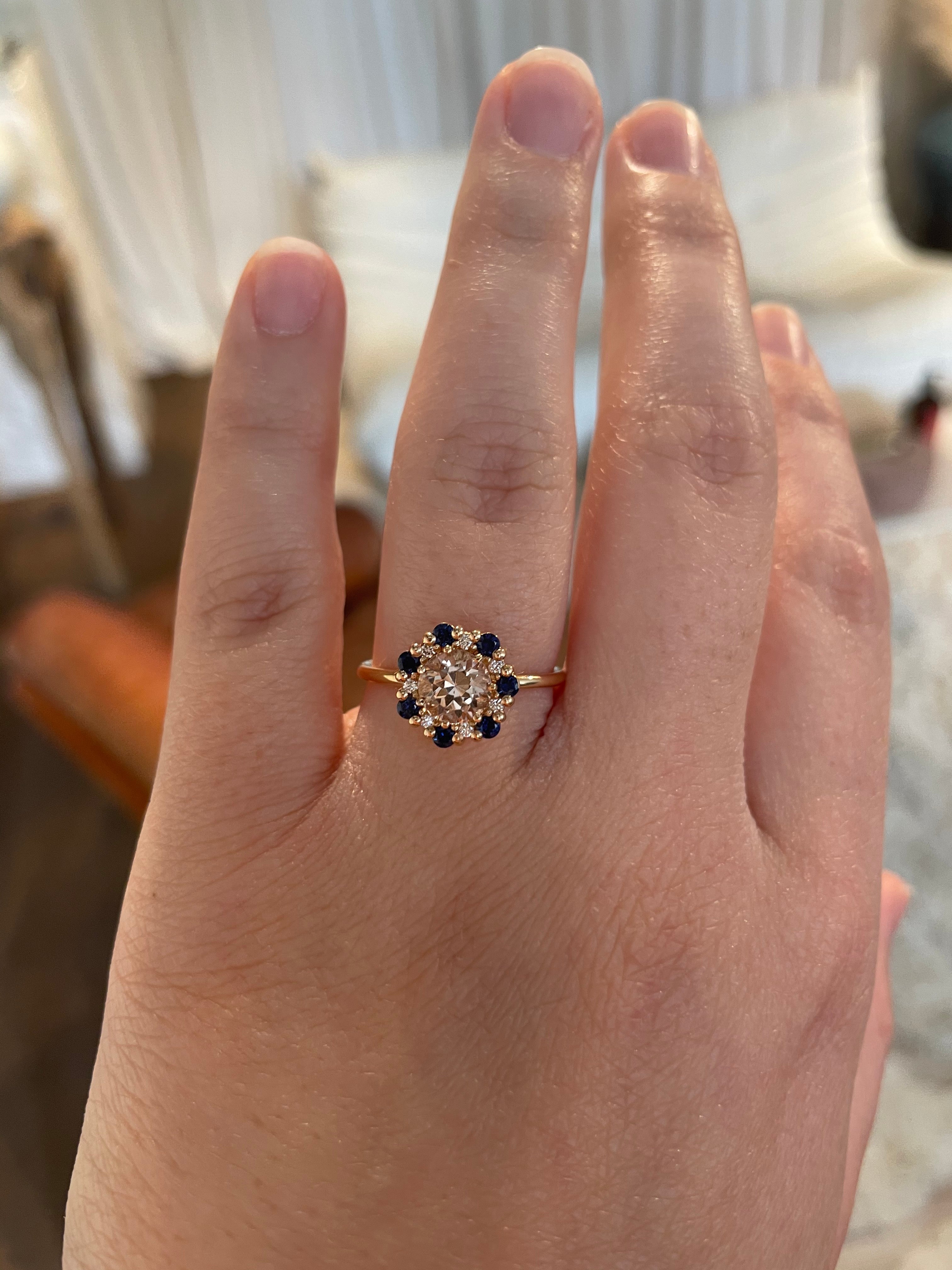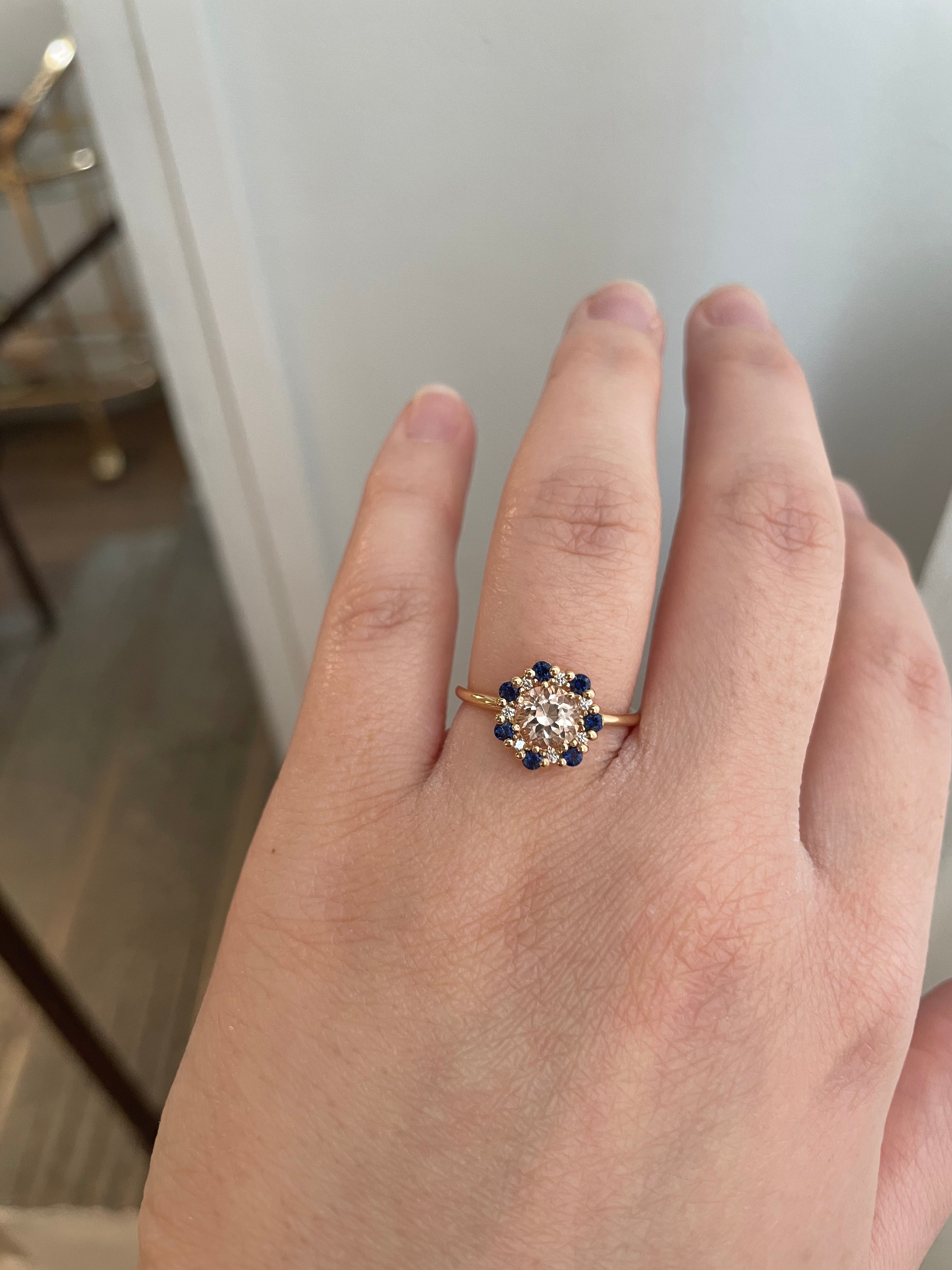 The champagne morganite measures 6 mm in diameter (approx 1.20 CT) and is surrounded by 14 smaller gemstones – seven dark blue sapphire brilliants and seven white diamond brilliants.
