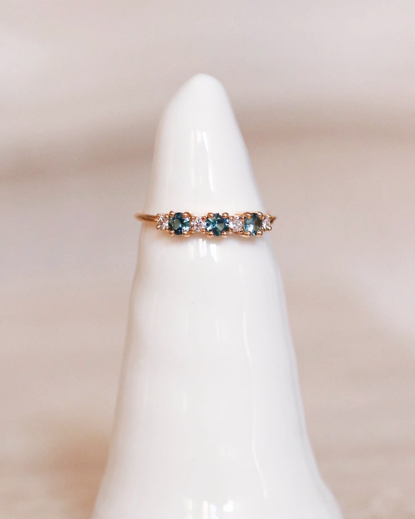 This beautiful version of Brigitte Ring features completely natural sea blue tourmalines.