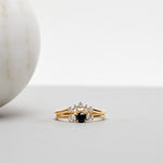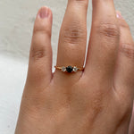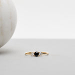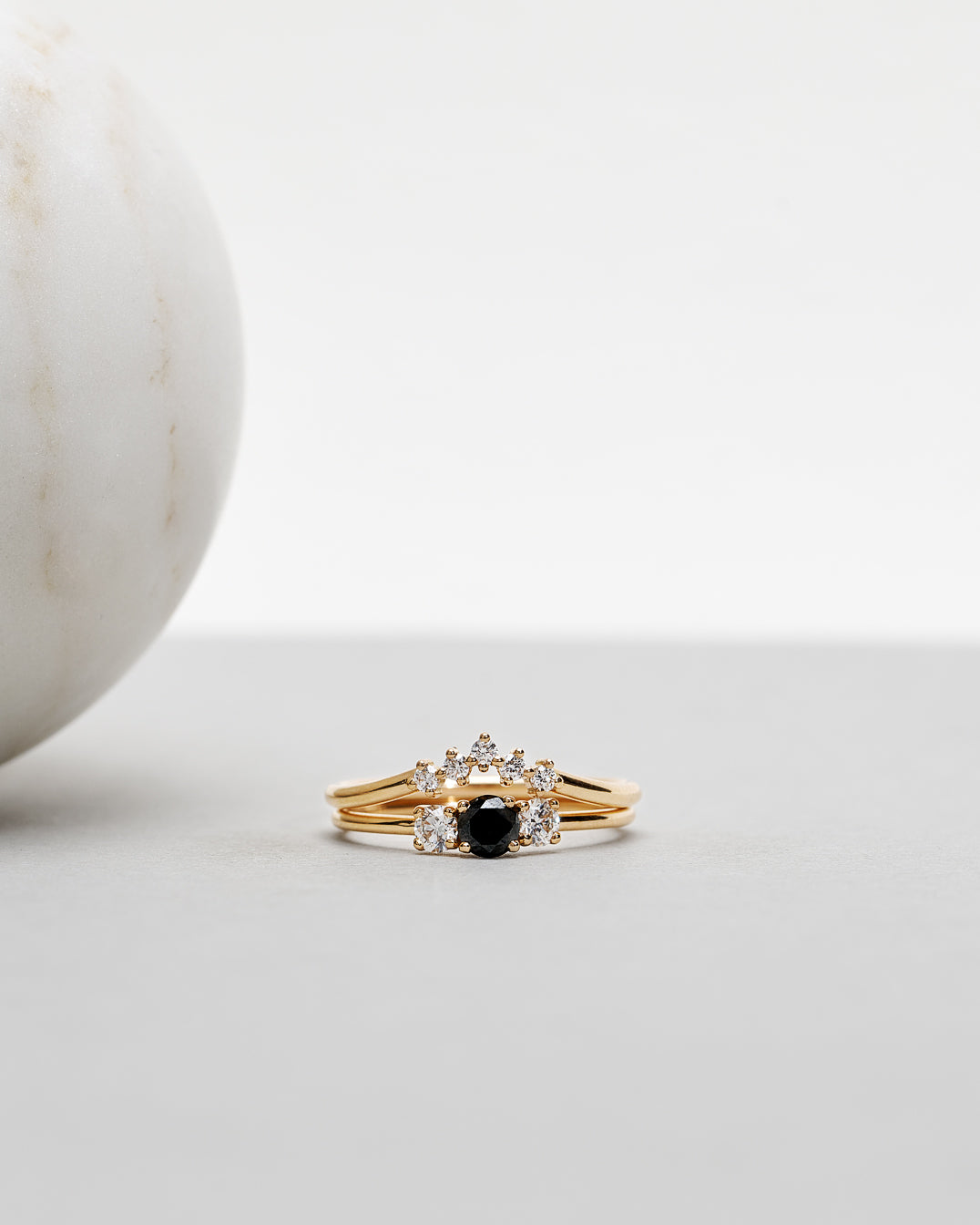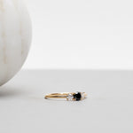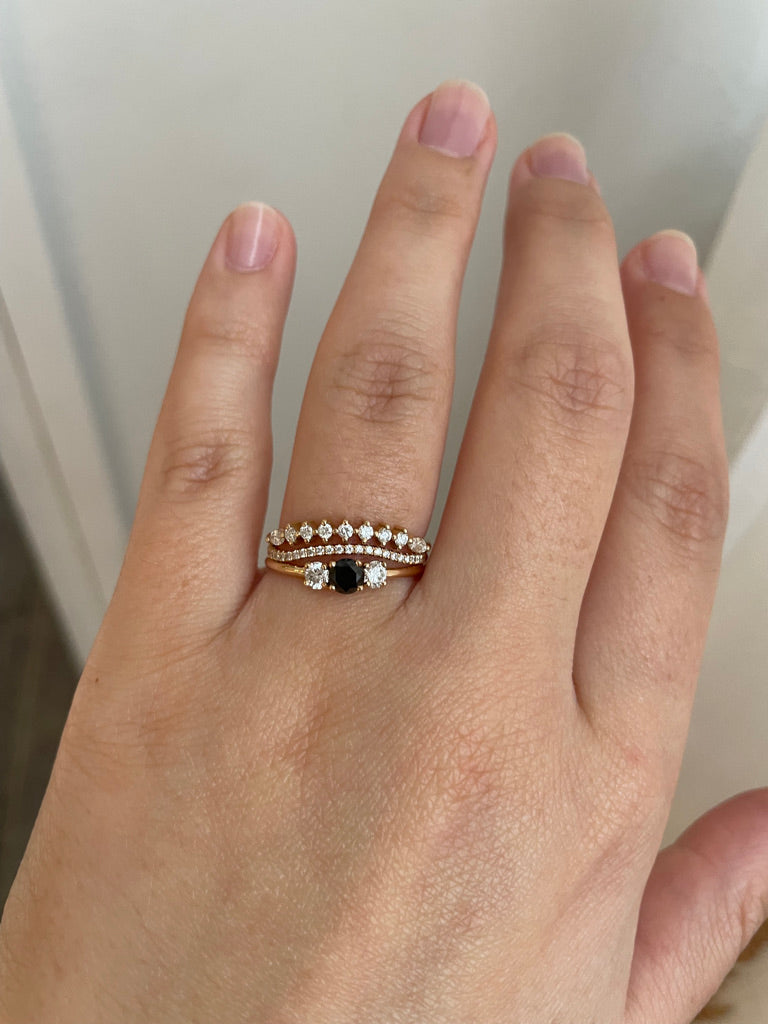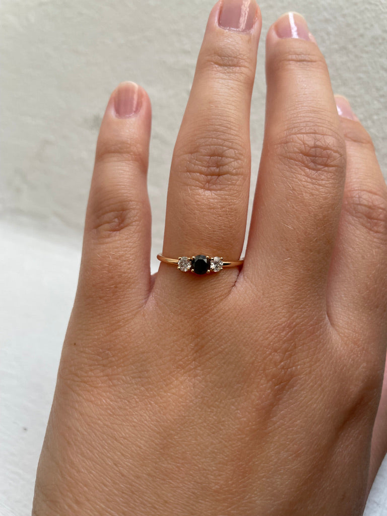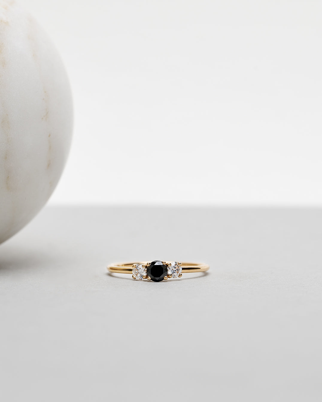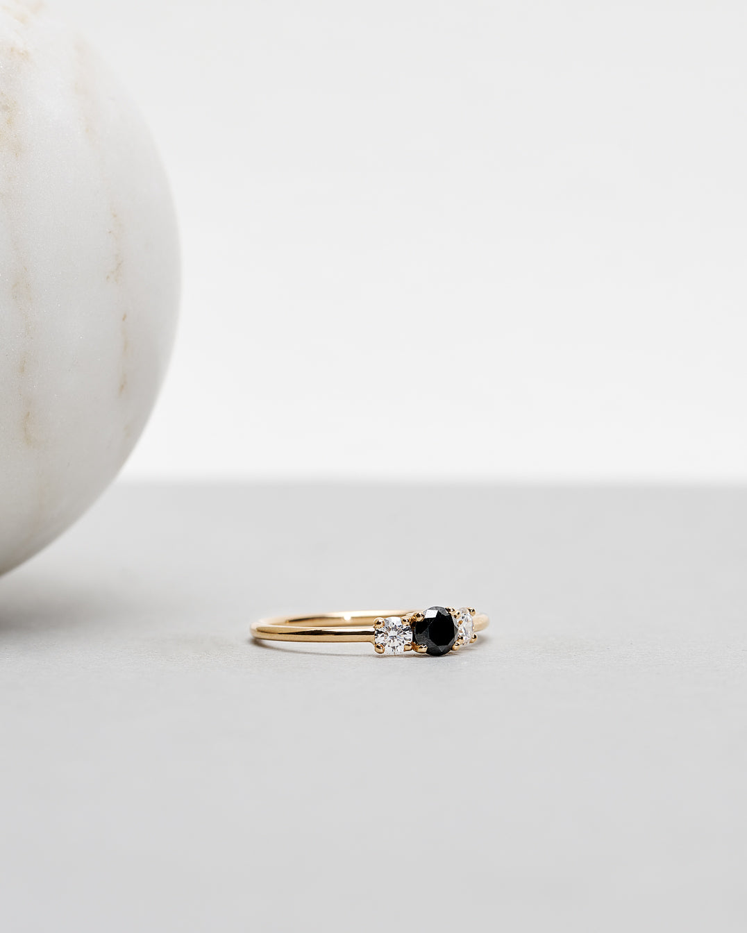 Edith Ring is a classic three-stone ring in a minimalist, modern design. Here in a stylish new color combination with black and white diamonds.