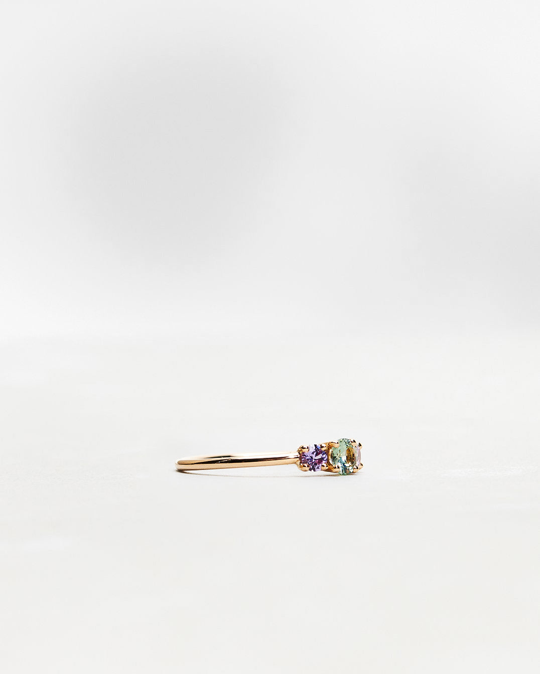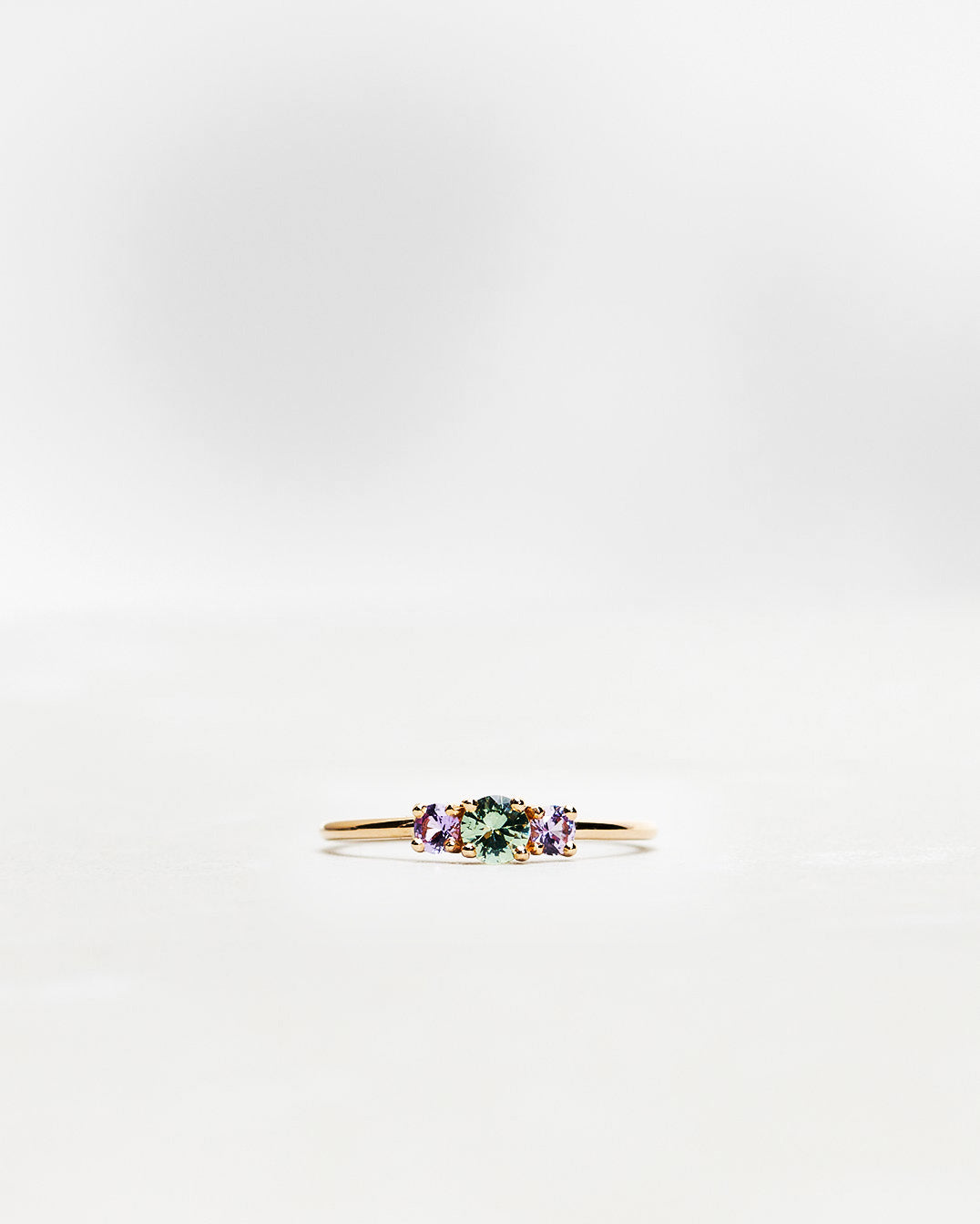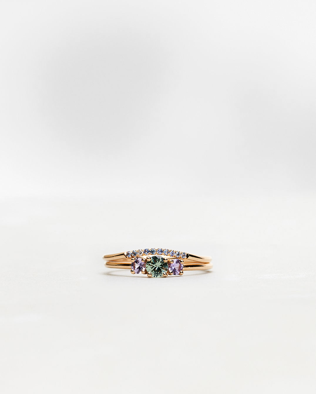 Edith Ring is one of our most loved rings. It's a classic three-stone ring in a minimalist, modern design. Here in a lovely new color combination with one olive green and two lavender sapphires.