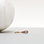One 4 mm (approx. 0.25 CT) Premium Portuguese-Cut Light Pink Morganite, Two 0.11 CT Champagne Diamonds and Two 0.04 CT Champagne Diamonds.