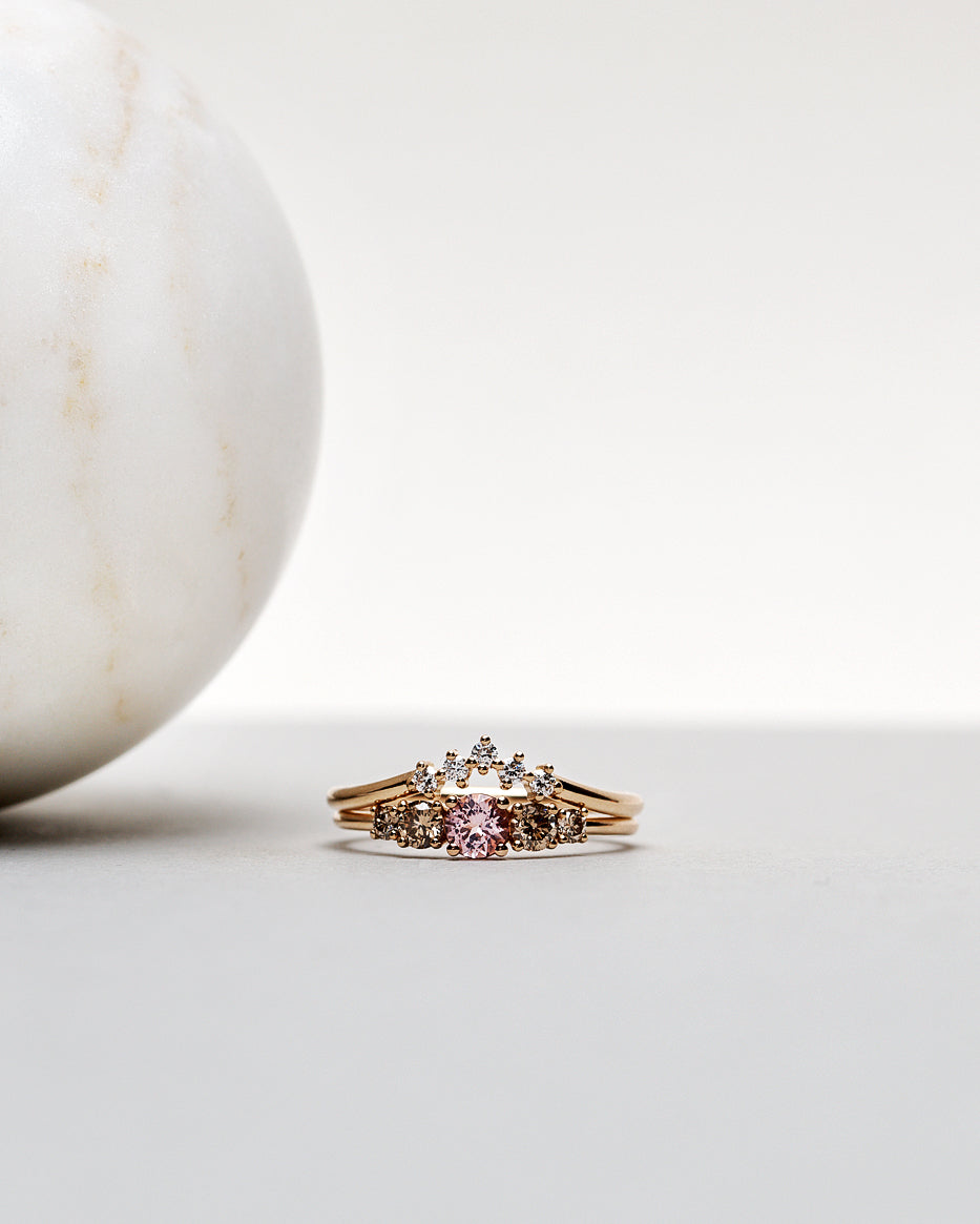 Elise Ring looks amazing alone on the ring finger. It also stacks beautifully with all curved bands.