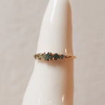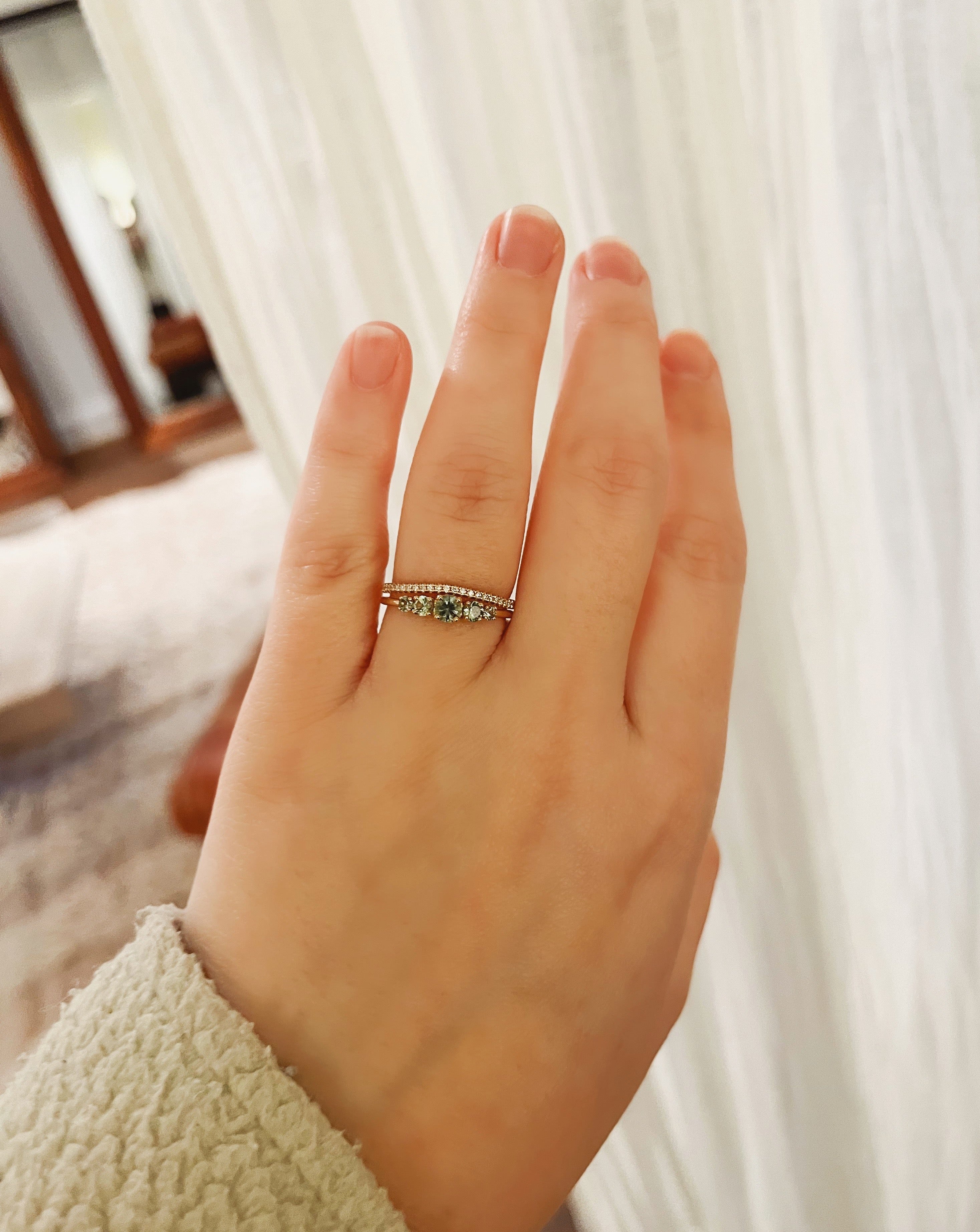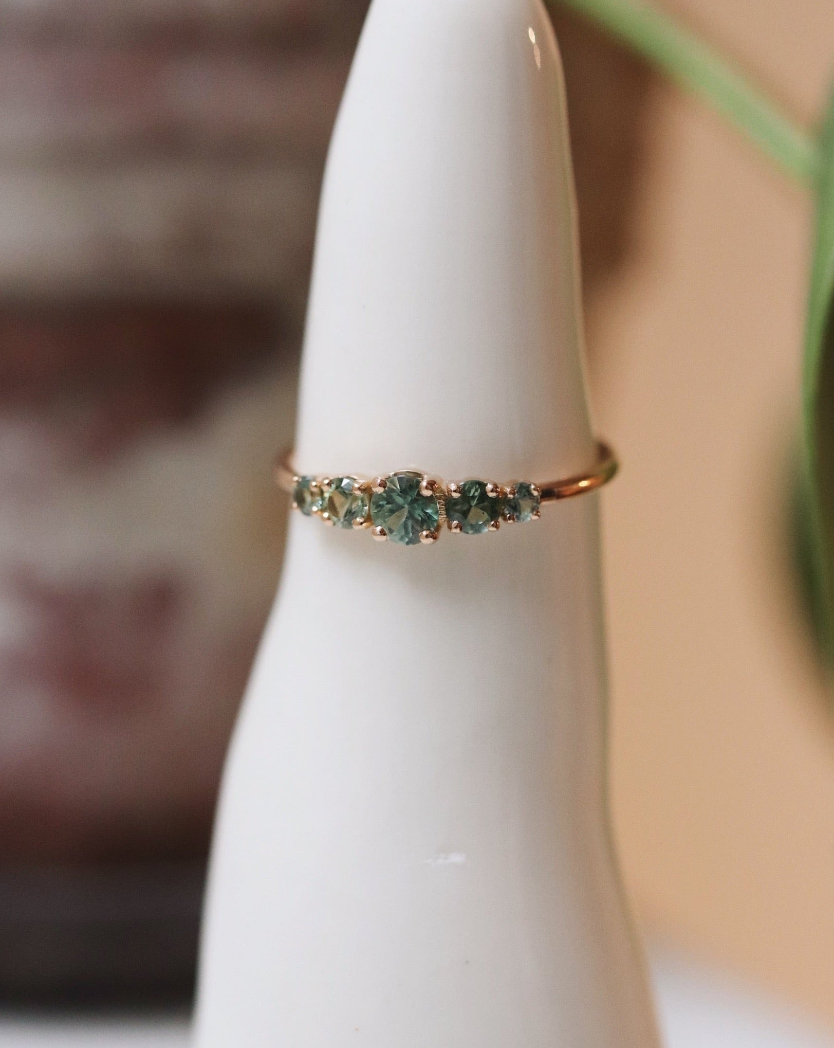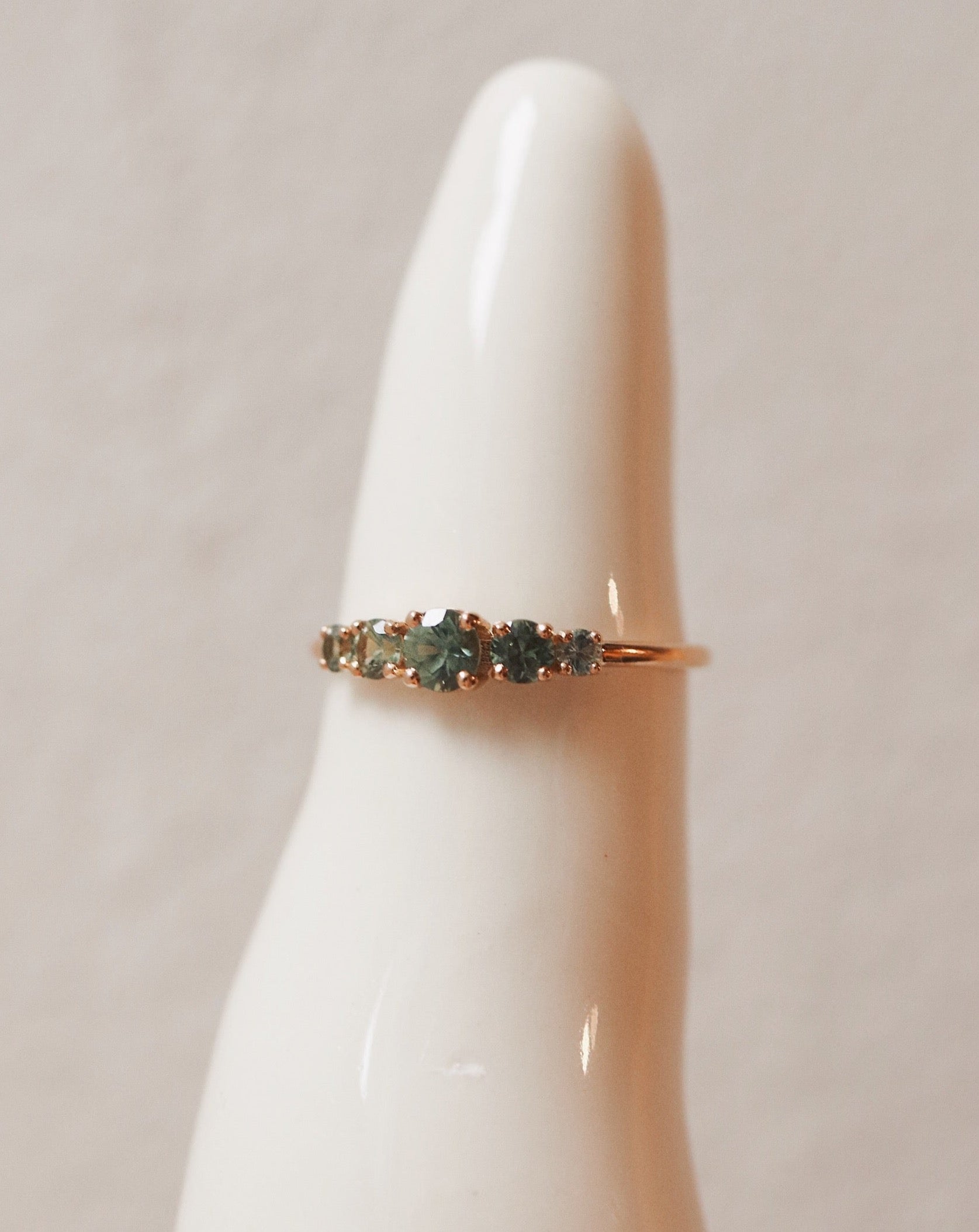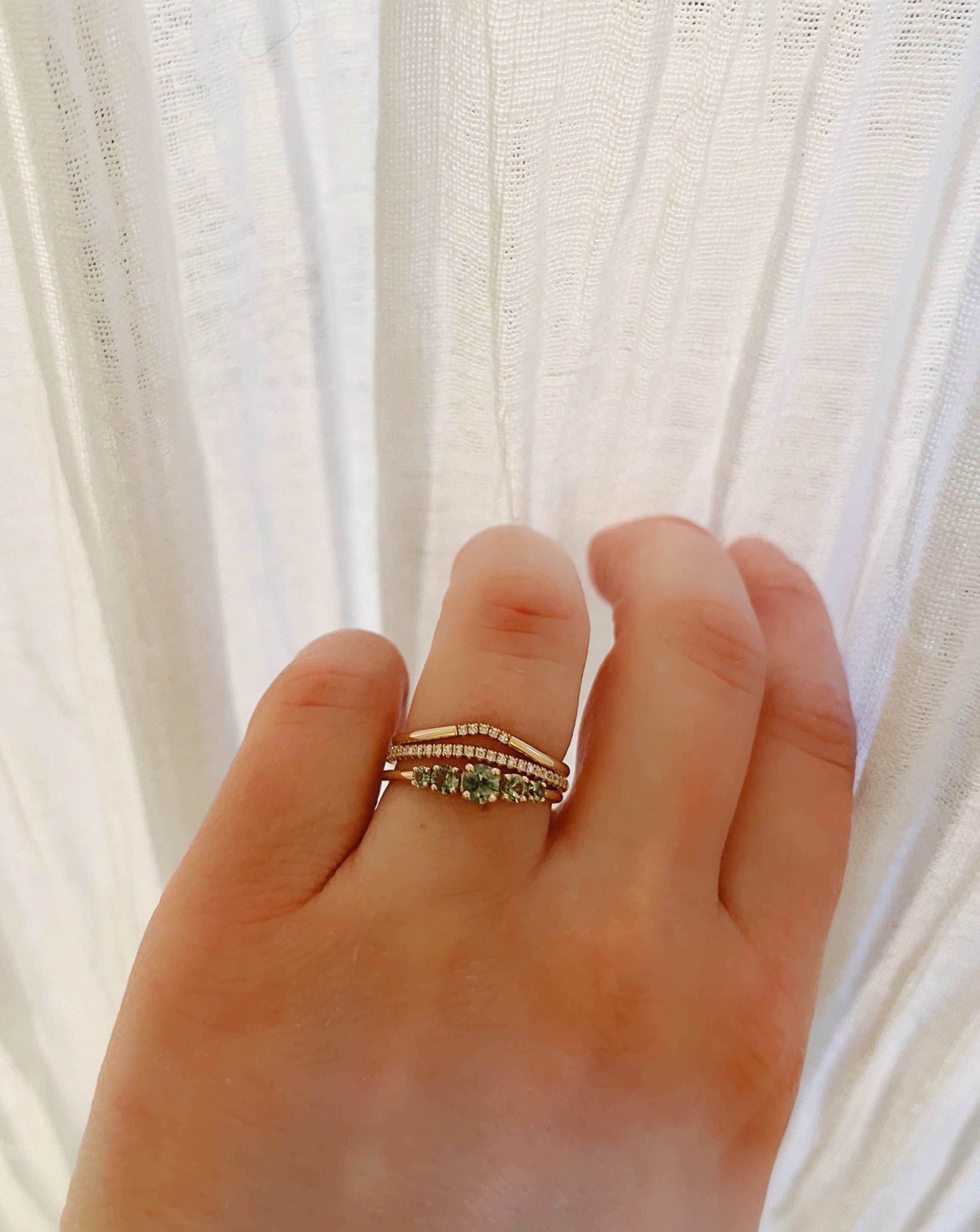 Here we've made the ring in a signature Mumbaistockholm sapphire color, our popular olive green shade. These rare olive green sapphires add a beautiful softness that goes perfectly with Elise Ring. A dreamy pairing that will look beautiful in any jewelry collection!