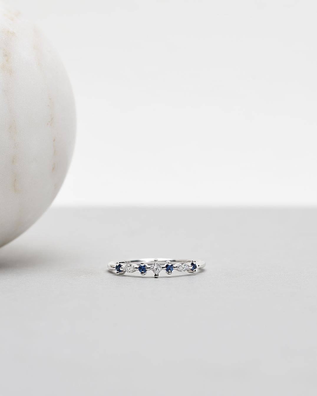 Hilda Ring has a lovely vintage feel. The design includes squared princess cut, boat-shaped marquise cut and round brilliant cut gemstones. This white gold version features a combination of blue sapphires and white diamonds.