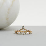The Hilda Ring is a unique ring with a lovely vintage feel. The design includes three different stone shapes: Squared Princess cut, boat-shaped Marquise cut and round Brilliant cut gemstones.