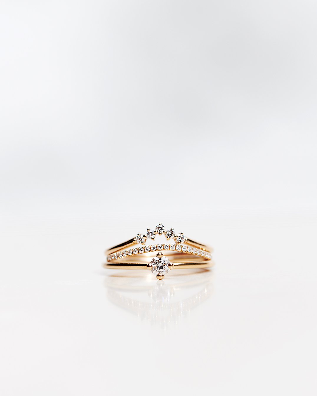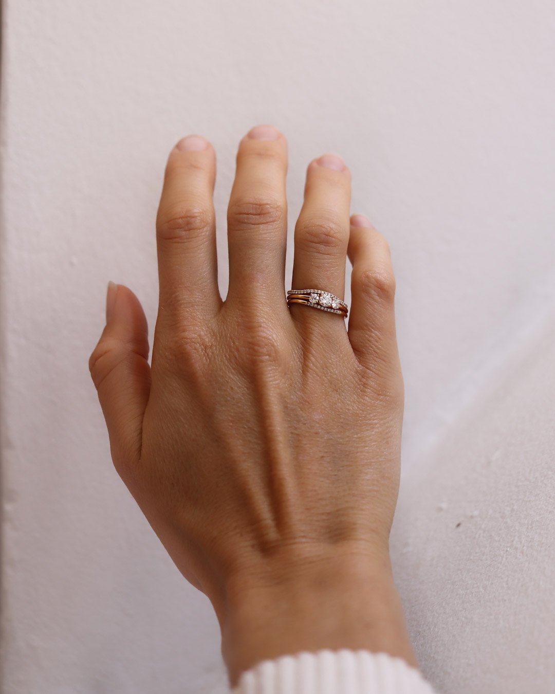 Jade Petite Wave Half Ring was first made to be stacked with Edith Ring (0.47 CT and 0.62 CT) and Greta Ring (0.57 CT and 0.72 CT), but it stacks just as beautifully with, for example: