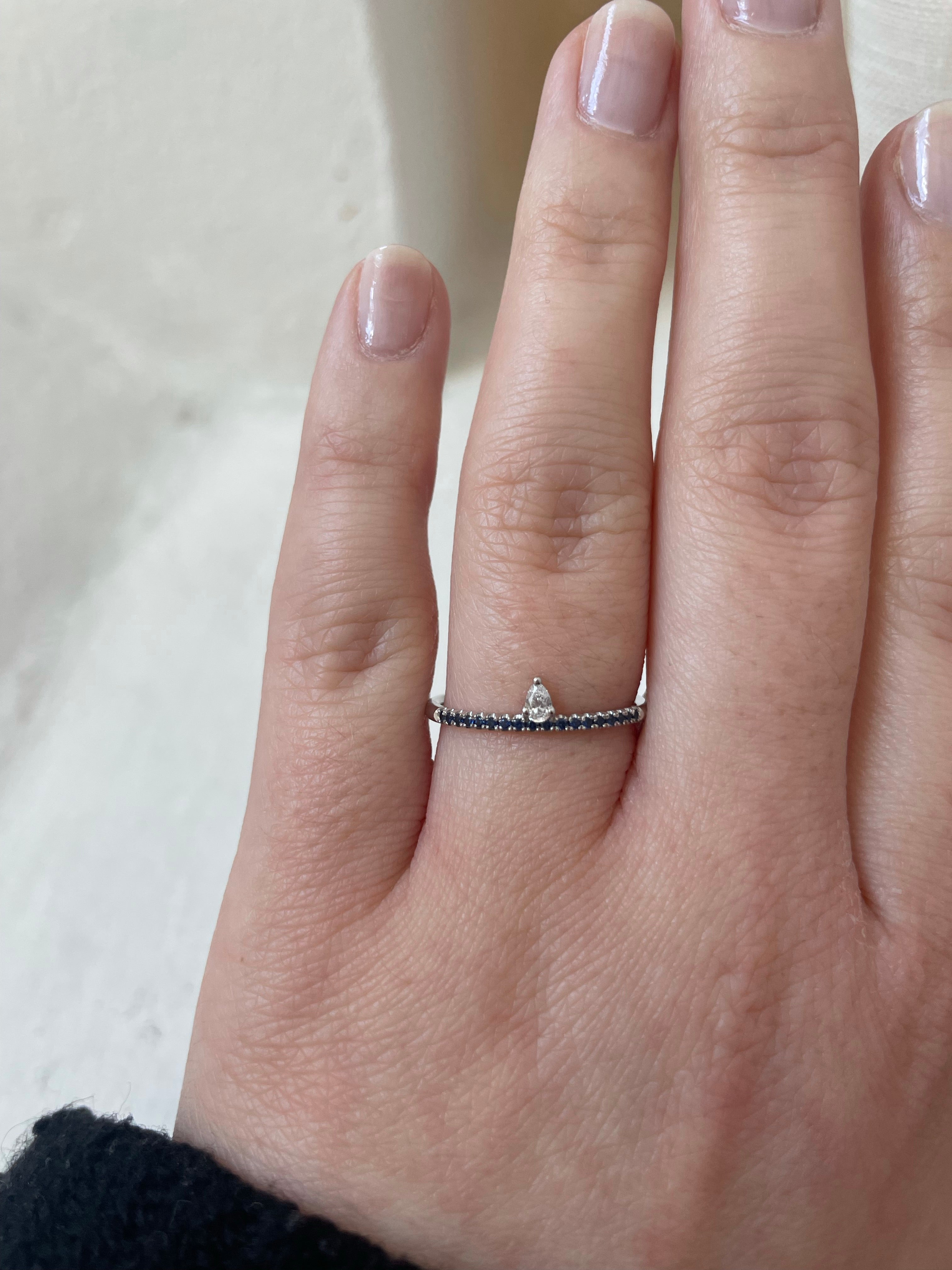 Finished: Lily Tiny Diamond Drop Ring in White Gold with Dark Blue Sapphire Row