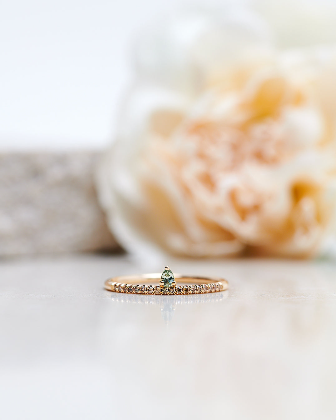 Finished: Lily Tiny Drop Ring with an Olive Green Sapphire Drop and Chocolate Diamond Row