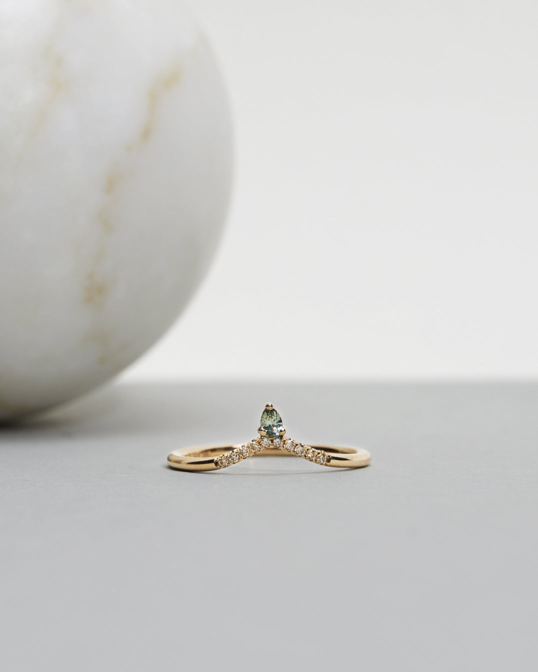 Green sapphires come in many hues ranging from dull to vivid, light to dark. In this ring we've used a lovely soft, olive green shade. This shade of green is very difficult to find, especially in this beautiful drop shape.