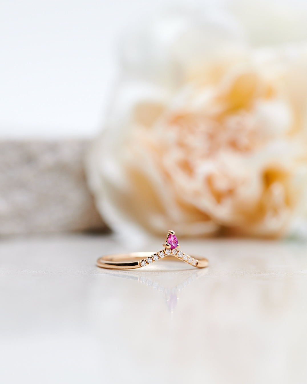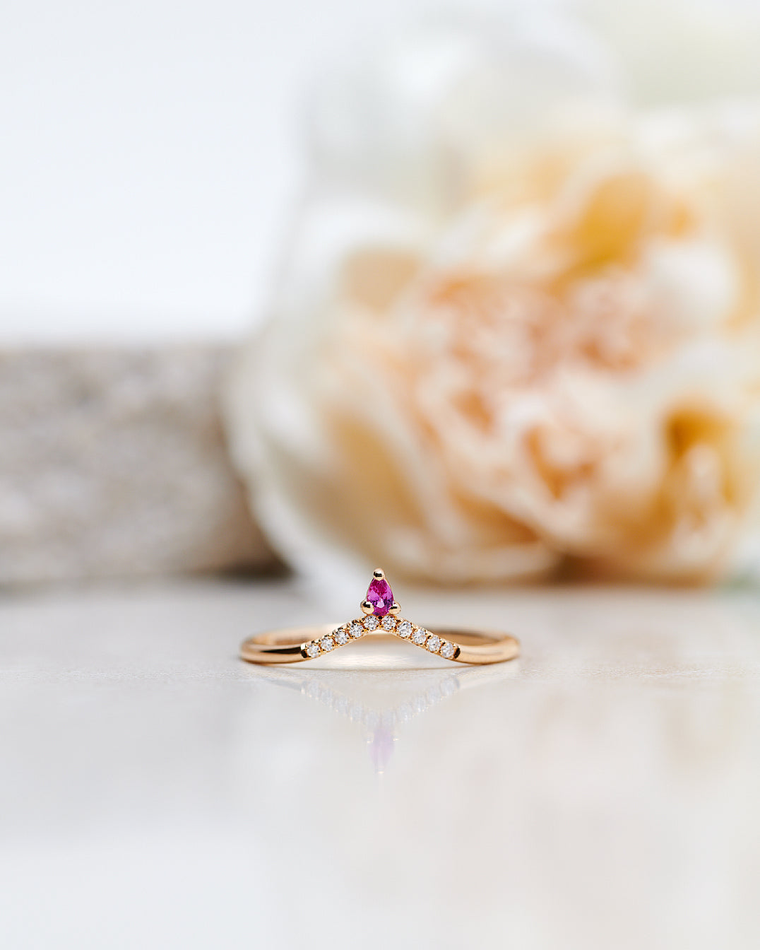 In this version of Lily Top Drop Sparkle Ring we've used a hot pink sapphire drop combined with a diamond sparkle to really enhance the colour of the sapphire.