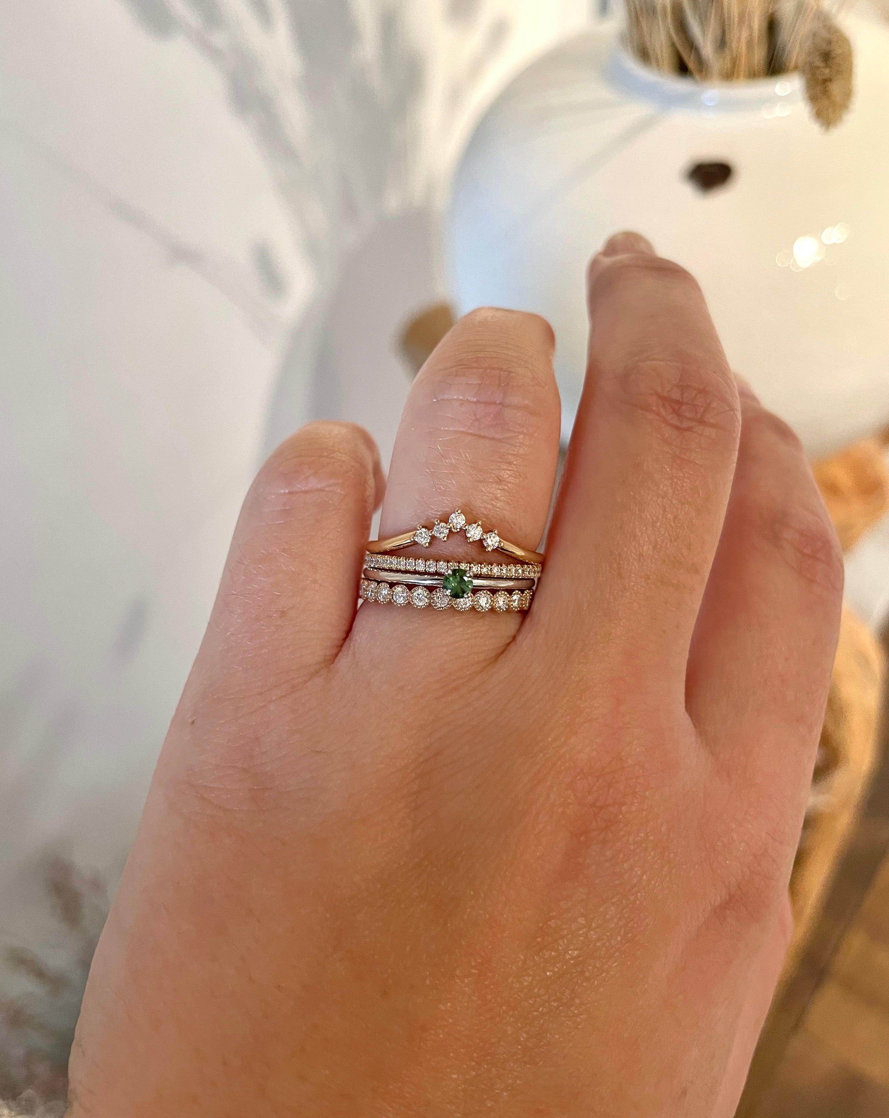 This ring looks just as beautiful alone as in a stack. Despite its low setting, it stacks wonderfully with most other rings from the collection.