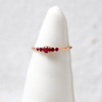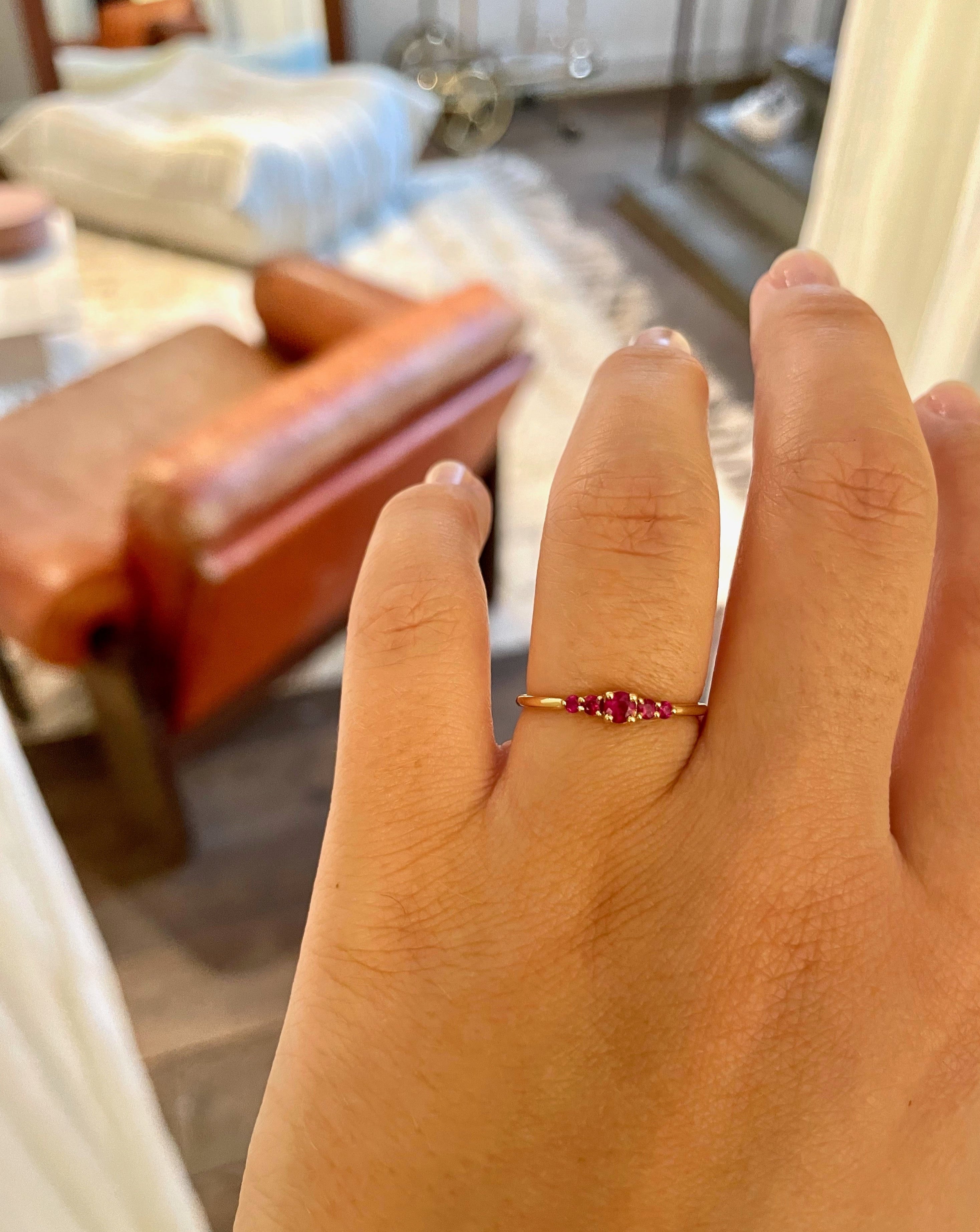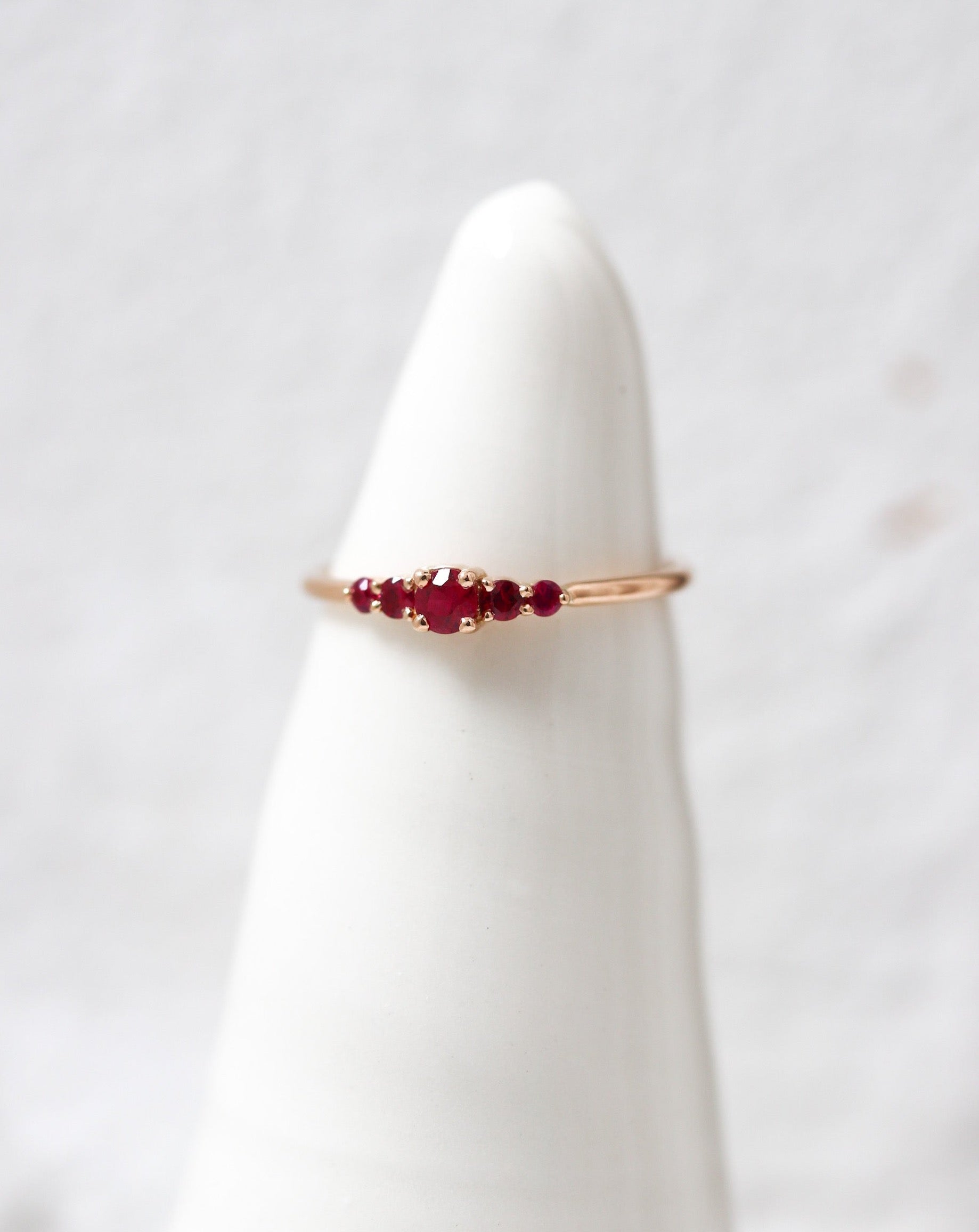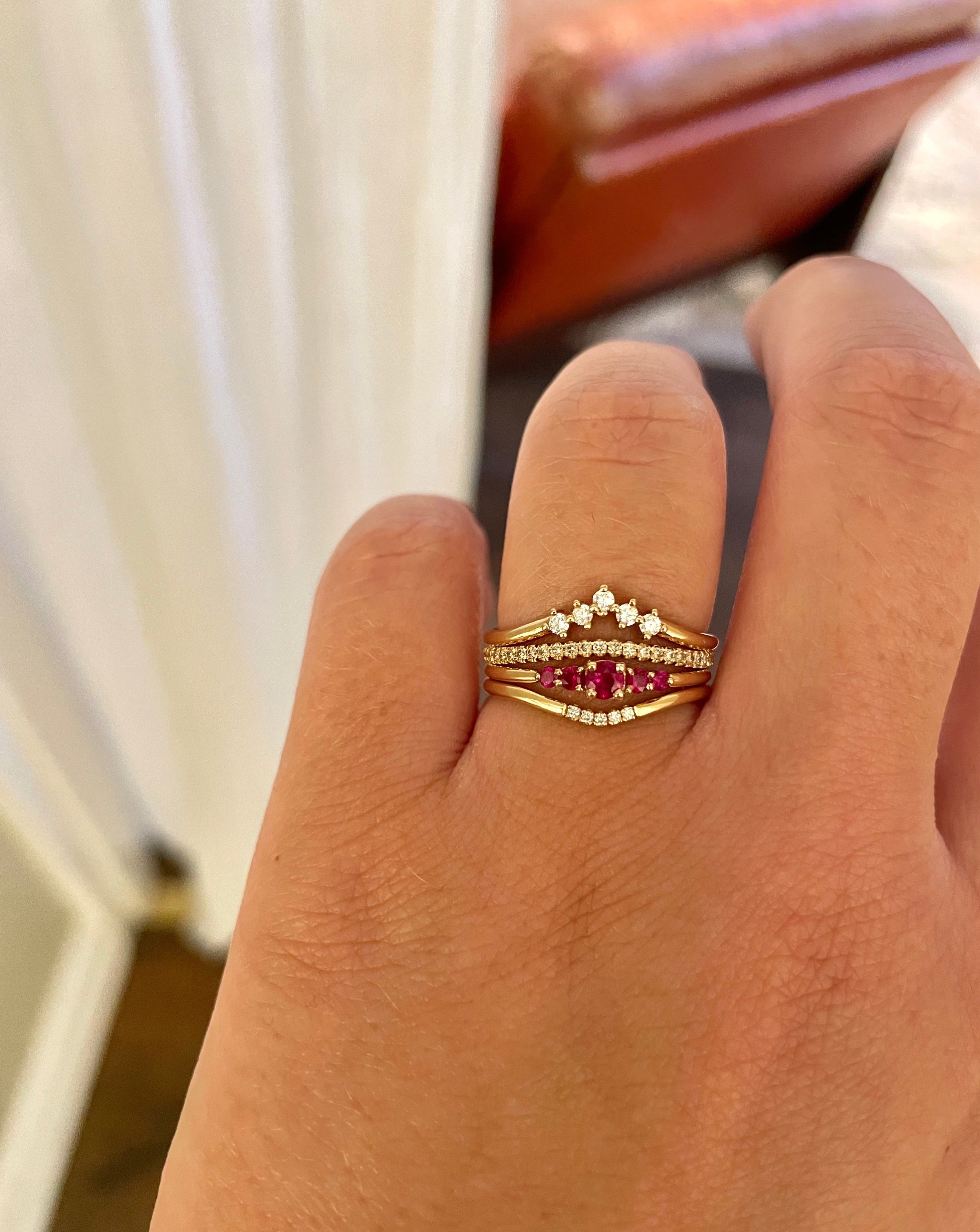 Thanks to its simple design, Mini Elise Ring is perfect for every occasion. It stacks beautifully to all curved bands, which makes it versatile in a stack. We have added red rubies to this ring to make it a real show-stopper!