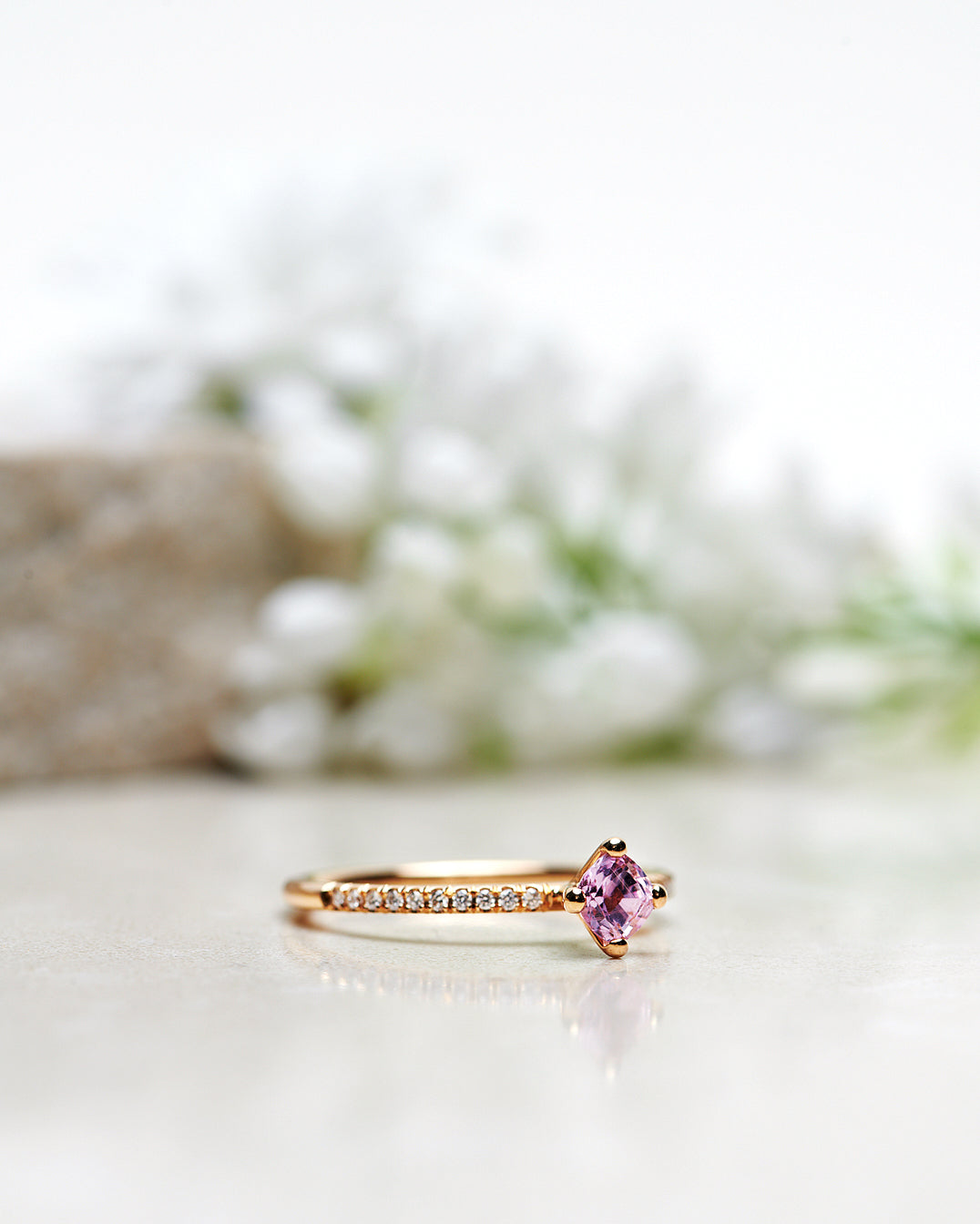 - Not At All Tiny Sparkle Ring with a Squared Cushion Cut Pink Sapphire and Diamond Sparkle