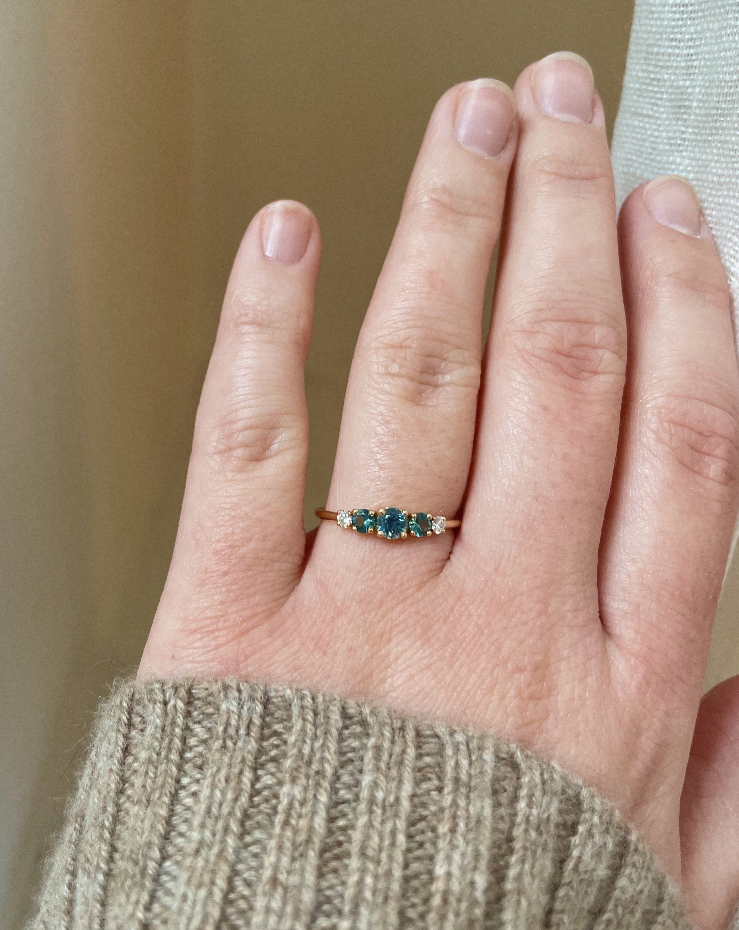 This model is particularly suited for a custom color combination of its five gemstones. Here we've used beautiful sea blue gemstones and sparkling diamonds to create a stunning one-of-a-kind combination. 🌊